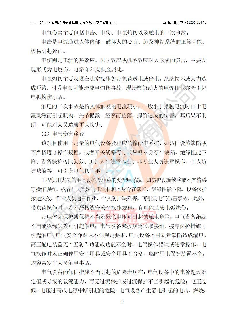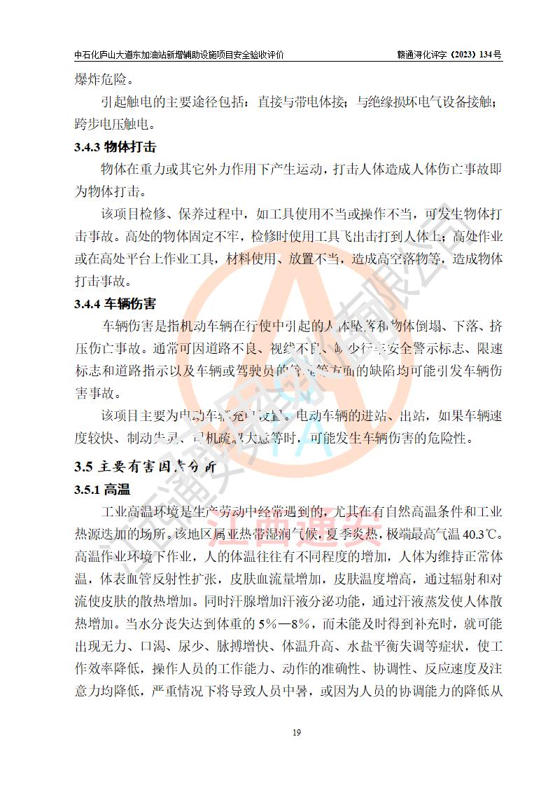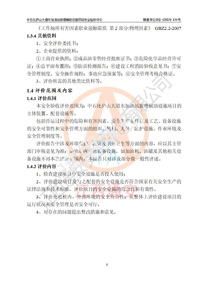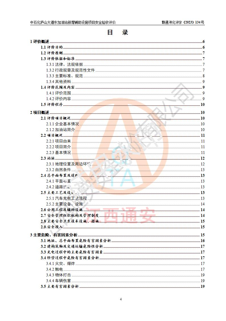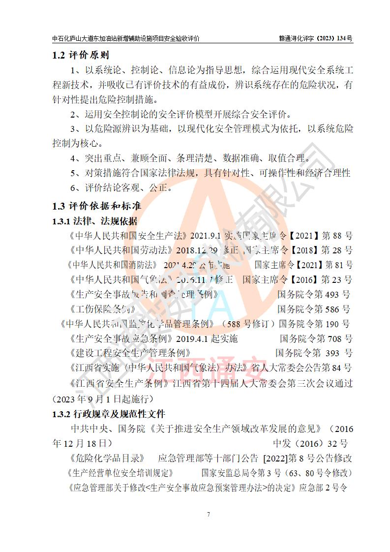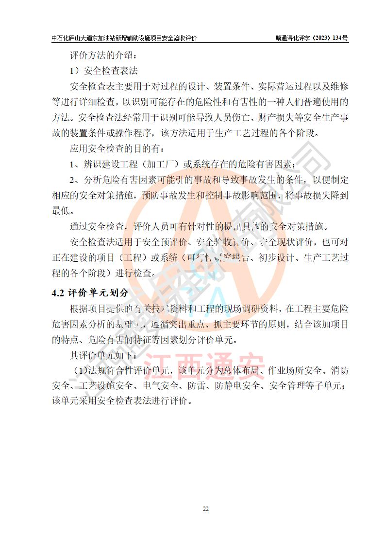 評價結(jié)論 | 中國石化銷售股份有限公司江西九江濂溪石油分公司廬山大道東加油站新增輔助設(shè)施項目涉及的安全條件、安全生產(chǎn)條件、安全生產(chǎn)管理符合《電動汽車充電站設(shè)計規(guī)范》、《汽車加油加氣加氫站技術(shù)標(biāo)準(zhǔn)》等**有關(guān)法規(guī)、標(biāo)準(zhǔn)、規(guī)范要求,能滿足經(jīng)營單位的安全條件,具備項目竣工驗收的條件。 | |||
