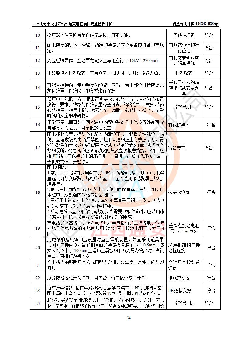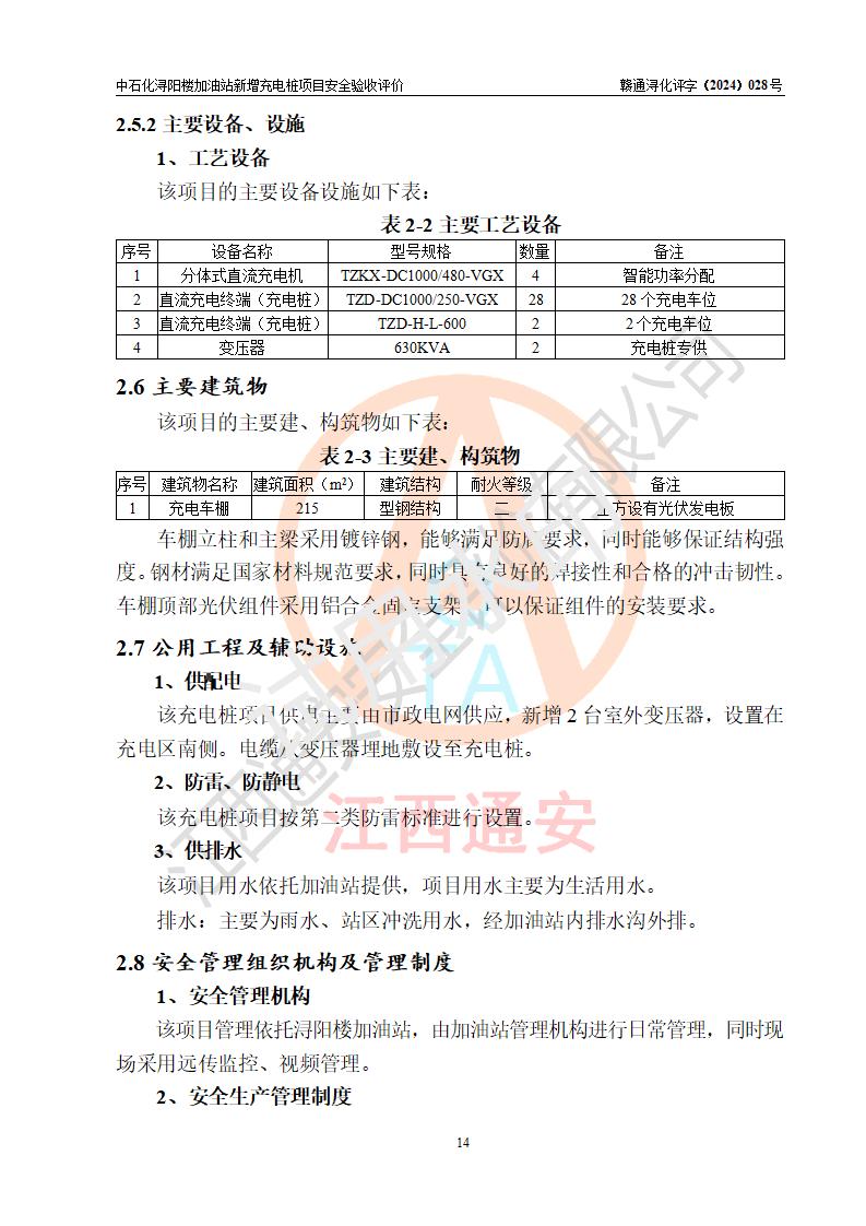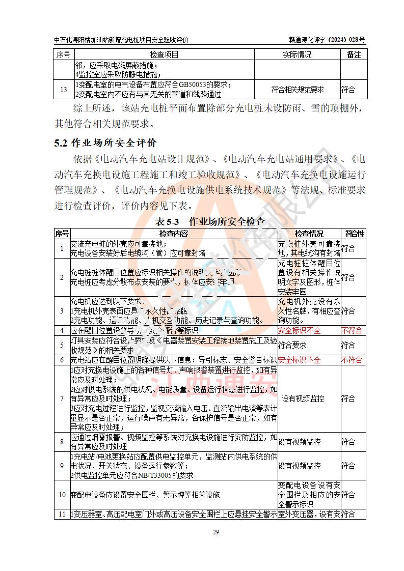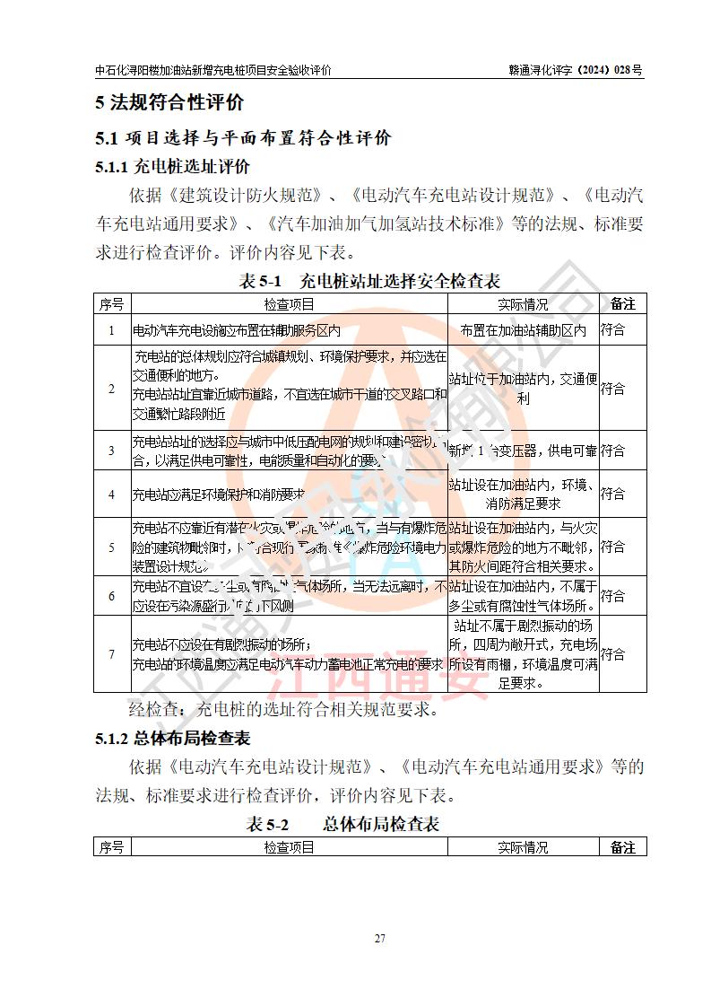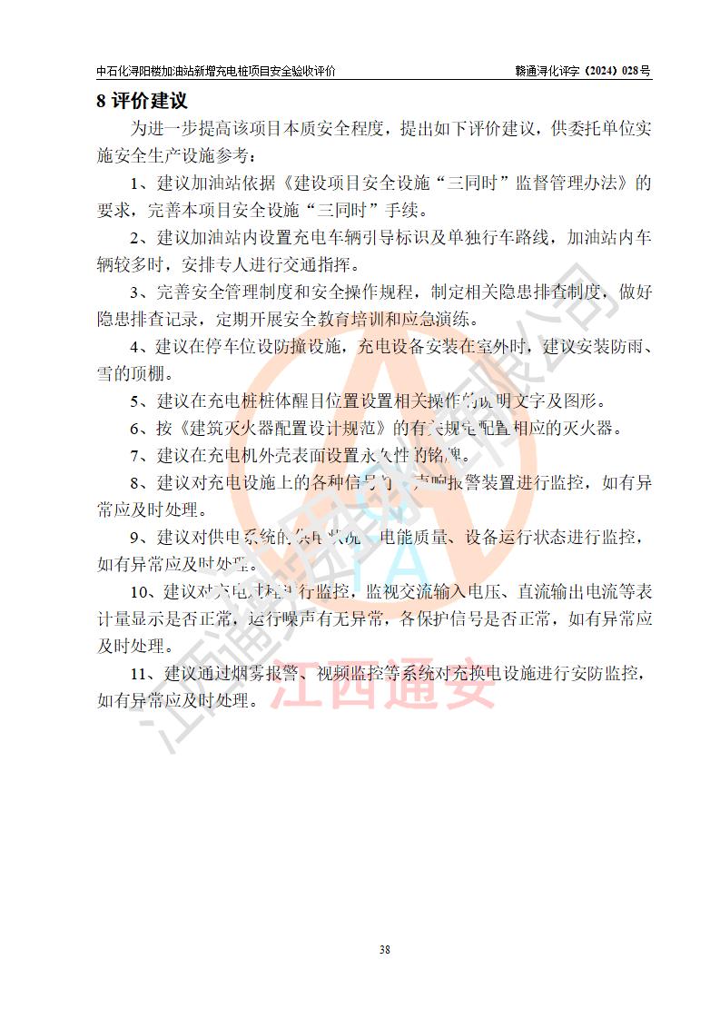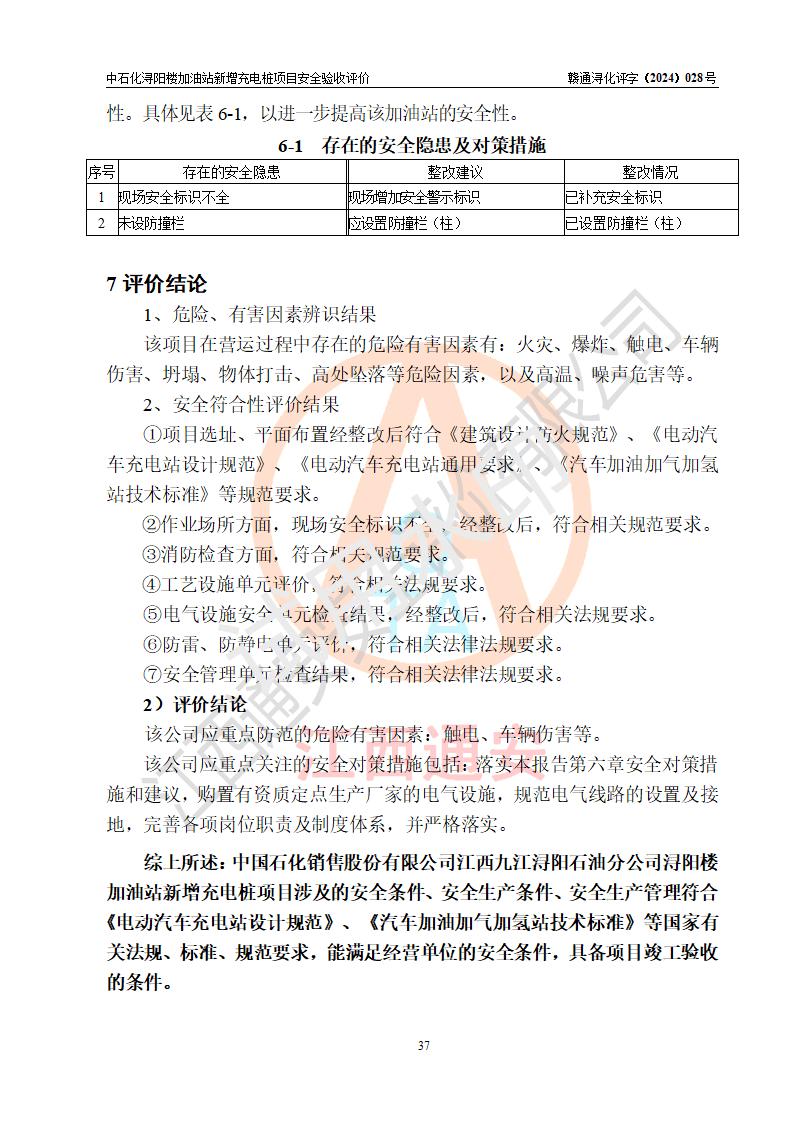 評價結論 | 中國石化銷售股份有限公司江西九江潯陽石油分公司潯陽樓加油站新增充電樁項目涉及的安全條件、安全生產條件、安全生產管理符合《電動汽車充電站設計規(guī)范》、《汽車加油加氣加氫站技術標準》等**有關法規(guī)、標準、規(guī)范要求,能滿足經營單位的安全條件,具備項目竣工驗收的條件。 | |||