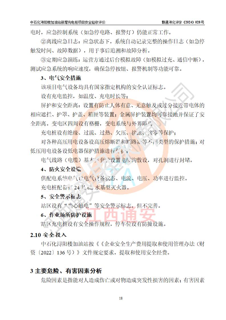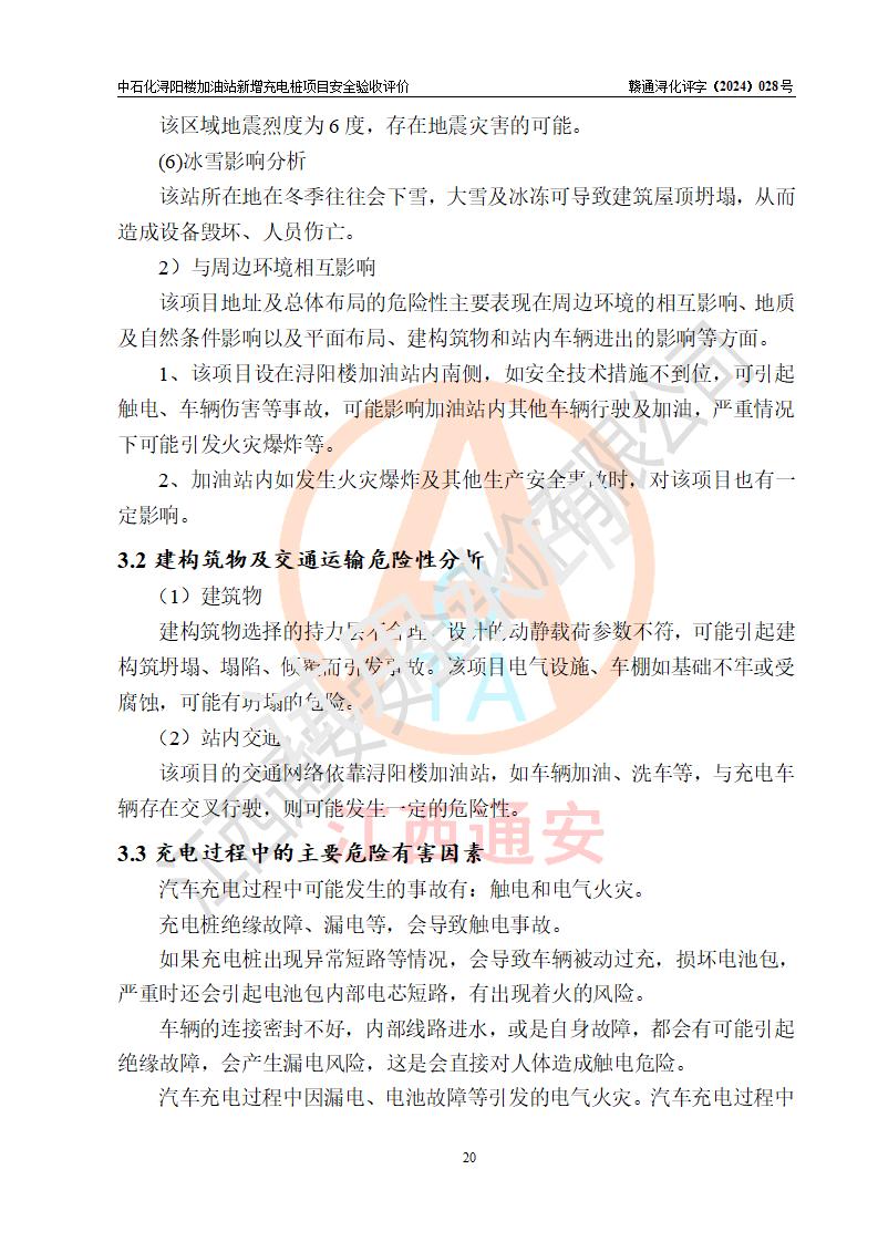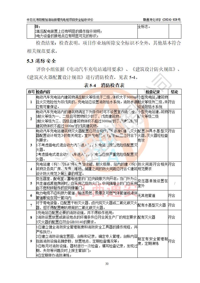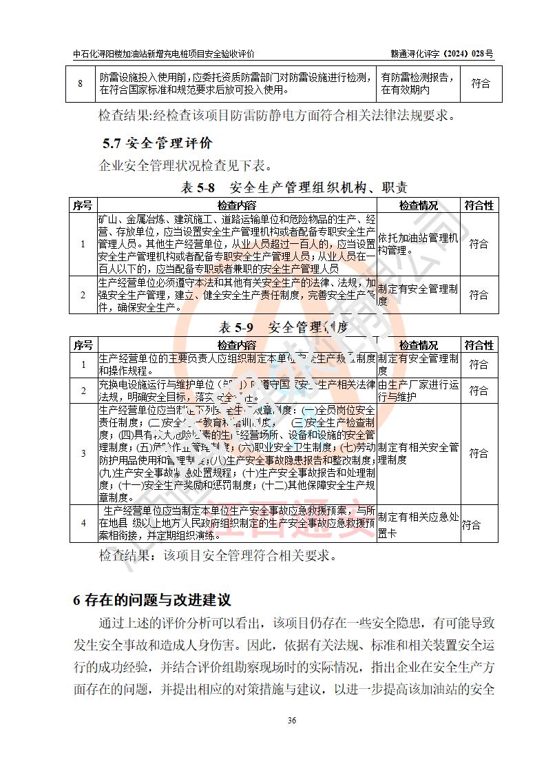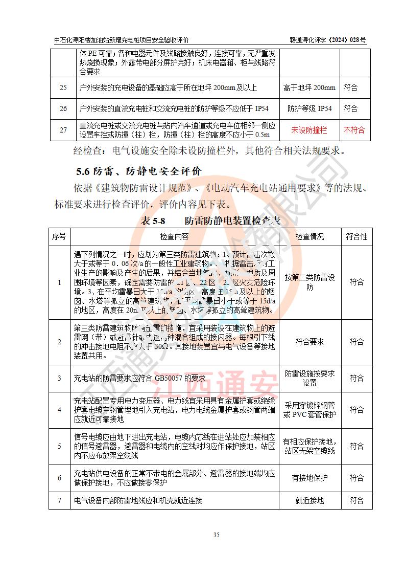 評價結論 | 中國石化銷售股份有限公司江西九江潯陽石油分公司潯陽樓加油站新增充電樁項目涉及的安全條件、安全生產條件、安全生產管理符合《電動汽車充電站設計規(guī)范》、《汽車加油加氣加氫站技術標準》等**有關法規(guī)、標準、規(guī)范要求,能滿足經營單位的安全條件,具備項目竣工驗收的條件。 | |||