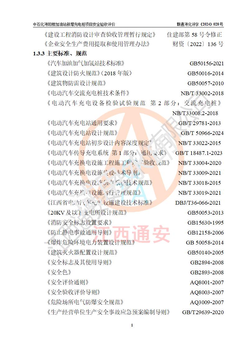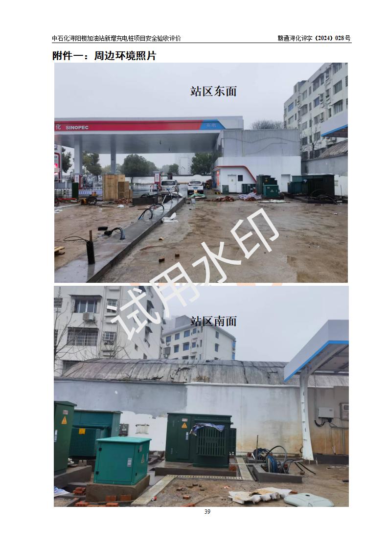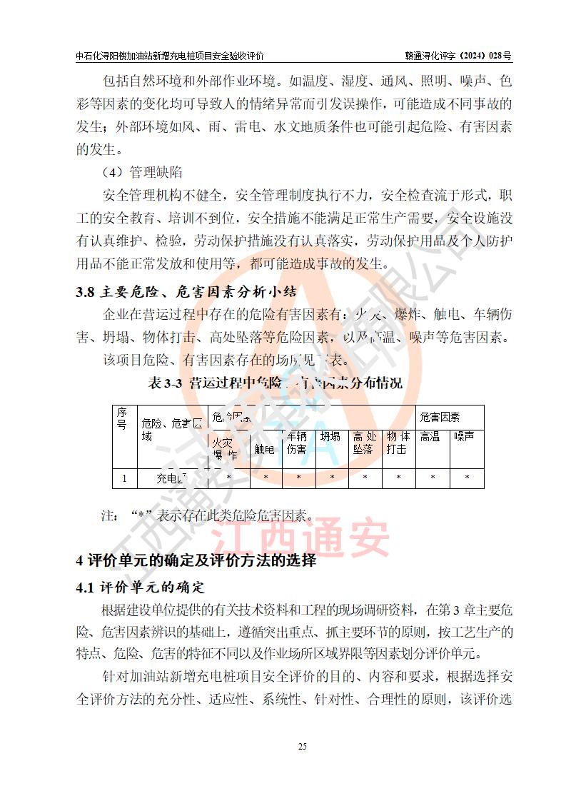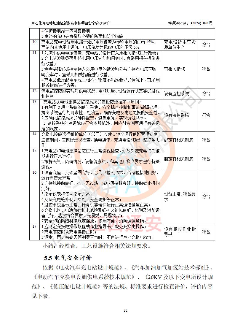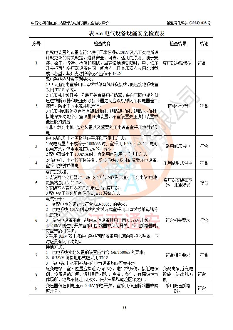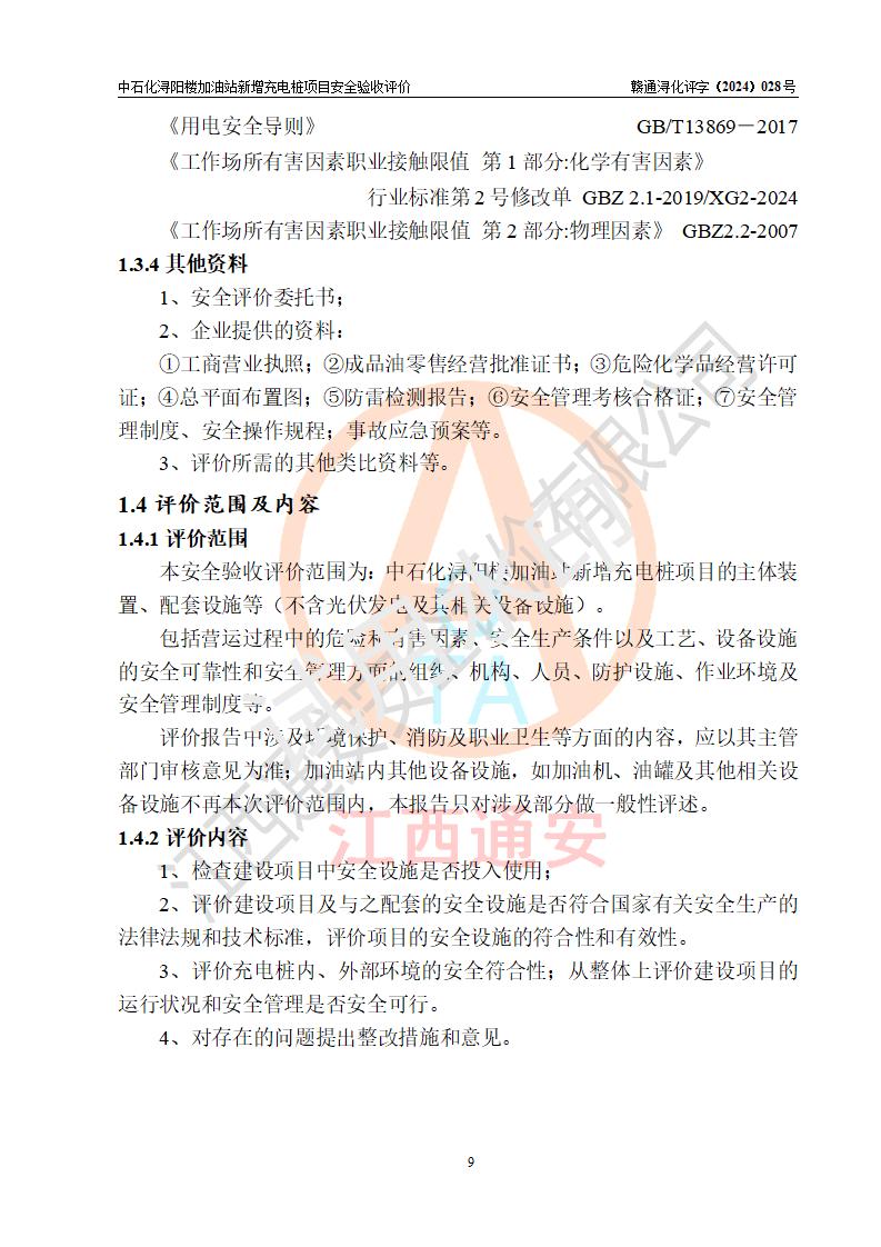 評價結論 | 中國石化銷售股份有限公司江西九江潯陽石油分公司潯陽樓加油站新增充電樁項目涉及的安全條件、安全生產條件、安全生產管理符合《電動汽車充電站設計規(guī)范》、《汽車加油加氣加氫站技術標準》等**有關法規(guī)、標準、規(guī)范要求,能滿足經營單位的安全條件,具備項目竣工驗收的條件。 | |||