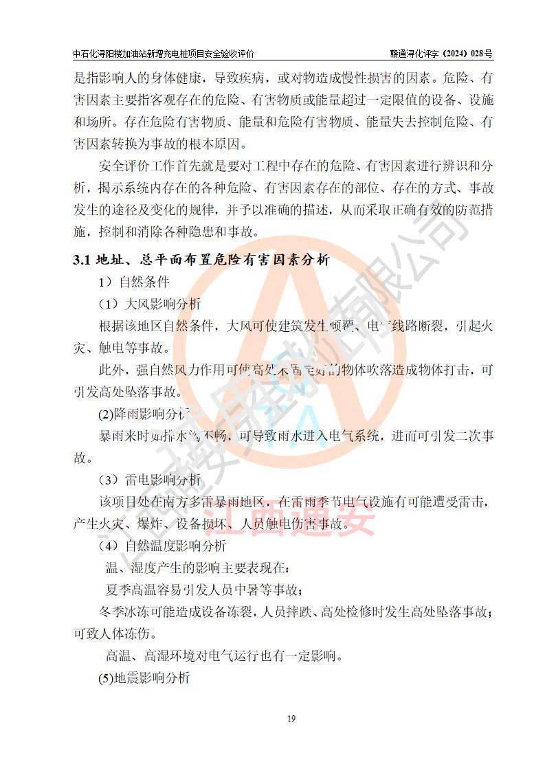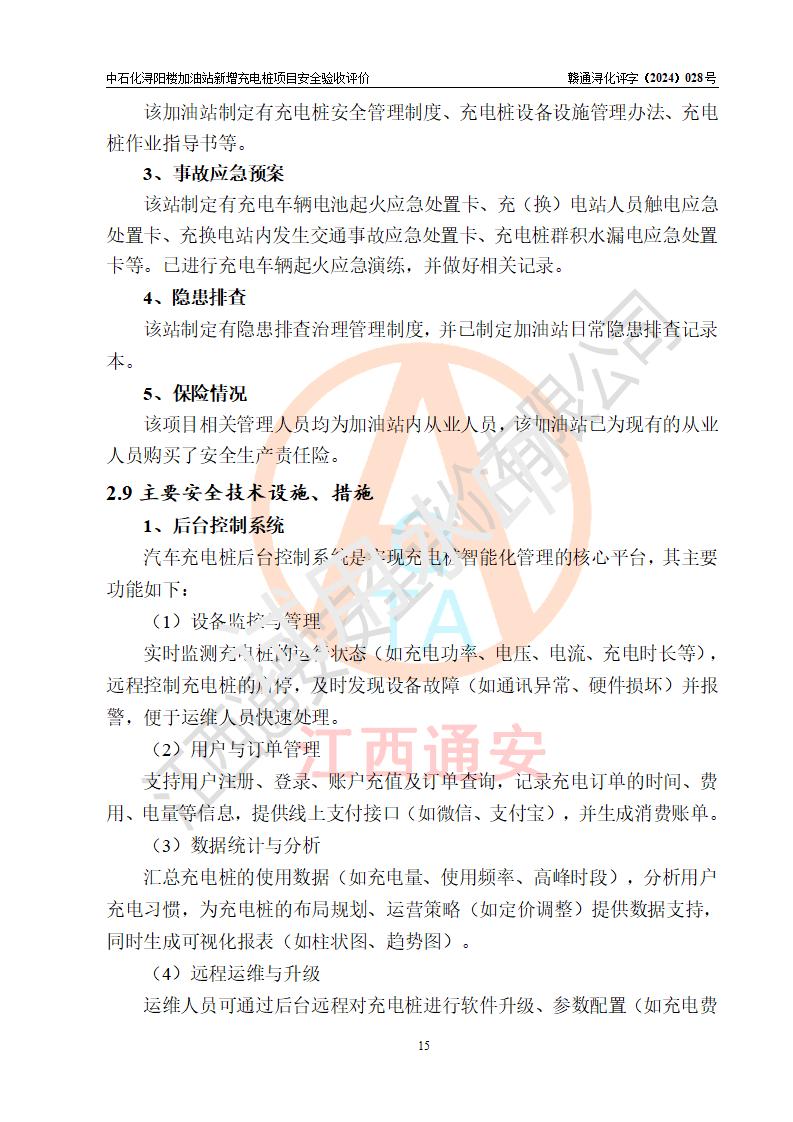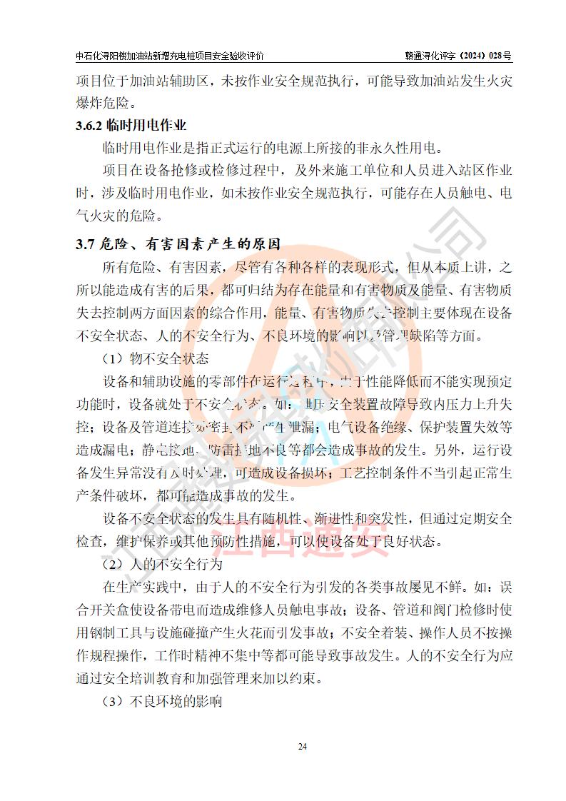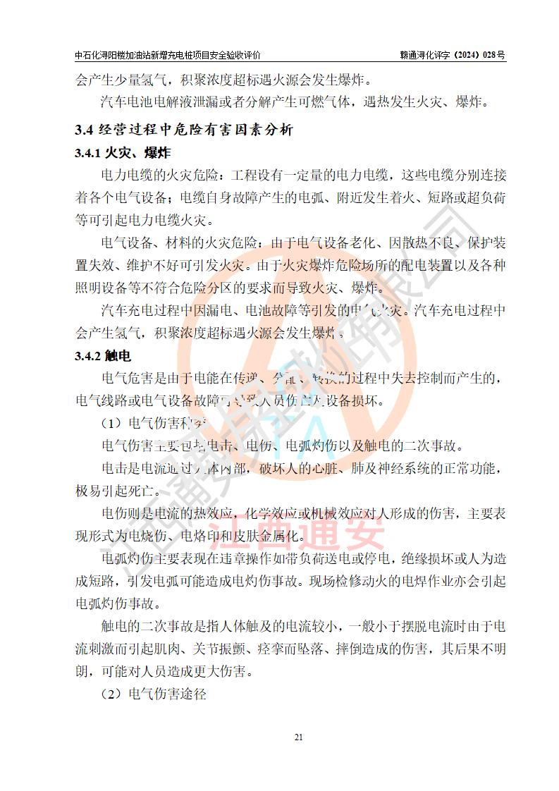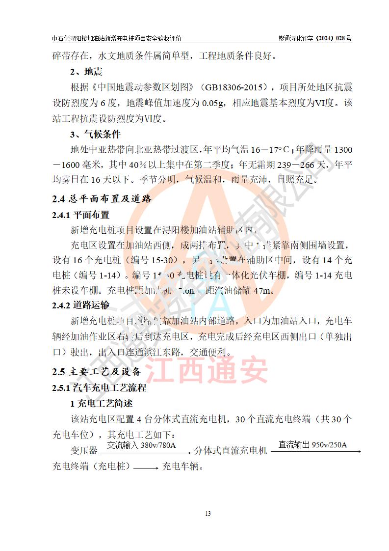評價結論 | 中國石化銷售股份有限公司江西九江潯陽石油分公司潯陽樓加油站新增充電樁項目涉及的安全條件、安全生產條件、安全生產管理符合《電動汽車充電站設計規(guī)范》、《汽車加油加氣加氫站技術標準》等**有關法規(guī)、標準、規(guī)范要求,能滿足經營單位的安全條件,具備項目竣工驗收的條件。 | |||