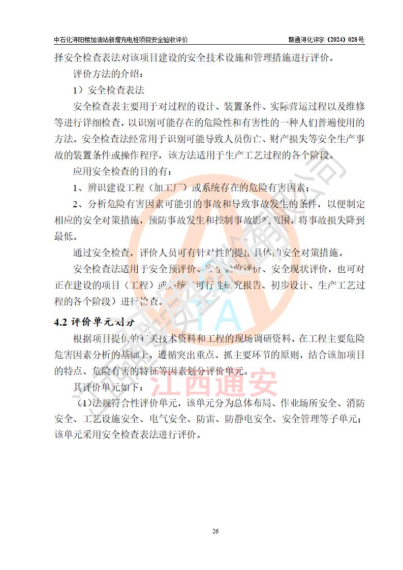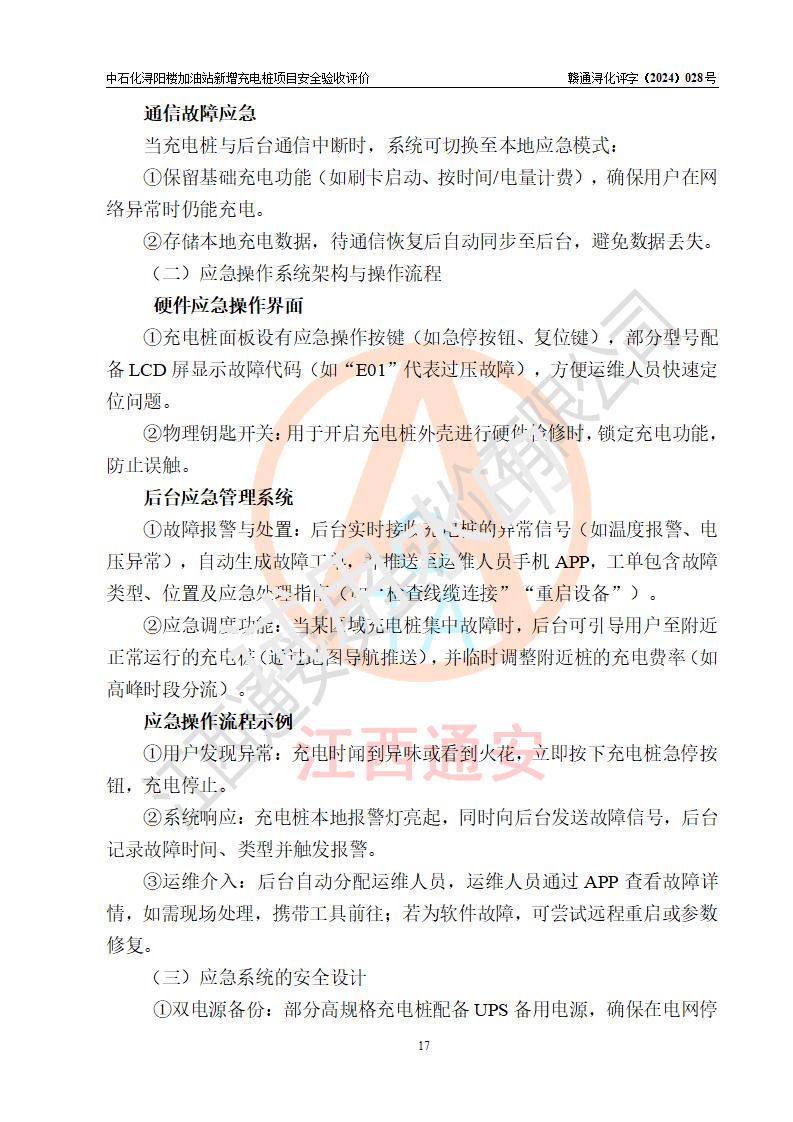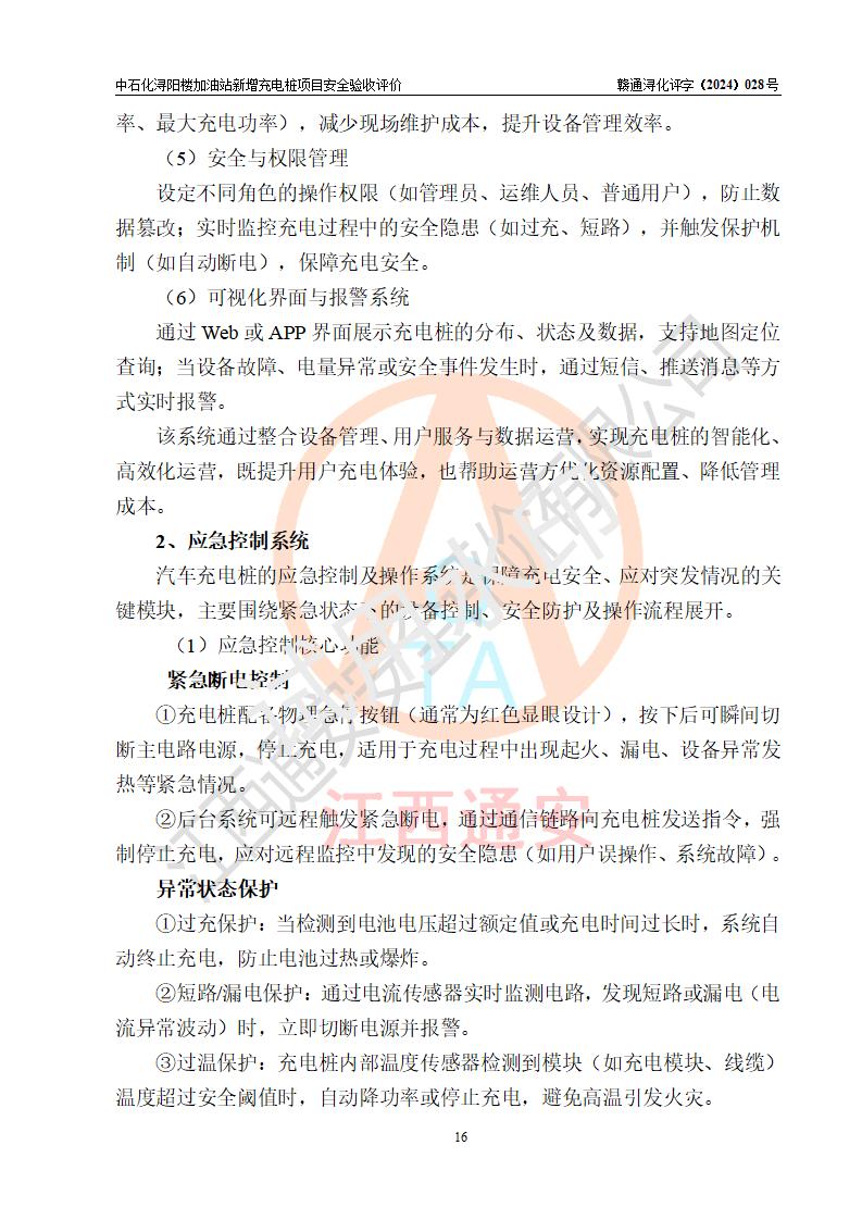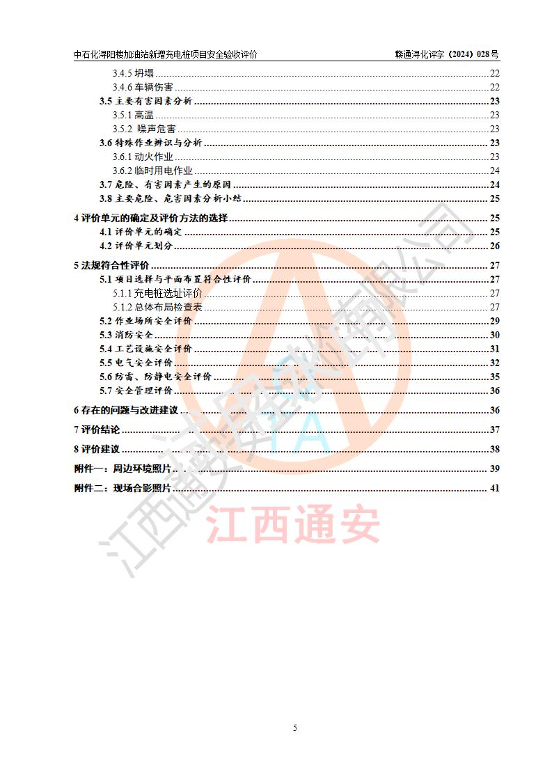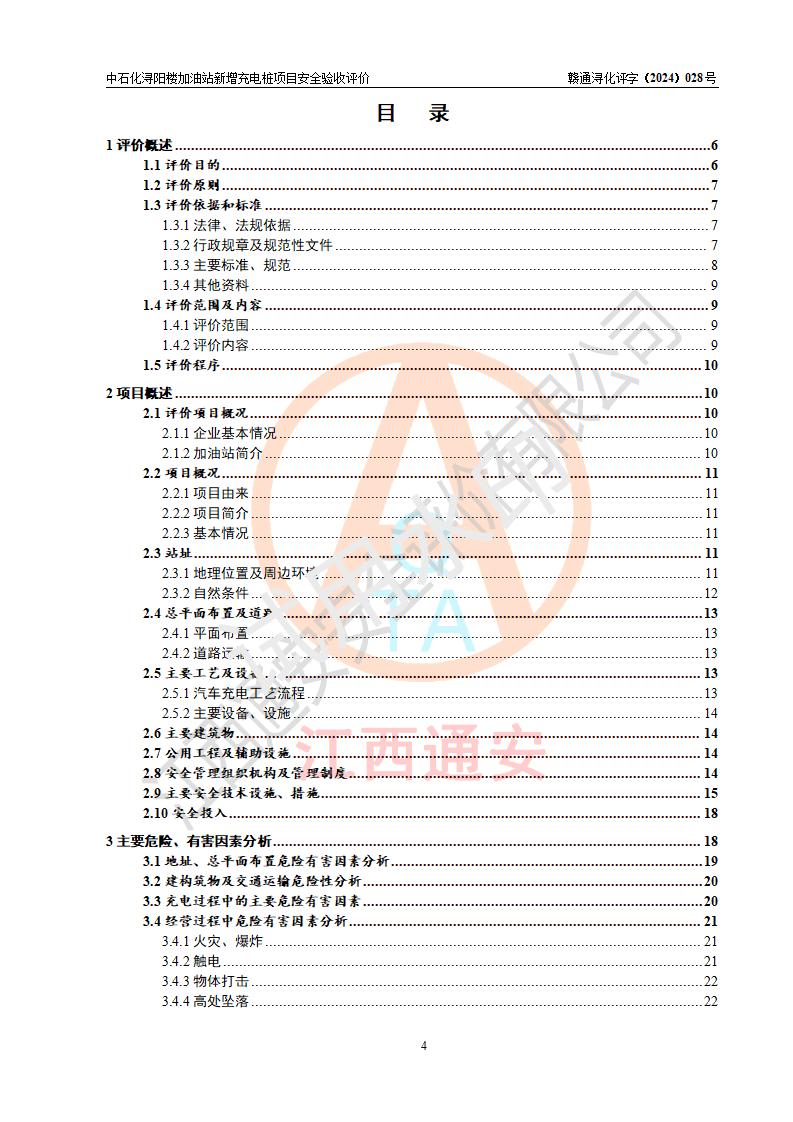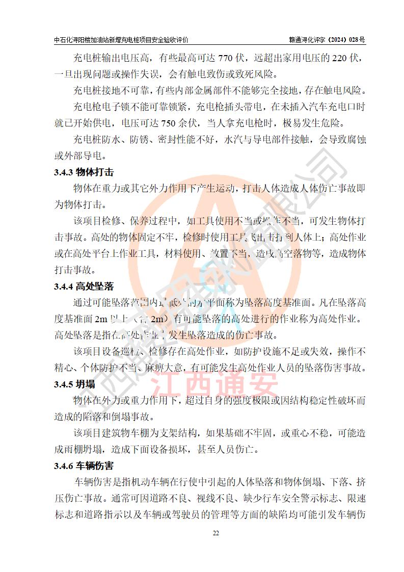 評價結論 | 中國石化銷售股份有限公司江西九江潯陽石油分公司潯陽樓加油站新增充電樁項目涉及的安全條件、安全生產條件、安全生產管理符合《電動汽車充電站設計規(guī)范》、《汽車加油加氣加氫站技術標準》等**有關法規(guī)、標準、規(guī)范要求,能滿足經營單位的安全條件,具備項目竣工驗收的條件。 | |||