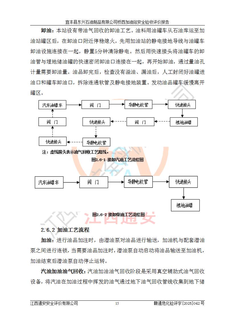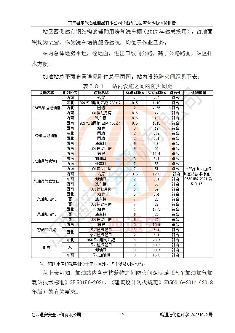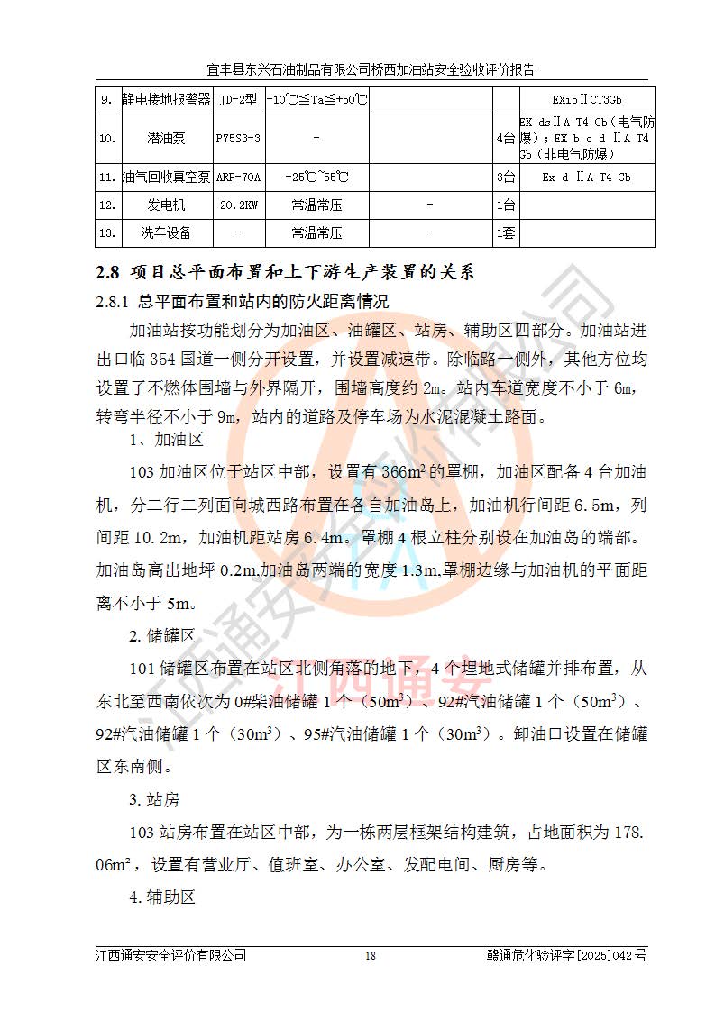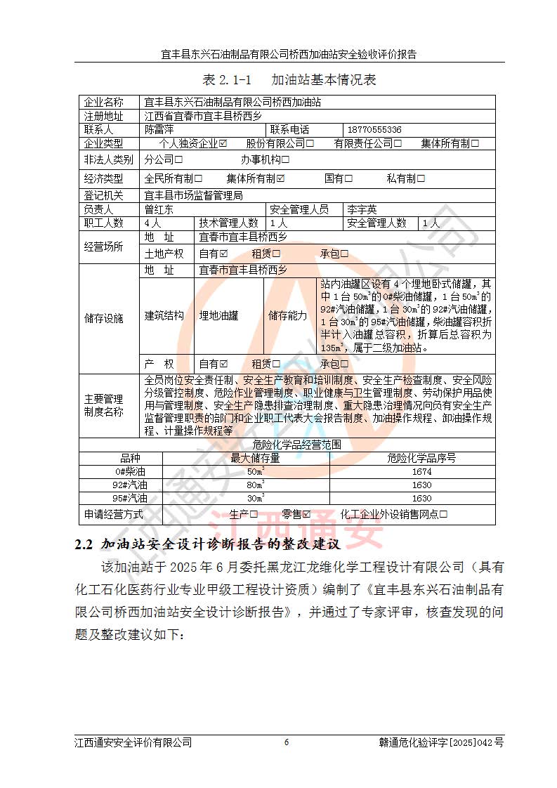 項(xiàng)目簡(jiǎn)介 | 宜豐縣東興石油制品有限公司橋西加油站(以下簡(jiǎn)稱“該加油站”)成立于2001年10月23日,營(yíng)業(yè)場(chǎng)所位于宜春市宜豐縣橋西鄉(xiāng),法定**人為張凱軍。該加油站統(tǒng)一社會(huì)信用代碼為91360924731962916E,屬于有限責(zé)任制公司分公司(自然人投資或控股)。經(jīng)營(yíng)范圍:汽油、柴油、潤(rùn)滑油、煤油零售,煙、預(yù)包裝食品零售。 該加油站油罐區(qū)設(shè)有4個(gè)埋地臥式儲(chǔ)罐,其中1臺(tái)50m3的0#柴油儲(chǔ)罐,1臺(tái)50m3的92#汽油儲(chǔ)罐,1臺(tái)30m3的92#汽油儲(chǔ)罐,1臺(tái)30m3的95#汽油儲(chǔ)罐,柴油罐容積折半計(jì)入油罐總?cè)莘e,折算后總?cè)莘e為135m3,屬于二級(jí)加油站,站內(nèi)設(shè)有油氣回收系統(tǒng)。油罐采用直埋鋪設(shè),并設(shè)抗浮基礎(chǔ)。加油區(qū)設(shè)4個(gè)加油島,采用4臺(tái)雙槍加油機(jī)。該加油站于2023年2月9日經(jīng)宜豐縣應(yīng)急管理局核準(zhǔn),換發(fā)了新的《危險(xiǎn)化學(xué)品經(jīng)營(yíng)許可證》,證書(shū)編號(hào):贛宜安經(jīng)油字[2022]36092402號(hào),許可范圍:汽油、柴油。**期限為2022年9月12日至2025年9月11日。 根據(jù)《危險(xiǎn)化學(xué)品安全管理?xiàng)l例》(經(jīng)***令第344號(hào)發(fā)布,***令第591號(hào)、***令第645號(hào)修改),《危險(xiǎn)化學(xué)品經(jīng)營(yíng)許可證管理辦法》(2012年7月17日**安全生產(chǎn)監(jiān)督管理總局令第55號(hào)公布,自2012年9月1日起施行;根據(jù)2015年5月27日**安全生產(chǎn)監(jiān)督管理總局令第79號(hào)修正)等法律法規(guī)及文件要求,該加油站的危險(xiǎn)化學(xué)品經(jīng)營(yíng)許可證三年**期即將到期,需要重新進(jìn)行安全現(xiàn)狀評(píng)價(jià)。由于該加油站2013年建成投運(yùn),安全設(shè)施“三同時(shí)”資料不全,根據(jù)《江西省應(yīng)急管理廳辦公室關(guān)于規(guī)范危險(xiǎn)化學(xué)品經(jīng)營(yíng)許可工作的通知》(贛應(yīng)急辦字〔2025〕58號(hào))等要求,危險(xiǎn)化學(xué)品經(jīng)營(yíng)企業(yè)應(yīng)在一個(gè)延期換證周期內(nèi)進(jìn)行安全設(shè)計(jì)診斷,并根據(jù)診斷結(jié)論開(kāi)展安全設(shè)施設(shè)計(jì)整改,驗(yàn)收通過(guò)后方可延期換證。該加油站于2025年6月委托黑龍江龍維化學(xué)工程設(shè)計(jì)有限公司(具有化工石化醫(yī)藥行業(yè)專業(yè)**工程設(shè)計(jì)資質(zhì))編制了《宜豐縣東興石油制品有限公司橋西加油站安全設(shè)計(jì)診斷報(bào)告》,并通過(guò)了專家評(píng)審。根據(jù)該安全設(shè)計(jì)診斷報(bào)告提出的安全隱患及整改建議,該加油站及時(shí)進(jìn)行了整改,目前已整改到位,具備安全設(shè)施驗(yàn)收條件。