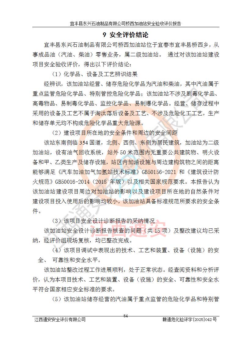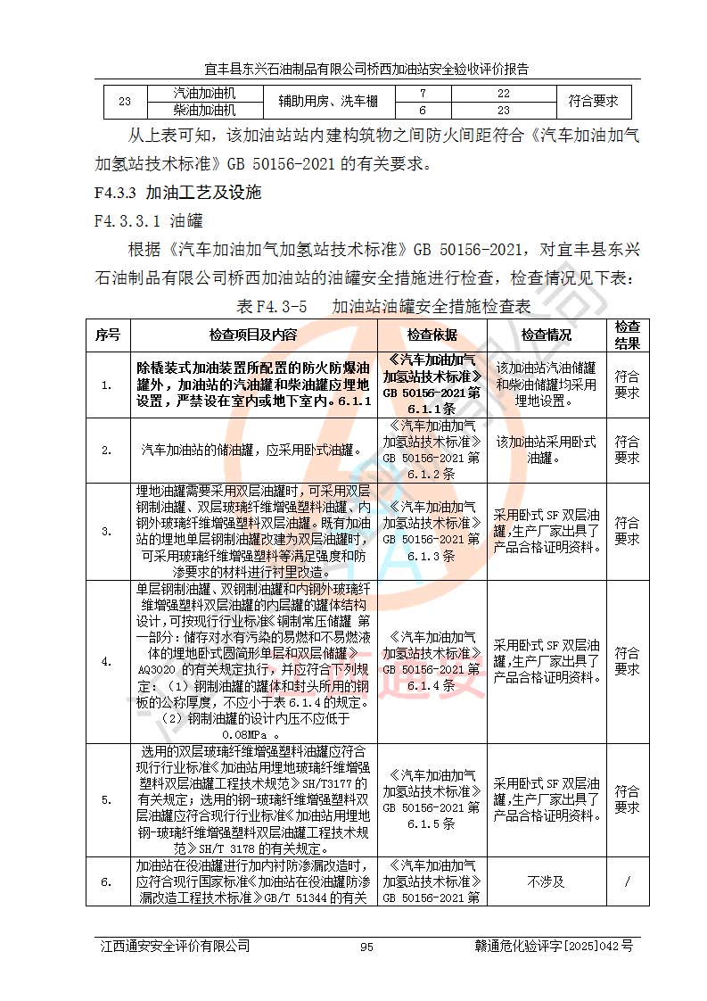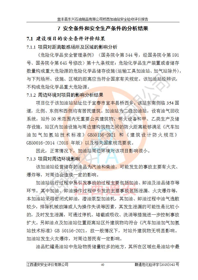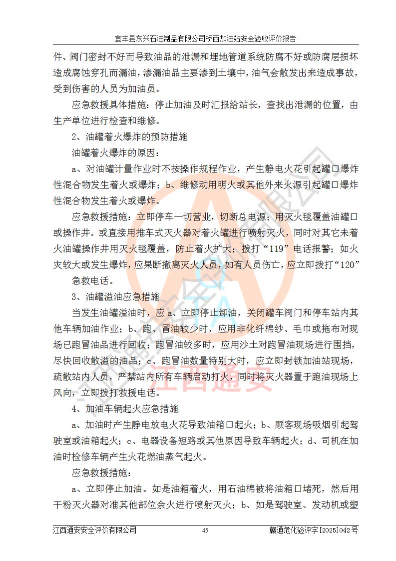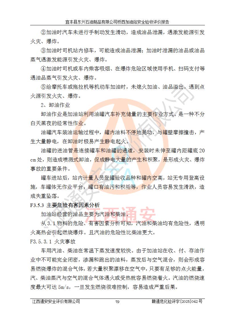 其它 | 一、安全狀況綜合評(píng)述 宜豐縣東興石油制品有限公司橋西加油站位于宜春市宜豐縣橋西鄉(xiāng),從事成品油(汽油、柴油)零售業(yè)務(wù),屬二級(jí)加油站。 通過(guò)對(duì)該加油站建設(shè)項(xiàng)目安全驗(yàn)收評(píng)價(jià),得出以下評(píng)價(jià)結(jié)論: 化學(xué)品、設(shè)備及工藝辨識(shí)結(jié)果 經(jīng)辨識(shí),該加油站經(jīng)營(yíng)、儲(chǔ)存危險(xiǎn)化學(xué)品為汽油和柴油,其中汽油屬于重點(diǎn)監(jiān)管危險(xiǎn)化學(xué)品、特別管控危險(xiǎn)化學(xué)品;該加油站不涉及劇毒化學(xué)品、高毒物品、易制毒化學(xué)品、監(jiān)控化學(xué)品、易制爆化學(xué)品。經(jīng)營(yíng)、儲(chǔ)存過(guò)程中采用的設(shè)備及工藝不屬于淘汰落后設(shè)備及工藝、不涉及危險(xiǎn)化工工藝,生產(chǎn)和儲(chǔ)存單元均不構(gòu)成危險(xiǎn)化學(xué)品重大危險(xiǎn)源。 建設(shè)項(xiàng)目所在地的安全條件和周邊的安全間距 該站東南側(cè)臨354國(guó)道,北側(cè)、西側(cè)、東側(cè)為居民建筑,加油站為二級(jí)加油站,設(shè)有油氣回收系統(tǒng),站外50米范圍內(nèi)無(wú)重要公共建筑物、明火設(shè)備和甲、乙類生產(chǎn)及儲(chǔ)存設(shè)施,站區(qū)內(nèi)加油設(shè)施與周邊建構(gòu)筑物之間的距離能夠滿足《汽車加油加氣加氫站技術(shù)標(biāo)準(zhǔn)》GB50156-2021 和《建筑設(shè)計(jì)防火規(guī)范》GB50016-2014(2018 年版)以及相關(guān)**規(guī)范要求。本報(bào)告認(rèn)為該加油站建設(shè)項(xiàng)目周邊對(duì)加油站的影響以及建設(shè)項(xiàng)目所在地的自然條件對(duì)建設(shè)項(xiàng)目投入使用后的影響均較小,該加油站具備標(biāo)準(zhǔn)規(guī)范所要求的安全條件。 該項(xiàng)目安全設(shè)計(jì)診斷報(bào)告的采納情況 該加油站安全設(shè)計(jì)診斷報(bào)告核查的問(wèn)題(共15項(xiàng))及整改建議均已采納,經(jīng)評(píng)價(jià)組現(xiàn)場(chǎng)復(fù)核,均已整改完成。 該項(xiàng)目調(diào)試中表現(xiàn)出的技術(shù)、工藝和裝置、設(shè)備(設(shè)施)的安全、 可靠性和安全水平。 該加油站整改過(guò)程工作進(jìn)展順利,處于正常狀態(tài)。經(jīng)查閱資料和分析評(píng)價(jià),認(rèn)為本項(xiàng)目技術(shù)、工藝和裝置、設(shè)備(設(shè)施)的安全、可靠性和安全水平符合**相應(yīng)安全標(biāo)準(zhǔn)的要求。 該加油站儲(chǔ)存經(jīng)營(yíng)的汽油屬于重點(diǎn)監(jiān)管的危險(xiǎn)化學(xué)品和特別管控危險(xiǎn)化學(xué)品,該加油站在后續(xù)的經(jīng)營(yíng)中應(yīng)按照相關(guān)規(guī)范和要求加強(qiáng)安全管理,要求油品運(yùn)輸單位強(qiáng)化運(yùn)輸管理、自身加強(qiáng)儲(chǔ)存定制化管理。 該加油站經(jīng)營(yíng)過(guò)程中存在的危險(xiǎn)有害因素為:①火災(zāi)、爆炸;② 中毒和窒息;③**傷害;④觸電;⑤高處墜落;⑥物體打擊、⑦其他傷害。 其中火災(zāi)、爆炸是主要的危險(xiǎn)、有害因素,加油站埋地儲(chǔ)罐區(qū)、加油區(qū)、卸 油區(qū)是主要的危險(xiǎn)源。 (7)經(jīng)采用作業(yè)條件危險(xiǎn)性評(píng)價(jià)法(LEC)進(jìn)行分析,該加油站的作業(yè)條件相對(duì)比較安全。在選定的加油作業(yè)、卸油作業(yè)、維修作業(yè)、配電作業(yè)等4個(gè)單元中均為“一般危險(xiǎn)、需要注意”作業(yè)環(huán)境,且一般危險(xiǎn)作業(yè)環(huán)境的出現(xiàn)均由物料的危險(xiǎn)程度所決定,作業(yè)條件相對(duì)安全。 (8)采用危險(xiǎn)度評(píng)價(jià)法分析,油罐區(qū)主要危險(xiǎn)物質(zhì)為汽油和柴油,常溫、常壓下儲(chǔ)存。儲(chǔ)罐區(qū)汽油罐為Ⅰ級(jí),屬**危險(xiǎn);柴油罐得分為為Ⅲ級(jí),屬低度危險(xiǎn)。油罐采用雙層罐埋地設(shè)置,按要求設(shè)置了通氣管,并裝設(shè)了阻火器;設(shè)置了液位監(jiān)測(cè)報(bào)警系統(tǒng)和緊急切斷系統(tǒng),埋地加油管道設(shè)置雙層管道,其安全風(fēng)險(xiǎn)可控。 (9)采用檢查表評(píng)價(jià)法對(duì)該加油站站址選擇、總平面布置、加油工藝及設(shè)施、消防設(shè)施和給排水、電氣與報(bào)警和緊急切斷系統(tǒng)等進(jìn)行檢查分析,經(jīng)整改后,該加油站涉及的強(qiáng)制條款和其他項(xiàng)均符合要求。該加油站設(shè)置了消防安全設(shè)施、防雷防靜電設(shè)施、液位監(jiān)測(cè)措施、油罐泄漏檢測(cè)措施、電氣防爆措施等安全防護(hù)設(shè)施,取得了消防驗(yàn)收意見(jiàn)書(shū)和防雷檢測(cè)合格報(bào)告,符合**法律法規(guī)、標(biāo)準(zhǔn)規(guī)范的要求。該加油站公用工程能夠滿足安全經(jīng)營(yíng)的基本需要,符合安全經(jīng)營(yíng)的條件。 (10)該加油站相關(guān)證照齊全,成立了安全生產(chǎn)**小組,配備了安全管理人員,制定了安全管理制度、操作規(guī)程和事故應(yīng)急預(yù)案,加油站的安全管理機(jī)構(gòu)工作有力,加油站安全經(jīng)營(yíng)管理處于正常有序開(kāi)展范圍。 (11)對(duì)宜豐縣東興石油制品有限公司橋西加油站存在重大生產(chǎn)安全事故隱患進(jìn)行判定,檢查結(jié)果為該加油站不存在重大生產(chǎn)安全事故隱患。 總體評(píng)價(jià)結(jié)論:宜豐縣東