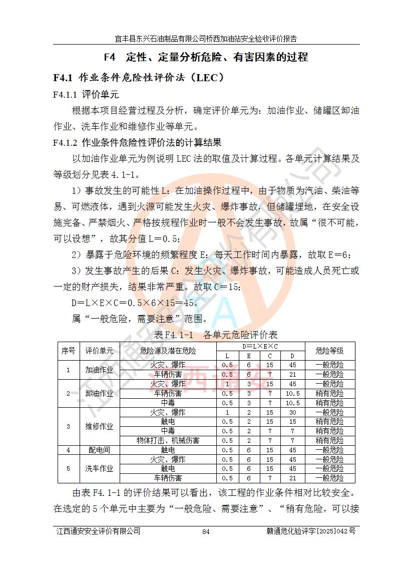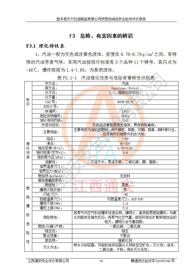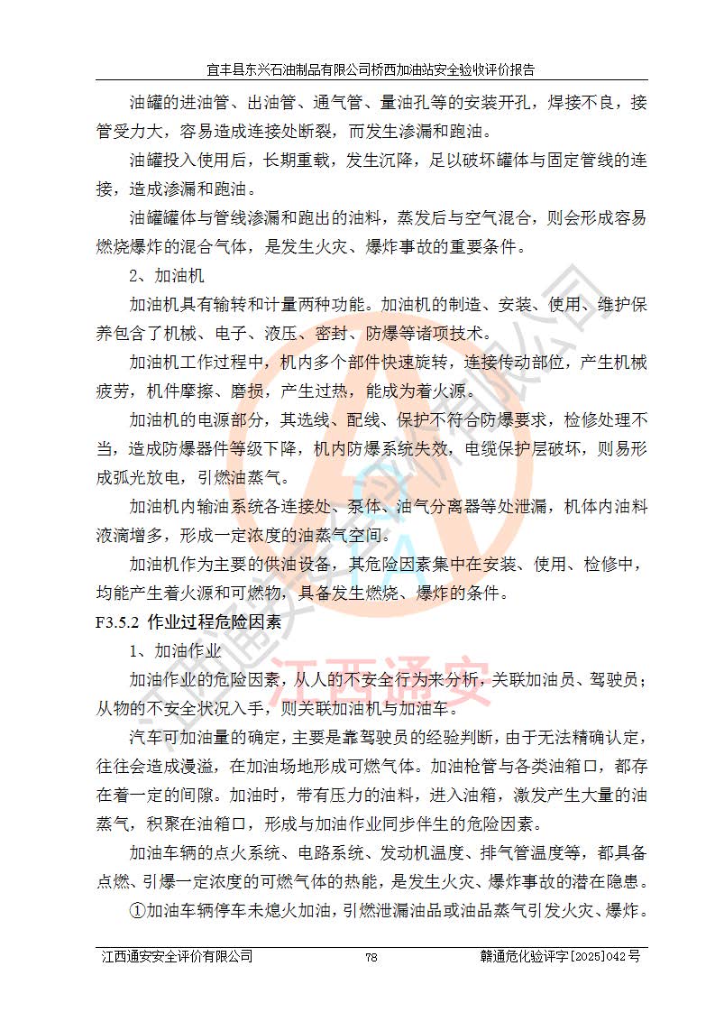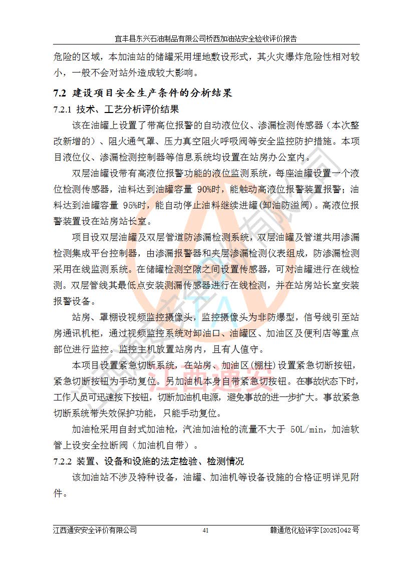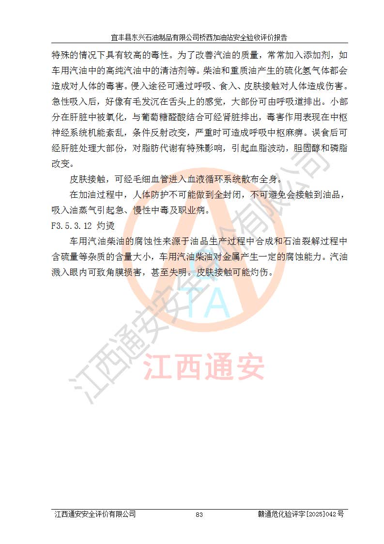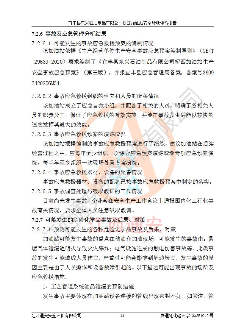 其它 | 一、安全狀況綜合評(píng)述 宜豐縣東興石油制品有限公司橋西加油站位于宜春市宜豐縣橋西鄉(xiāng),從事成品油(汽油、柴油)零售業(yè)務(wù),屬二級(jí)加油站。 通過(guò)對(duì)該加油站建設(shè)項(xiàng)目安全驗(yàn)收評(píng)價(jià),得出以下評(píng)價(jià)結(jié)論: 化學(xué)品、設(shè)備及工藝辨識(shí)結(jié)果 經(jīng)辨識(shí),該加油站經(jīng)營(yíng)、儲(chǔ)存危險(xiǎn)化學(xué)品為汽油和柴油,其中汽油屬于重點(diǎn)監(jiān)管危險(xiǎn)化學(xué)品、特別管控危險(xiǎn)化學(xué)品;該加油站不涉及劇毒化學(xué)品、高毒物品、易制毒化學(xué)品、監(jiān)控化學(xué)品、易制爆化學(xué)品。經(jīng)營(yíng)、儲(chǔ)存過(guò)程中采用的設(shè)備及工藝不屬于淘汰落后設(shè)備及工藝、不涉及危險(xiǎn)化工工藝,生產(chǎn)和儲(chǔ)存單元均不構(gòu)成危險(xiǎn)化學(xué)品重大危險(xiǎn)源。 建設(shè)項(xiàng)目所在地的安全條件和周邊的安全間距 該站東南側(cè)臨354國(guó)道,北側(cè)、西側(cè)、東側(cè)為居民建筑,加油站為二級(jí)加油站,設(shè)有油氣回收系統(tǒng),站外50米范圍內(nèi)無(wú)重要公共建筑物、明火設(shè)備和甲、乙類生產(chǎn)及儲(chǔ)存設(shè)施,站區(qū)內(nèi)加油設(shè)施與周邊建構(gòu)筑物之間的距離能夠滿足《汽車加油加氣加氫站技術(shù)標(biāo)準(zhǔn)》GB50156-2021 和《建筑設(shè)計(jì)防火規(guī)范》GB50016-2014(2018 年版)以及相關(guān)**規(guī)范要求。本報(bào)告認(rèn)為該加油站建設(shè)項(xiàng)目周邊對(duì)加油站的影響以及建設(shè)項(xiàng)目所在地的自然條件對(duì)建設(shè)項(xiàng)目投入使用后的影響均較小,該加油站具備標(biāo)準(zhǔn)規(guī)范所要求的安全條件。 該項(xiàng)目安全設(shè)計(jì)診斷報(bào)告的采納情況 該加油站安全設(shè)計(jì)診斷報(bào)告核查的問(wèn)題(共15項(xiàng))及整改建議均已采納,經(jīng)評(píng)價(jià)組現(xiàn)場(chǎng)復(fù)核,均已整改完成。 該項(xiàng)目調(diào)試中表現(xiàn)出的技術(shù)、工藝和裝置、設(shè)備(設(shè)施)的安全、 可靠性和安全水平。 該加油站整改過(guò)程工作進(jìn)展順利,處于正常狀態(tài)。經(jīng)查閱資料和分析評(píng)價(jià),認(rèn)為本項(xiàng)目技術(shù)、工藝和裝置、設(shè)備(設(shè)施)的安全、可靠性和安全水平符合**相應(yīng)安全標(biāo)準(zhǔn)的要求。 該加油站儲(chǔ)存經(jīng)營(yíng)的汽油屬于重點(diǎn)監(jiān)管的危險(xiǎn)化學(xué)品和特別管控危險(xiǎn)化學(xué)品,該加油站在后續(xù)的經(jīng)營(yíng)中應(yīng)按照相關(guān)規(guī)范和要求加強(qiáng)安全管理,要求油品運(yùn)輸單位強(qiáng)化運(yùn)輸管理、自身加強(qiáng)儲(chǔ)存定制化管理。 該加油站經(jīng)營(yíng)過(guò)程中存在的危險(xiǎn)有害因素為:①火災(zāi)、爆炸;② 中毒和窒息;③**傷害;④觸電;⑤高處墜落;⑥物體打擊、⑦其他傷害。 其中火災(zāi)、爆炸是主要的危險(xiǎn)、有害因素,加油站埋地儲(chǔ)罐區(qū)、加油區(qū)、卸 油區(qū)是主要的危險(xiǎn)源。 (7)經(jīng)采用作業(yè)條件危險(xiǎn)性評(píng)價(jià)法(LEC)進(jìn)行分析,該加油站的作業(yè)條件相對(duì)比較安全。在選定的加油作業(yè)、卸油作業(yè)、維修作業(yè)、配電作業(yè)等4個(gè)單元中均為“一般危險(xiǎn)、需要注意”作業(yè)環(huán)境,且一般危險(xiǎn)作業(yè)環(huán)境的出現(xiàn)均由物料的危險(xiǎn)程度所決定,作業(yè)條件相對(duì)安全。 (8)采用危險(xiǎn)度評(píng)價(jià)法分析,油罐區(qū)主要危險(xiǎn)物質(zhì)為汽油和柴油,常溫、常壓下儲(chǔ)存。儲(chǔ)罐區(qū)汽油罐為Ⅰ級(jí),屬**危險(xiǎn);柴油罐得分為為Ⅲ級(jí),屬低度危險(xiǎn)。油罐采用雙層罐埋地設(shè)置,按要求設(shè)置了通氣管,并裝設(shè)了阻火器;設(shè)置了液位監(jiān)測(cè)報(bào)警系統(tǒng)和緊急切斷系統(tǒng),埋地加油管道設(shè)置雙層管道,其安全風(fēng)險(xiǎn)可控。 (9)采用檢查表評(píng)價(jià)法對(duì)該加油站站址選擇、總平面布置、加油工藝及設(shè)施、消防設(shè)施和給排水、電氣與報(bào)警和緊急切斷系統(tǒng)等進(jìn)行檢查分析,經(jīng)整改后,該加油站涉及的強(qiáng)制條款和其他項(xiàng)均符合要求。該加油站設(shè)置了消防安全設(shè)施、防雷防靜電設(shè)施、液位監(jiān)測(cè)措施、油罐泄漏檢測(cè)措施、電氣防爆措施等安全防護(hù)設(shè)施,取得了消防驗(yàn)收意見(jiàn)書(shū)和防雷檢測(cè)合格報(bào)告,符合**法律法規(guī)、標(biāo)準(zhǔn)規(guī)范的要求。該加油站公用工程能夠滿足安全經(jīng)營(yíng)的基本需要,符合安全經(jīng)營(yíng)的條件。 (10)該加油站相關(guān)證照齊全,成立了安全生產(chǎn)**小組,配備了安全管理人員,制定了安全管理制度、操作規(guī)程和事故應(yīng)急預(yù)案,加油站的安全管理機(jī)構(gòu)工作有力,加油站安全經(jīng)營(yíng)管理處于正常有序開(kāi)展范圍。 (11)對(duì)宜豐縣東興石油制品有限公司橋西加油站存在重大生產(chǎn)安全事故隱患進(jìn)行判定,檢查結(jié)果為該加油站不存在重大生產(chǎn)安全事故隱患。 總體評(píng)價(jià)結(jié)論:宜豐縣東