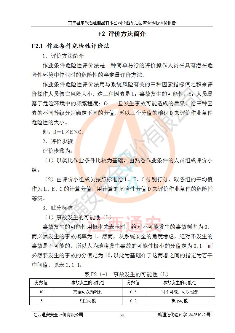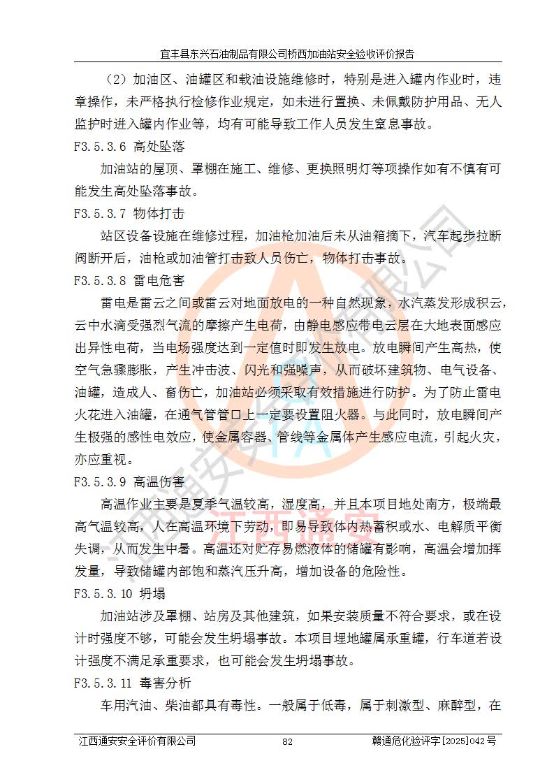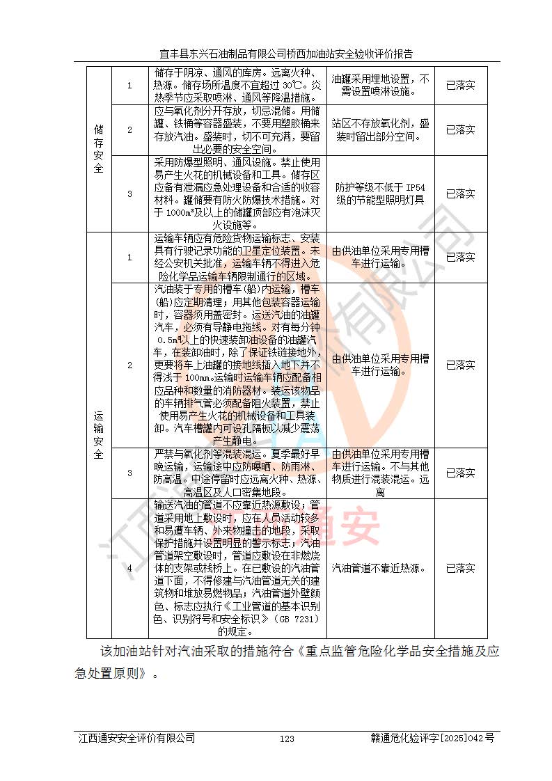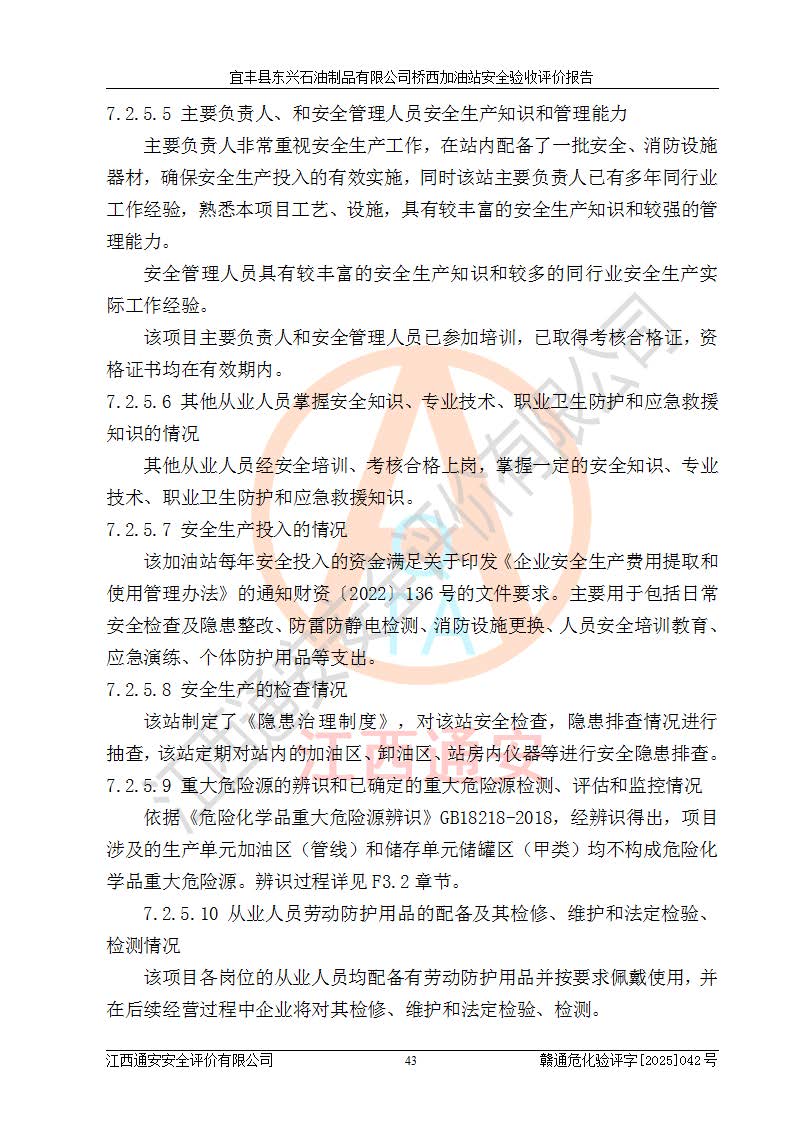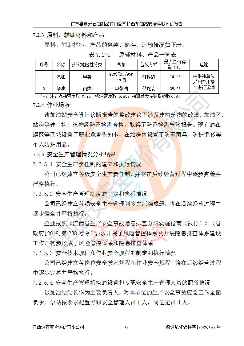 其它 | 一、安全狀況綜合評(píng)述 宜豐縣東興石油制品有限公司橋西加油站位于宜春市宜豐縣橋西鄉(xiāng),從事成品油(汽油、柴油)零售業(yè)務(wù),屬二級(jí)加油站。 通過(guò)對(duì)該加油站建設(shè)項(xiàng)目安全驗(yàn)收評(píng)價(jià),得出以下評(píng)價(jià)結(jié)論: 化學(xué)品、設(shè)備及工藝辨識(shí)結(jié)果 經(jīng)辨識(shí),該加油站經(jīng)營(yíng)、儲(chǔ)存危險(xiǎn)化學(xué)品為汽油和柴油,其中汽油屬于重點(diǎn)監(jiān)管危險(xiǎn)化學(xué)品、特別管控危險(xiǎn)化學(xué)品;該加油站不涉及劇毒化學(xué)品、高毒物品、易制毒化學(xué)品、監(jiān)控化學(xué)品、易制爆化學(xué)品。經(jīng)營(yíng)、儲(chǔ)存過(guò)程中采用的設(shè)備及工藝不屬于淘汰落后設(shè)備及工藝、不涉及危險(xiǎn)化工工藝,生產(chǎn)和儲(chǔ)存單元均不構(gòu)成危險(xiǎn)化學(xué)品重大危險(xiǎn)源。 建設(shè)項(xiàng)目所在地的安全條件和周邊的安全間距 該站東南側(cè)臨354國(guó)道,北側(cè)、西側(cè)、東側(cè)為居民建筑,加油站為二級(jí)加油站,設(shè)有油氣回收系統(tǒng),站外50米范圍內(nèi)無(wú)重要公共建筑物、明火設(shè)備和甲、乙類生產(chǎn)及儲(chǔ)存設(shè)施,站區(qū)內(nèi)加油設(shè)施與周邊建構(gòu)筑物之間的距離能夠滿足《汽車加油加氣加氫站技術(shù)標(biāo)準(zhǔn)》GB50156-2021 和《建筑設(shè)計(jì)防火規(guī)范》GB50016-2014(2018 年版)以及相關(guān)**規(guī)范要求。本報(bào)告認(rèn)為該加油站建設(shè)項(xiàng)目周邊對(duì)加油站的影響以及建設(shè)項(xiàng)目所在地的自然條件對(duì)建設(shè)項(xiàng)目投入使用后的影響均較小,該加油站具備標(biāo)準(zhǔn)規(guī)范所要求的安全條件。 該項(xiàng)目安全設(shè)計(jì)診斷報(bào)告的采納情況 該加油站安全設(shè)計(jì)診斷報(bào)告核查的問(wèn)題(共15項(xiàng))及整改建議均已采納,經(jīng)評(píng)價(jià)組現(xiàn)場(chǎng)復(fù)核,均已整改完成。 該項(xiàng)目調(diào)試中表現(xiàn)出的技術(shù)、工藝和裝置、設(shè)備(設(shè)施)的安全、 可靠性和安全水平。 該加油站整改過(guò)程工作進(jìn)展順利,處于正常狀態(tài)。經(jīng)查閱資料和分析評(píng)價(jià),認(rèn)為本項(xiàng)目技術(shù)、工藝和裝置、設(shè)備(設(shè)施)的安全、可靠性和安全水平符合**相應(yīng)安全標(biāo)準(zhǔn)的要求。 該加油站儲(chǔ)存經(jīng)營(yíng)的汽油屬于重點(diǎn)監(jiān)管的危險(xiǎn)化學(xué)品和特別管控危險(xiǎn)化學(xué)品,該加油站在后續(xù)的經(jīng)營(yíng)中應(yīng)按照相關(guān)規(guī)范和要求加強(qiáng)安全管理,要求油品運(yùn)輸單位強(qiáng)化運(yùn)輸管理、自身加強(qiáng)儲(chǔ)存定制化管理。 該加油站經(jīng)營(yíng)過(guò)程中存在的危險(xiǎn)有害因素為:①火災(zāi)、爆炸;② 中毒和窒息;③**傷害;④觸電;⑤高處墜落;⑥物體打擊、⑦其他傷害。 其中火災(zāi)、爆炸是主要的危險(xiǎn)、有害因素,加油站埋地儲(chǔ)罐區(qū)、加油區(qū)、卸 油區(qū)是主要的危險(xiǎn)源。 (7)經(jīng)采用作業(yè)條件危險(xiǎn)性評(píng)價(jià)法(LEC)進(jìn)行分析,該加油站的作業(yè)條件相對(duì)比較安全。在選定的加油作業(yè)、卸油作業(yè)、維修作業(yè)、配電作業(yè)等4個(gè)單元中均為“一般危險(xiǎn)、需要注意”作業(yè)環(huán)境,且一般危險(xiǎn)作業(yè)環(huán)境的出現(xiàn)均由物料的危險(xiǎn)程度所決定,作業(yè)條件相對(duì)安全。 (8)采用危險(xiǎn)度評(píng)價(jià)法分析,油罐區(qū)主要危險(xiǎn)物質(zhì)為汽油和柴油,常溫、常壓下儲(chǔ)存。儲(chǔ)罐區(qū)汽油罐為Ⅰ級(jí),屬**危險(xiǎn);柴油罐得分為為Ⅲ級(jí),屬低度危險(xiǎn)。油罐采用雙層罐埋地設(shè)置,按要求設(shè)置了通氣管,并裝設(shè)了阻火器;設(shè)置了液位監(jiān)測(cè)報(bào)警系統(tǒng)和緊急切斷系統(tǒng),埋地加油管道設(shè)置雙層管道,其安全風(fēng)險(xiǎn)可控。 (9)采用檢查表評(píng)價(jià)法對(duì)該加油站站址選擇、總平面布置、加油工藝及設(shè)施、消防設(shè)施和給排水、電氣與報(bào)警和緊急切斷系統(tǒng)等進(jìn)行檢查分析,經(jīng)整改后,該加油站涉及的強(qiáng)制條款和其他項(xiàng)均符合要求。該加油站設(shè)置了消防安全設(shè)施、防雷防靜電設(shè)施、液位監(jiān)測(cè)措施、油罐泄漏檢測(cè)措施、電氣防爆措施等安全防護(hù)設(shè)施,取得了消防驗(yàn)收意見(jiàn)書(shū)和防雷檢測(cè)合格報(bào)告,符合**法律法規(guī)、標(biāo)準(zhǔn)規(guī)范的要求。該加油站公用工程能夠滿足安全經(jīng)營(yíng)的基本需要,符合安全經(jīng)營(yíng)的條件。 (10)該加油站相關(guān)證照齊全,成立了安全生產(chǎn)**小組,配備了安全管理人員,制定了安全管理制度、操作規(guī)程和事故應(yīng)急預(yù)案,加油站的安全管理機(jī)構(gòu)工作有力,加油站安全經(jīng)營(yíng)管理處于正常有序開(kāi)展范圍。 (11)對(duì)宜豐縣東興石油制品有限公司橋西加油站存在重大生產(chǎn)安全事故隱患進(jìn)行判定,檢查結(jié)果為該加油站不存在重大生產(chǎn)安全事故隱患。 總體評(píng)價(jià)結(jié)論:宜豐縣東