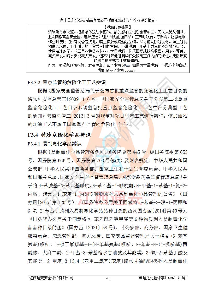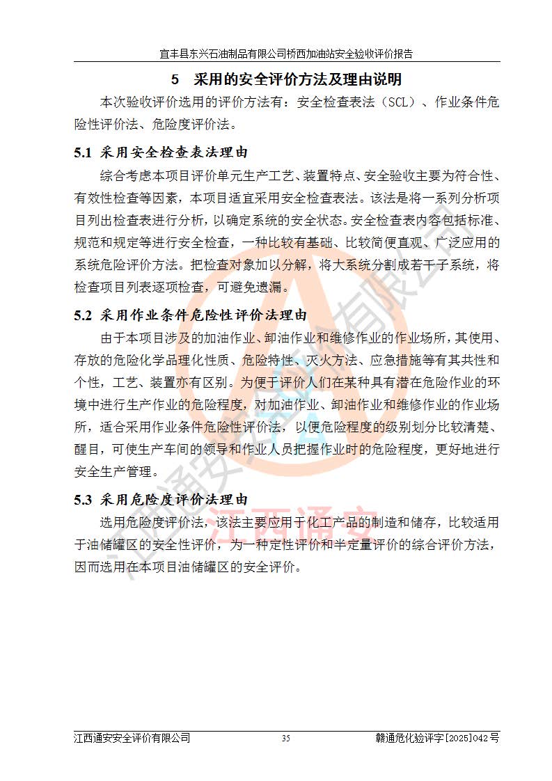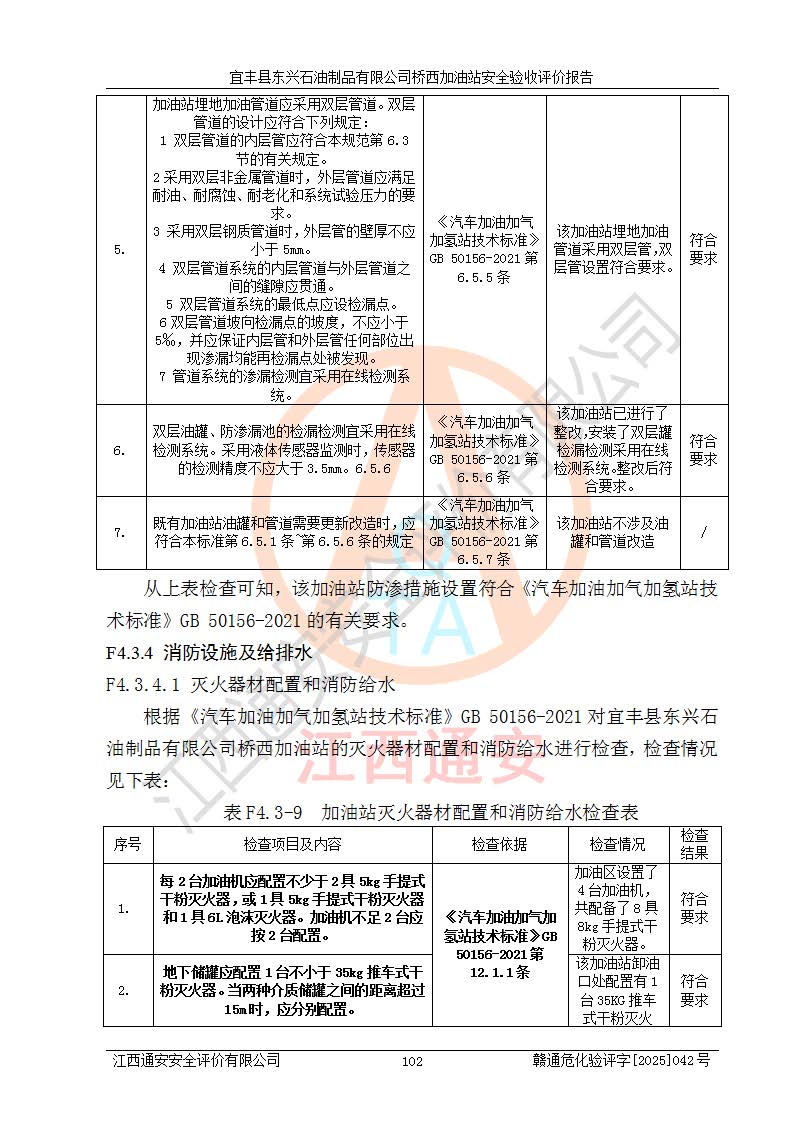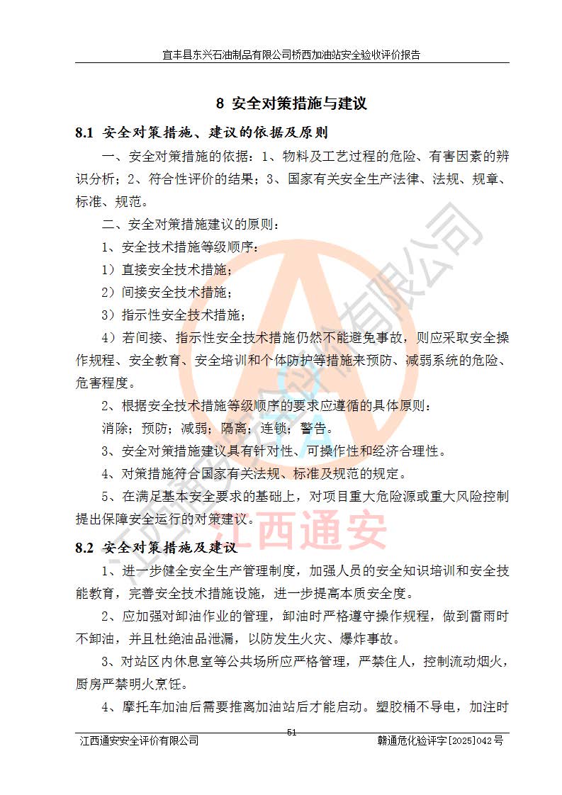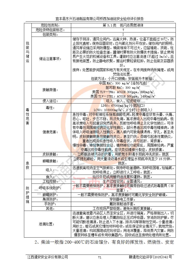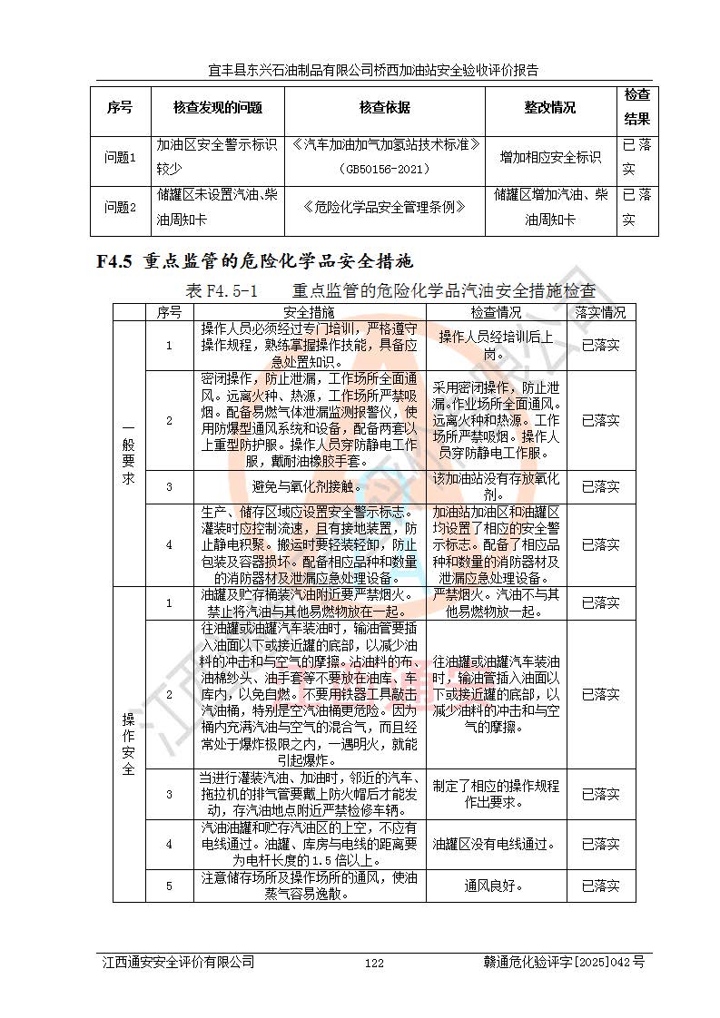 其它 | 一、安全狀況綜合評(píng)述 宜豐縣東興石油制品有限公司橋西加油站位于宜春市宜豐縣橋西鄉(xiāng),從事成品油(汽油、柴油)零售業(yè)務(wù),屬二級(jí)加油站。 通過(guò)對(duì)該加油站建設(shè)項(xiàng)目安全驗(yàn)收評(píng)價(jià),得出以下評(píng)價(jià)結(jié)論: 化學(xué)品、設(shè)備及工藝辨識(shí)結(jié)果 經(jīng)辨識(shí),該加油站經(jīng)營(yíng)、儲(chǔ)存危險(xiǎn)化學(xué)品為汽油和柴油,其中汽油屬于重點(diǎn)監(jiān)管危險(xiǎn)化學(xué)品、特別管控危險(xiǎn)化學(xué)品;該加油站不涉及劇毒化學(xué)品、高毒物品、易制毒化學(xué)品、監(jiān)控化學(xué)品、易制爆化學(xué)品。經(jīng)營(yíng)、儲(chǔ)存過(guò)程中采用的設(shè)備及工藝不屬于淘汰落后設(shè)備及工藝、不涉及危險(xiǎn)化工工藝,生產(chǎn)和儲(chǔ)存單元均不構(gòu)成危險(xiǎn)化學(xué)品重大危險(xiǎn)源。 建設(shè)項(xiàng)目所在地的安全條件和周邊的安全間距 該站東南側(cè)臨354國(guó)道,北側(cè)、西側(cè)、東側(cè)為居民建筑,加油站為二級(jí)加油站,設(shè)有油氣回收系統(tǒng),站外50米范圍內(nèi)無(wú)重要公共建筑物、明火設(shè)備和甲、乙類生產(chǎn)及儲(chǔ)存設(shè)施,站區(qū)內(nèi)加油設(shè)施與周邊建構(gòu)筑物之間的距離能夠滿足《汽車加油加氣加氫站技術(shù)標(biāo)準(zhǔn)》GB50156-2021 和《建筑設(shè)計(jì)防火規(guī)范》GB50016-2014(2018 年版)以及相關(guān)**規(guī)范要求。本報(bào)告認(rèn)為該加油站建設(shè)項(xiàng)目周邊對(duì)加油站的影響以及建設(shè)項(xiàng)目所在地的自然條件對(duì)建設(shè)項(xiàng)目投入使用后的影響均較小,該加油站具備標(biāo)準(zhǔn)規(guī)范所要求的安全條件。 該項(xiàng)目安全設(shè)計(jì)診斷報(bào)告的采納情況 該加油站安全設(shè)計(jì)診斷報(bào)告核查的問(wèn)題(共15項(xiàng))及整改建議均已采納,經(jīng)評(píng)價(jià)組現(xiàn)場(chǎng)復(fù)核,均已整改完成。 該項(xiàng)目調(diào)試中表現(xiàn)出的技術(shù)、工藝和裝置、設(shè)備(設(shè)施)的安全、 可靠性和安全水平。 該加油站整改過(guò)程工作進(jìn)展順利,處于正常狀態(tài)。經(jīng)查閱資料和分析評(píng)價(jià),認(rèn)為本項(xiàng)目技術(shù)、工藝和裝置、設(shè)備(設(shè)施)的安全、可靠性和安全水平符合**相應(yīng)安全標(biāo)準(zhǔn)的要求。 該加油站儲(chǔ)存經(jīng)營(yíng)的汽油屬于重點(diǎn)監(jiān)管的危險(xiǎn)化學(xué)品和特別管控危險(xiǎn)化學(xué)品,該加油站在后續(xù)的經(jīng)營(yíng)中應(yīng)按照相關(guān)規(guī)范和要求加強(qiáng)安全管理,要求油品運(yùn)輸單位強(qiáng)化運(yùn)輸管理、自身加強(qiáng)儲(chǔ)存定制化管理。 該加油站經(jīng)營(yíng)過(guò)程中存在的危險(xiǎn)有害因素為:①火災(zāi)、爆炸;② 中毒和窒息;③**傷害;④觸電;⑤高處墜落;⑥物體打擊、⑦其他傷害。 其中火災(zāi)、爆炸是主要的危險(xiǎn)、有害因素,加油站埋地儲(chǔ)罐區(qū)、加油區(qū)、卸 油區(qū)是主要的危險(xiǎn)源。 (7)經(jīng)采用作業(yè)條件危險(xiǎn)性評(píng)價(jià)法(LEC)進(jìn)行分析,該加油站的作業(yè)條件相對(duì)比較安全。在選定的加油作業(yè)、卸油作業(yè)、維修作業(yè)、配電作業(yè)等4個(gè)單元中均為“一般危險(xiǎn)、需要注意”作業(yè)環(huán)境,且一般危險(xiǎn)作業(yè)環(huán)境的出現(xiàn)均由物料的危險(xiǎn)程度所決定,作業(yè)條件相對(duì)安全。 (8)采用危險(xiǎn)度評(píng)價(jià)法分析,油罐區(qū)主要危險(xiǎn)物質(zhì)為汽油和柴油,常溫、常壓下儲(chǔ)存。儲(chǔ)罐區(qū)汽油罐為Ⅰ級(jí),屬**危險(xiǎn);柴油罐得分為為Ⅲ級(jí),屬低度危險(xiǎn)。油罐采用雙層罐埋地設(shè)置,按要求設(shè)置了通氣管,并裝設(shè)了阻火器;設(shè)置了液位監(jiān)測(cè)報(bào)警系統(tǒng)和緊急切斷系統(tǒng),埋地加油管道設(shè)置雙層管道,其安全風(fēng)險(xiǎn)可控。 (9)采用檢查表評(píng)價(jià)法對(duì)該加油站站址選擇、總平面布置、加油工藝及設(shè)施、消防設(shè)施和給排水、電氣與報(bào)警和緊急切斷系統(tǒng)等進(jìn)行檢查分析,經(jīng)整改后,該加油站涉及的強(qiáng)制條款和其他項(xiàng)均符合要求。該加油站設(shè)置了消防安全設(shè)施、防雷防靜電設(shè)施、液位監(jiān)測(cè)措施、油罐泄漏檢測(cè)措施、電氣防爆措施等安全防護(hù)設(shè)施,取得了消防驗(yàn)收意見(jiàn)書(shū)和防雷檢測(cè)合格報(bào)告,符合**法律法規(guī)、標(biāo)準(zhǔn)規(guī)范的要求。該加油站公用工程能夠滿足安全經(jīng)營(yíng)的基本需要,符合安全經(jīng)營(yíng)的條件。 (10)該加油站相關(guān)證照齊全,成立了安全生產(chǎn)**小組,配備了安全管理人員,制定了安全管理制度、操作規(guī)程和事故應(yīng)急預(yù)案,加油站的安全管理機(jī)構(gòu)工作有力,加油站安全經(jīng)營(yíng)管理處于正常有序開(kāi)展范圍。 (11)對(duì)宜豐縣東興石油制品有限公司橋西加油站存在重大生產(chǎn)安全事故隱患進(jìn)行判定,檢查結(jié)果為該加油站不存在重大生產(chǎn)安全事故隱患。 總體評(píng)價(jià)結(jié)論:宜豐縣東