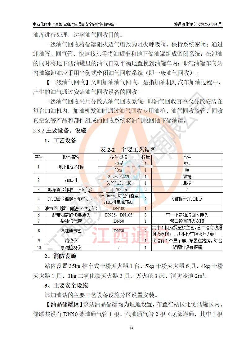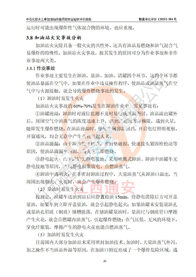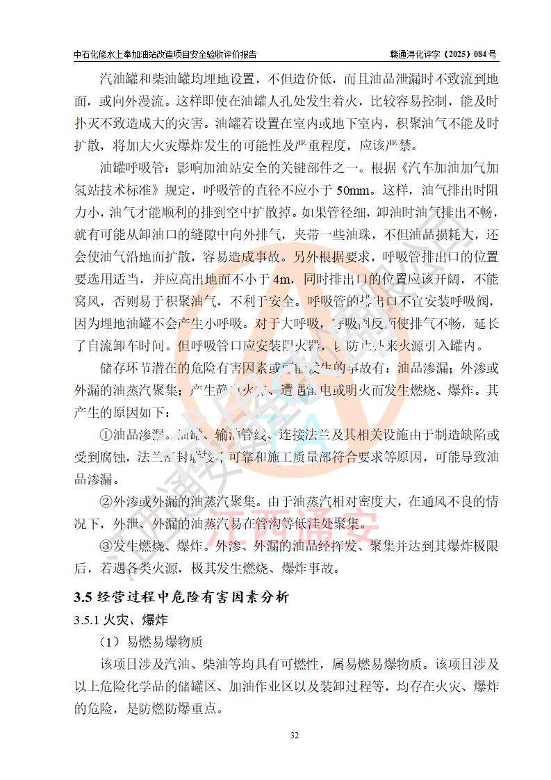 項目簡介 | 中國石化銷售股份有限公司江西九江修水石油分公司上奉加油站(以下簡稱“中石化修水上奉加油站”)是一家專門從事成品油零售經(jīng)營的有限公司分公司(外商投資企業(yè)分公司),經(jīng)營場所位于修水縣上奉鎮(zhèn)觀前村。現(xiàn)有從業(yè)人員3名,其中安全管理人員1人,加油站負(fù)責(zé)人陳小勇。 該站由九江市行政審批局換發(fā)《危險化學(xué)品經(jīng)營許可證》(編號:贛九行審經(jīng)(甲)字[2022]000144),**期限2022年08月26日至2025年08月25日(加油站現(xiàn)已停業(yè));于2023年05月10日取得九江市商務(wù)局頒發(fā)的《成品油零售經(jīng)營批準(zhǔn)證書》(油零售證書第潯0407號)**期至2028年05月09日。 中石化修水上奉加油站占地面積約920m2,站內(nèi)設(shè)置有1臺雙槍和1臺單槍程控燃油加油機及配套的工藝管線,設(shè)有SF雙層儲罐2臺,其中30m3的0#柴油儲罐1臺、30m3的92#汽油儲罐1臺,油品儲罐總?cè)莘e為60m3(折算成汽油為45m3),按現(xiàn)行《汽車加油加氣加氫站技術(shù)標(biāo)準(zhǔn)》對加油站的等級劃分原則,屬三級加油站。 因原有汽油罐距離站外北側(cè)二層民房(三類保護物)安全間距不滿足規(guī)范要求,故將原有罐區(qū)進(jìn)行拆除后原址重建(向南側(cè)移平移2.5米左右),以**與站外二層民房(三類保護物)的安全間距。 改造內(nèi)容為:1、拆除原有油罐區(qū)及配套管線,罐區(qū)拆除后南移重建非承重罐區(qū),利舊2臺30m3SF雙層罐(1柴1汽),并將柴油罐設(shè)置在靠近站外民房側(cè);2、自吸泵、液位儀、量油器、阻火器、機械呼吸閥檢測合格后均利舊,新建非成品操作井;3、新建配套土建設(shè)施、工藝及電氣線路、消防設(shè)施等;4、罐區(qū)開挖需對站房和圍墻進(jìn)行支護。 | |||