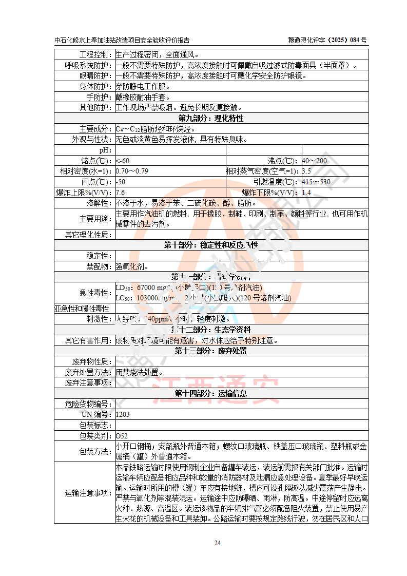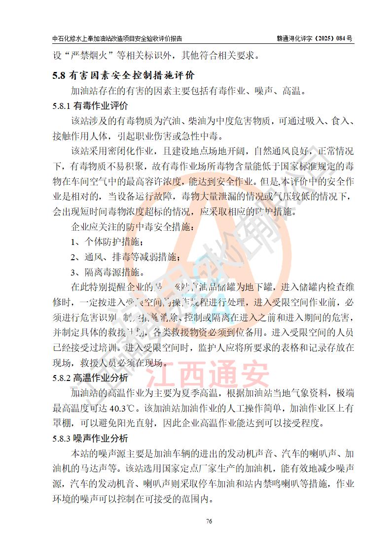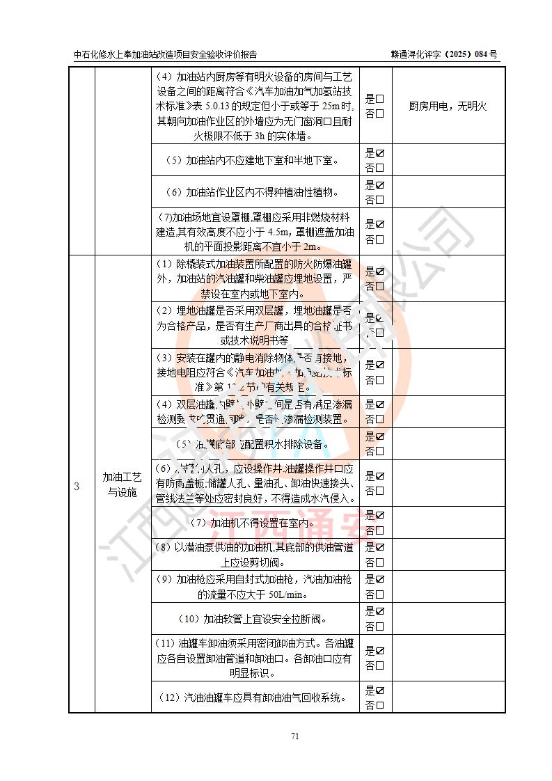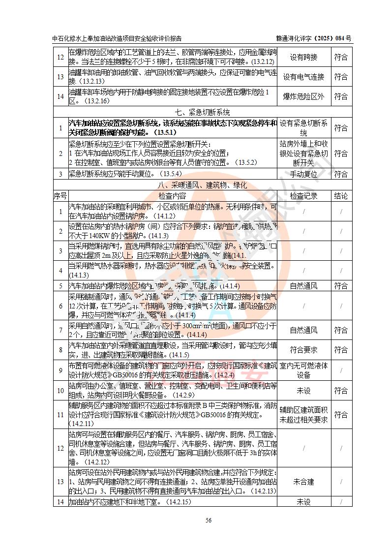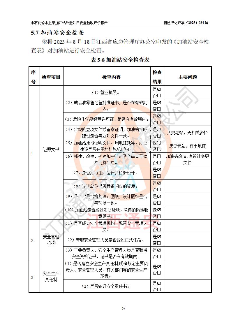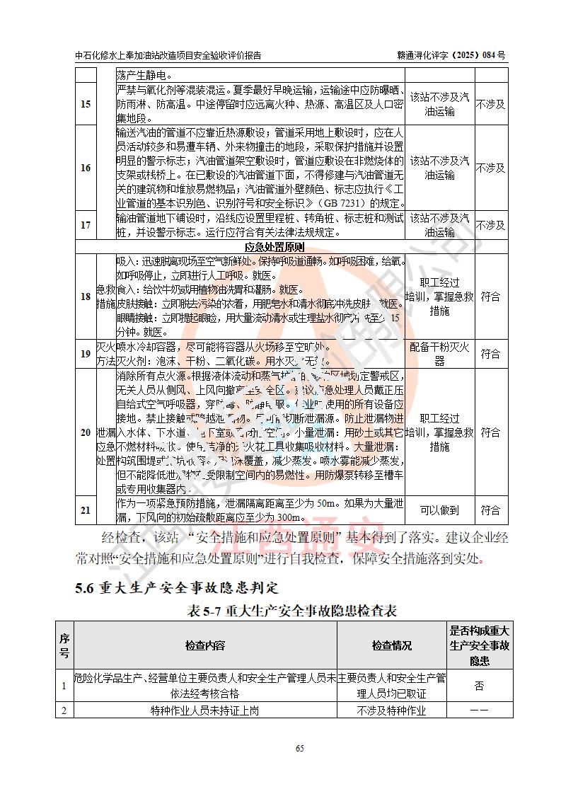 評價結(jié)論 | 中國石化銷售股份有限公司江西九江修水石油分公司上奉加油站改造項目涉及的安全條件、安全生產(chǎn)條件、安全生產(chǎn)管理符合《危險化學(xué)品經(jīng)營許可證管理辦法》、《汽車加油加氣加氫站技術(shù)標(biāo)準(zhǔn)》等**有關(guān)法規(guī)、標(biāo)準(zhǔn)、規(guī)范要求,能滿足成品油零售經(jīng)營單位的安全條件,具備項目竣工驗收的條件。 | |||