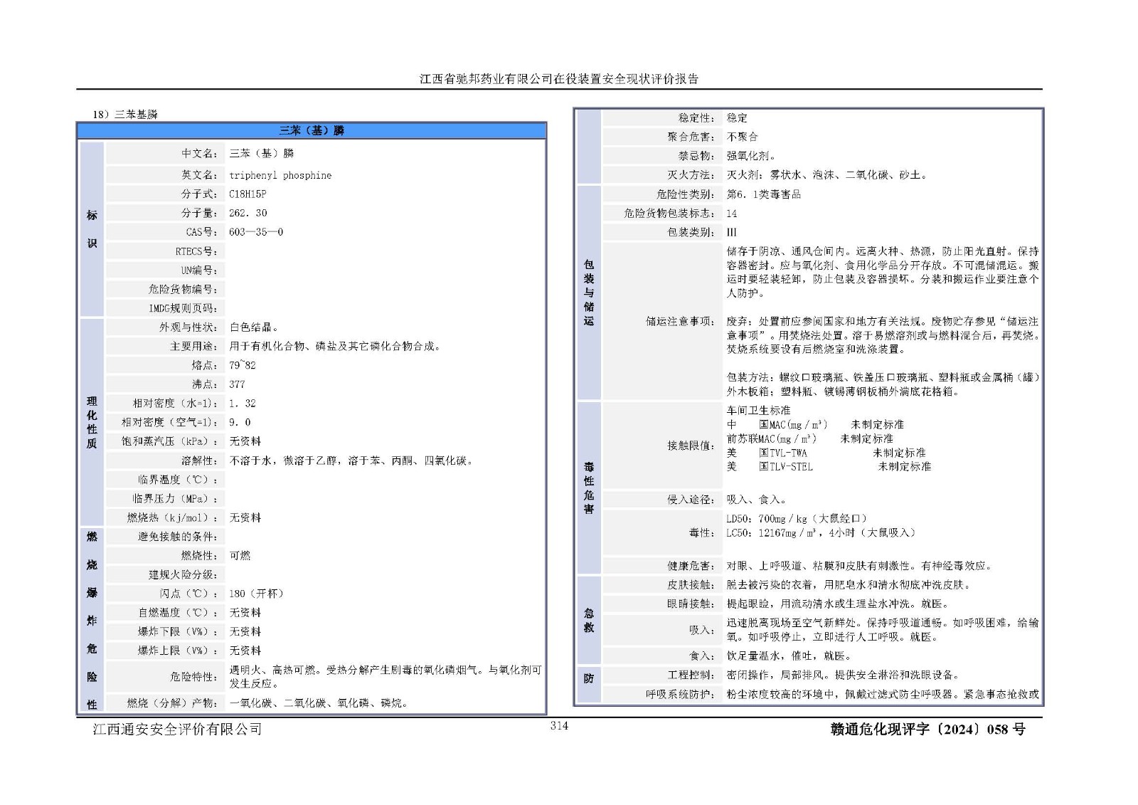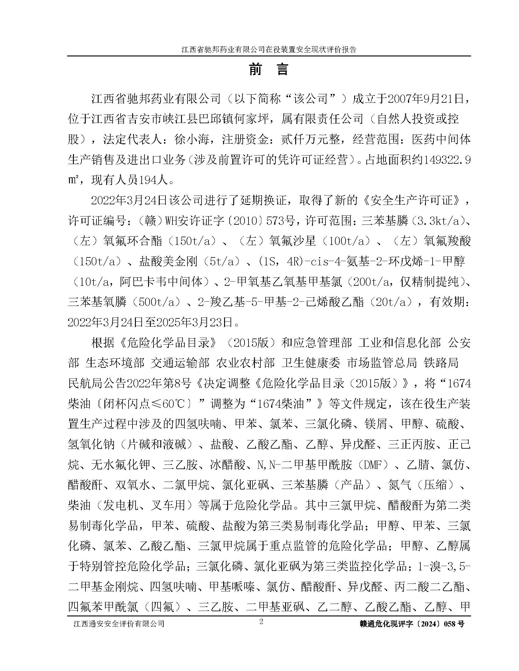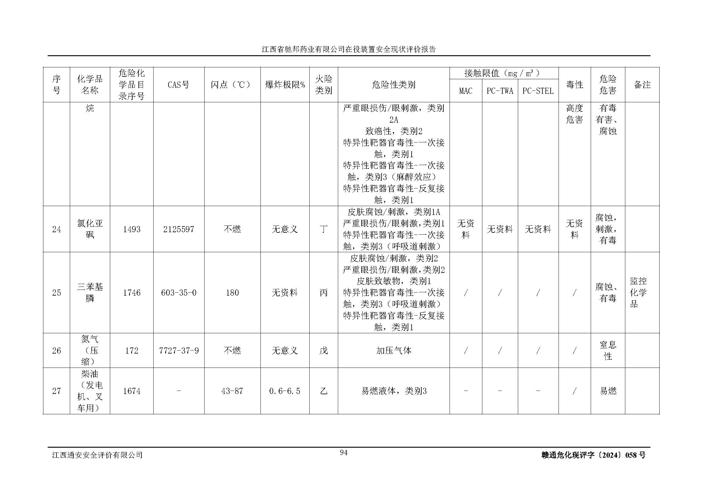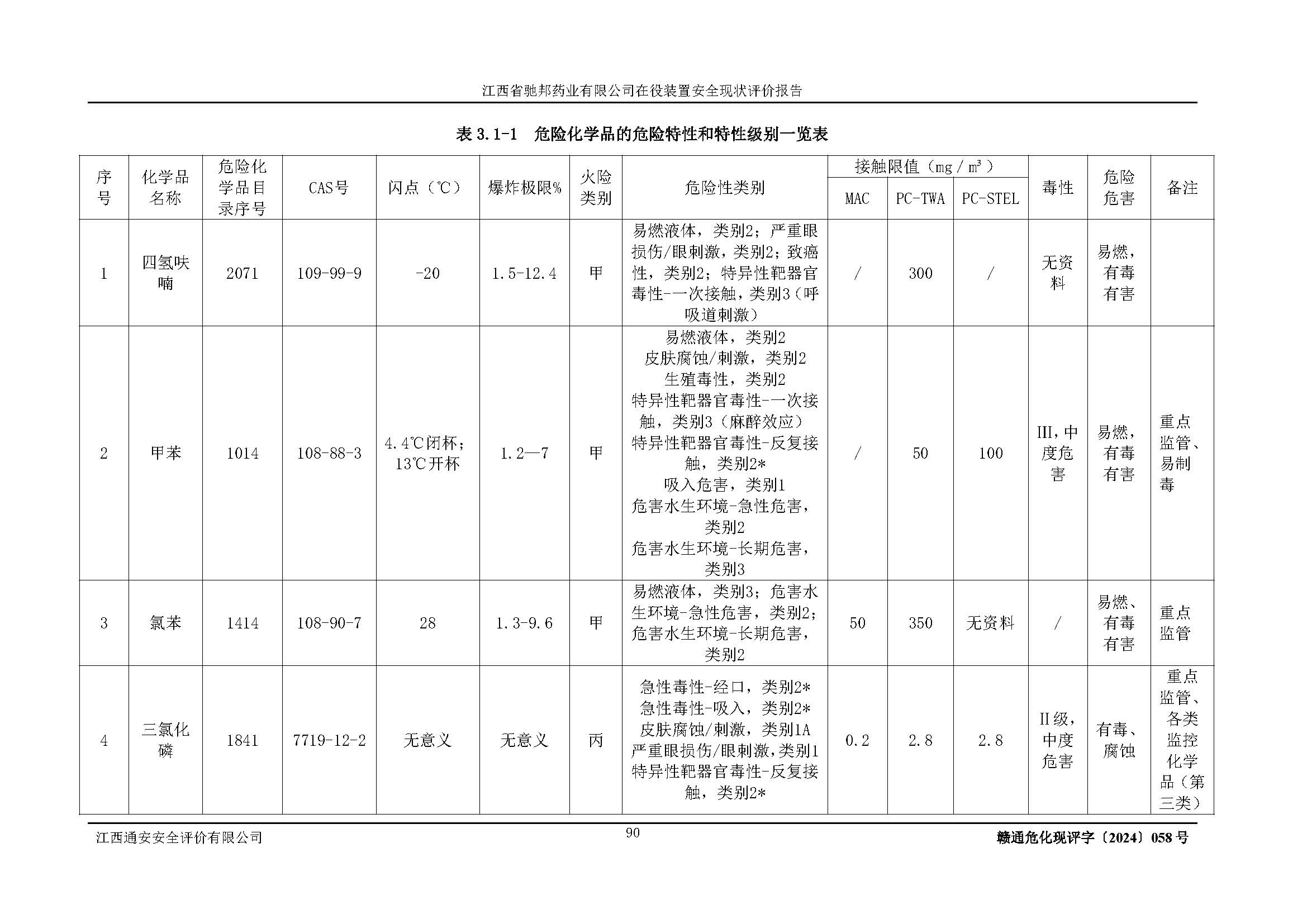 項目簡介 | 江西省馳邦藥業(yè)有限公司(以下簡稱“該公司”)成立于2007年9月21日,位于江西省吉安市峽江縣巴邱鎮(zhèn)何家坪,屬有限責任公司(自然人投資或控股),法定**人:徐小海,注冊資金:貳仟萬元整,經(jīng)營范圍:醫(yī)藥中間體生產(chǎn)銷售及進出口業(yè)務(涉及前置許可的憑許可證經(jīng)營)。占地面積約149322.9㎡,現(xiàn)有人員194人。 2022年3月24日該公司進行了延期換證,取得了新的《安全生產(chǎn)許可證》,許可證編號:(贛)WH安許證字〔2010〕573號,許可范圍:三苯基膦(3.3kt/a)、(左)氧氟環(huán)合酯(150t/a)、(左)氧氟沙星(100t/a)、(左)氧氟羧酸(150t/a)、鹽酸美金剛(5t/a)、(1S,4R)-cis-4-氨基-2-環(huán)戊烯-1-甲醇(10t/a,阿巴卡韋中間體)、2-甲氧基乙氧基甲基氯(200t/a,僅精制提純)、三苯基氧膦(500t/a)、2-羧乙基-5-甲基-2-己烯酸乙酯(20t/a),**期:2022年3月24日至2025年3月23日。 根據(jù)《危險化學品目錄》(2015版)和應急管理部 工業(yè)和信息化部 公安部 生態(tài)環(huán)境部 交通運輸部 農(nóng)業(yè)農(nóng)村部 衛(wèi)生健康委 市場監(jiān)管總局 鐵路局 民航局公告2022年第8號《決定調整《危險化學品目錄(2015版)》,將“1674柴油〔閉杯閃點≤60℃〕”調整為“1674柴油”》等文件規(guī)定,該在役生產(chǎn)裝置生產(chǎn)過程中涉及的四氫呋喃、甲苯、氯苯、三氯化磷、鎂屑、甲醇、硫酸、氫氧化鈉(片堿和液堿)、鹽酸、乙酸乙酯、乙醇、異戊醛、三正丙胺、正己烷、無水氟化鉀、三乙胺、冰醋酸、N,N-二甲基甲酰胺(DMF)、乙腈、氯仿、醋酸酐、雙氧水、二氯甲烷、氯化亞砜、三苯基膦(產(chǎn)品)、氮氣(壓縮)、柴油(發(fā)電機、叉車用)等屬于危險化學品。其中三氯甲烷、醋酸酐為第二類易制毒化學品,甲苯、硫酸、鹽酸為第三類易制毒化學品;甲醇、甲苯、三氯化磷、氯苯、乙酸乙酯、三氯甲烷屬于重點監(jiān)管的危險化學品;甲醇、乙醇屬于特別管控危險化學品;三氯化磷、氯化亞砜為第三類監(jiān)控化學品;1-溴-3,5-二甲基金剛烷、四氫呋喃、甲基哌嗪、氯仿、醋酸酐、異戊醛、丙二酸二乙酯、四氟苯甲酰氯(四氟)、三乙胺、二甲基亞砜、乙二醇、乙酸乙酯、乙醇、甲苯、甲醇為第四類監(jiān)控化學品;鎂屑、雙氧水屬于易制爆化學品;氟化鉀屬于高毒物品。 | |||