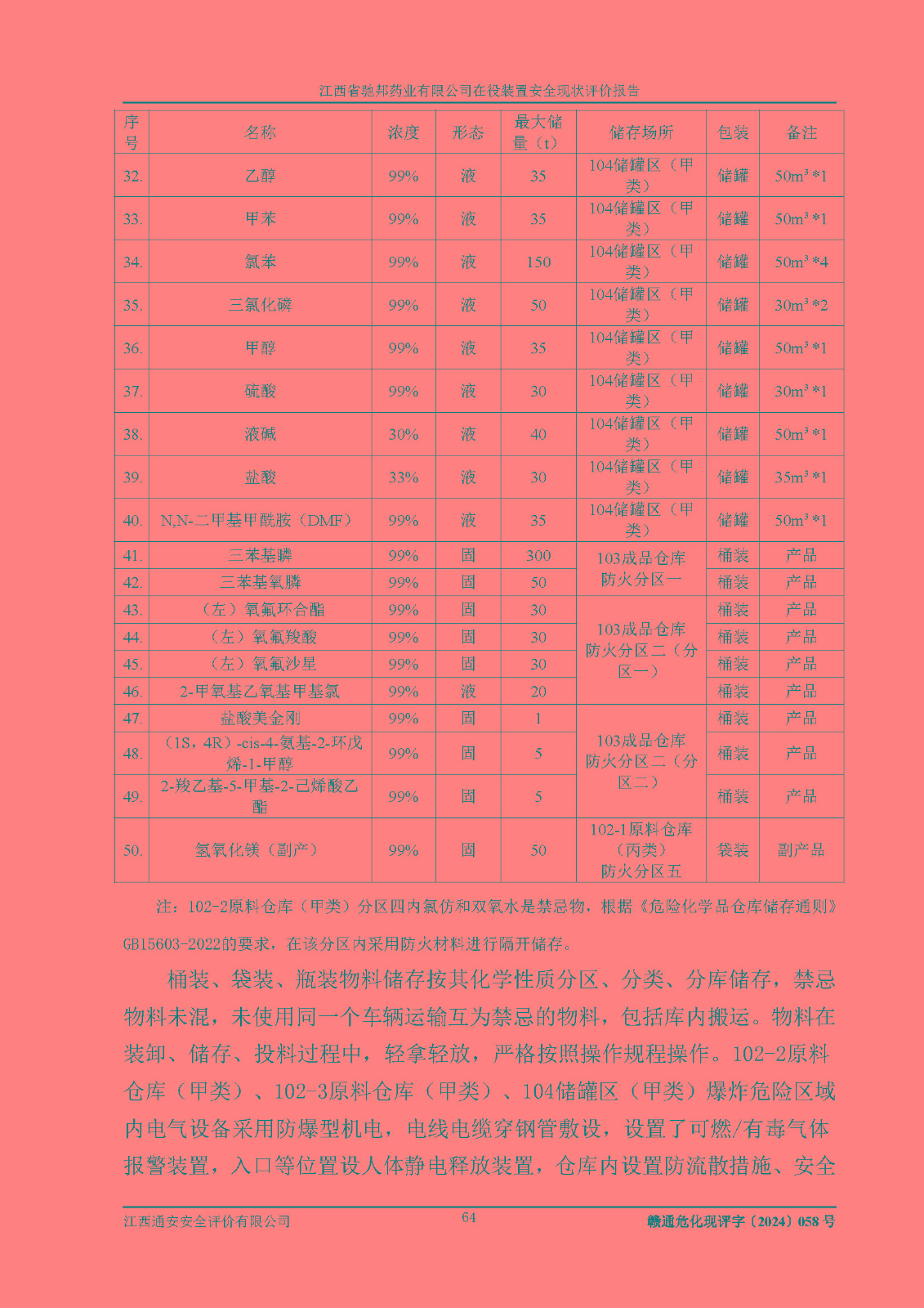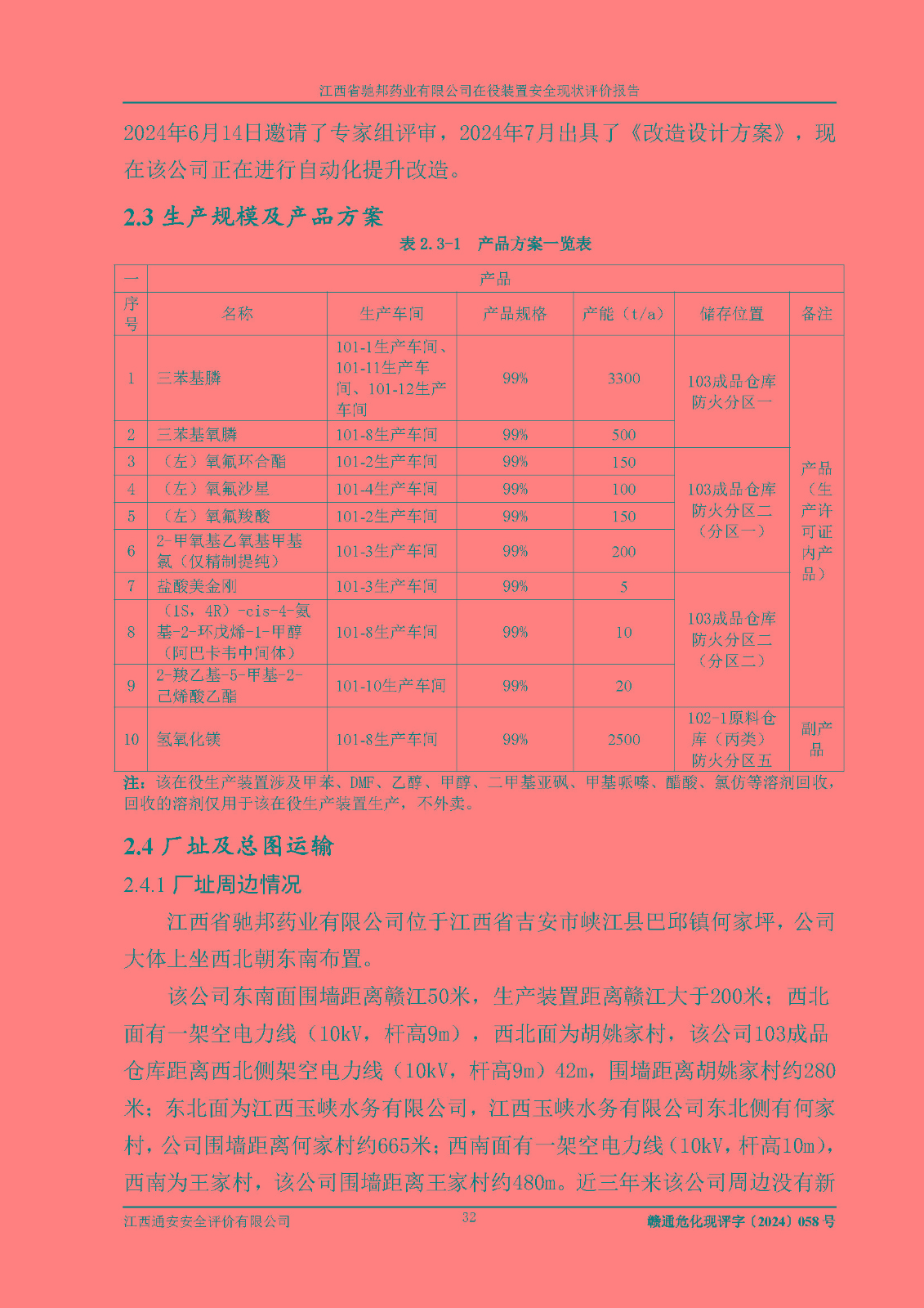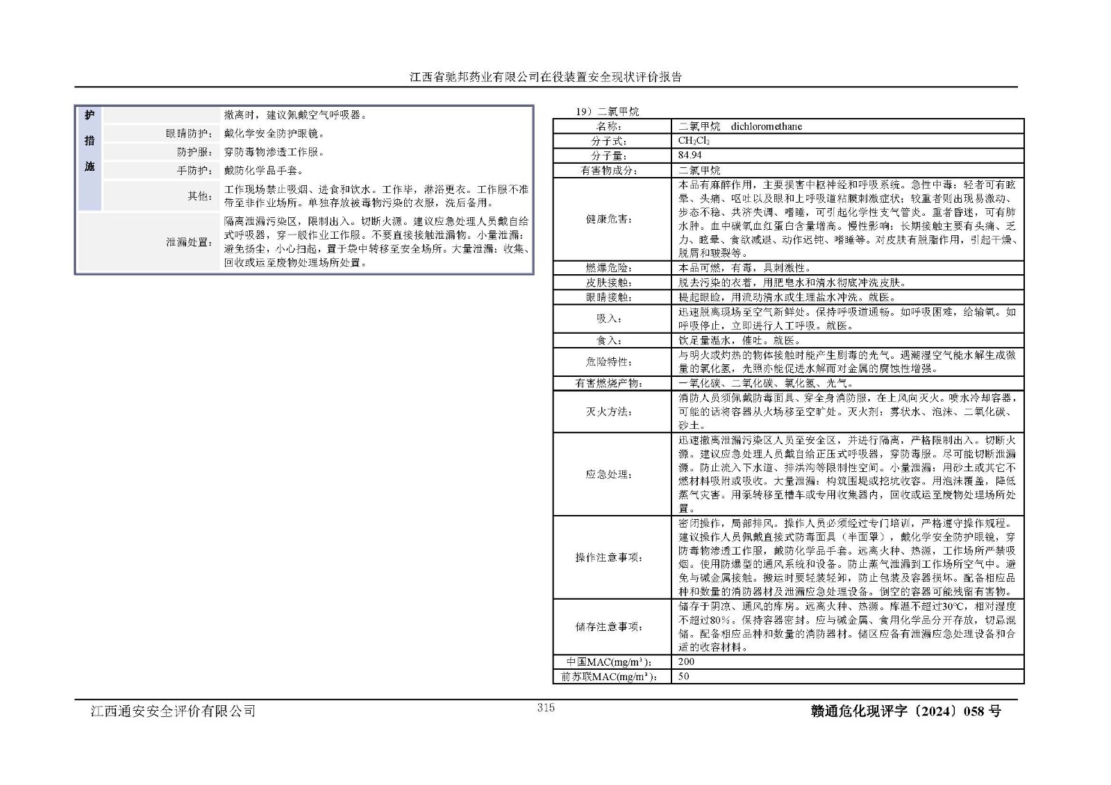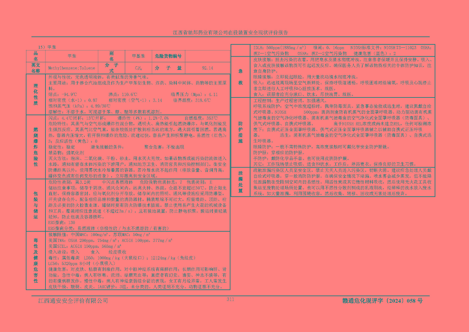 項目簡介 | 江西省馳邦藥業(yè)有限公司(以下簡稱“該公司”)成立于2007年9月21日,位于江西省吉安市峽江縣巴邱鎮(zhèn)何家坪,屬有限責任公司(自然人投資或控股),法定**人:徐小海,注冊資金:貳仟萬元整,經(jīng)營范圍:醫(yī)藥中間體生產(chǎn)銷售及進出口業(yè)務(涉及前置許可的憑許可證經(jīng)營)。占地面積約149322.9㎡,現(xiàn)有人員194人。 2022年3月24日該公司進行了延期換證,取得了新的《安全生產(chǎn)許可證》,許可證編號:(贛)WH安許證字〔2010〕573號,許可范圍:三苯基膦(3.3kt/a)、(左)氧氟環(huán)合酯(150t/a)、(左)氧氟沙星(100t/a)、(左)氧氟羧酸(150t/a)、鹽酸美金剛(5t/a)、(1S,4R)-cis-4-氨基-2-環(huán)戊烯-1-甲醇(10t/a,阿巴卡韋中間體)、2-甲氧基乙氧基甲基氯(200t/a,僅精制提純)、三苯基氧膦(500t/a)、2-羧乙基-5-甲基-2-己烯酸乙酯(20t/a),**期:2022年3月24日至2025年3月23日。 根據(jù)《危險化學品目錄》(2015版)和應急管理部 工業(yè)和信息化部 公安部 生態(tài)環(huán)境部 交通運輸部 農(nóng)業(yè)農(nóng)村部 衛(wèi)生健康委 市場監(jiān)管總局 鐵路局 民航局公告2022年第8號《決定調整《危險化學品目錄(2015版)》,將“1674柴油〔閉杯閃點≤60℃〕”調整為“1674柴油”》等文件規(guī)定,該在役生產(chǎn)裝置生產(chǎn)過程中涉及的四氫呋喃、甲苯、氯苯、三氯化磷、鎂屑、甲醇、硫酸、氫氧化鈉(片堿和液堿)、鹽酸、乙酸乙酯、乙醇、異戊醛、三正丙胺、正己烷、無水氟化鉀、三乙胺、冰醋酸、N,N-二甲基甲酰胺(DMF)、乙腈、氯仿、醋酸酐、雙氧水、二氯甲烷、氯化亞砜、三苯基膦(產(chǎn)品)、氮氣(壓縮)、柴油(發(fā)電機、叉車用)等屬于危險化學品。其中三氯甲烷、醋酸酐為第二類易制毒化學品,甲苯、硫酸、鹽酸為第三類易制毒化學品;甲醇、甲苯、三氯化磷、氯苯、乙酸乙酯、三氯甲烷屬于重點監(jiān)管的危險化學品;甲醇、乙醇屬于特別管控危險化學品;三氯化磷、氯化亞砜為第三類監(jiān)控化學品;1-溴-3,5-二甲基金剛烷、四氫呋喃、甲基哌嗪、氯仿、醋酸酐、異戊醛、丙二酸二乙酯、四氟苯甲酰氯(四氟)、三乙胺、二甲基亞砜、乙二醇、乙酸乙酯、乙醇、甲苯、甲醇為第四類監(jiān)控化學品;鎂屑、雙氧水屬于易制爆化學品;氟化鉀屬于高毒物品。 | |||