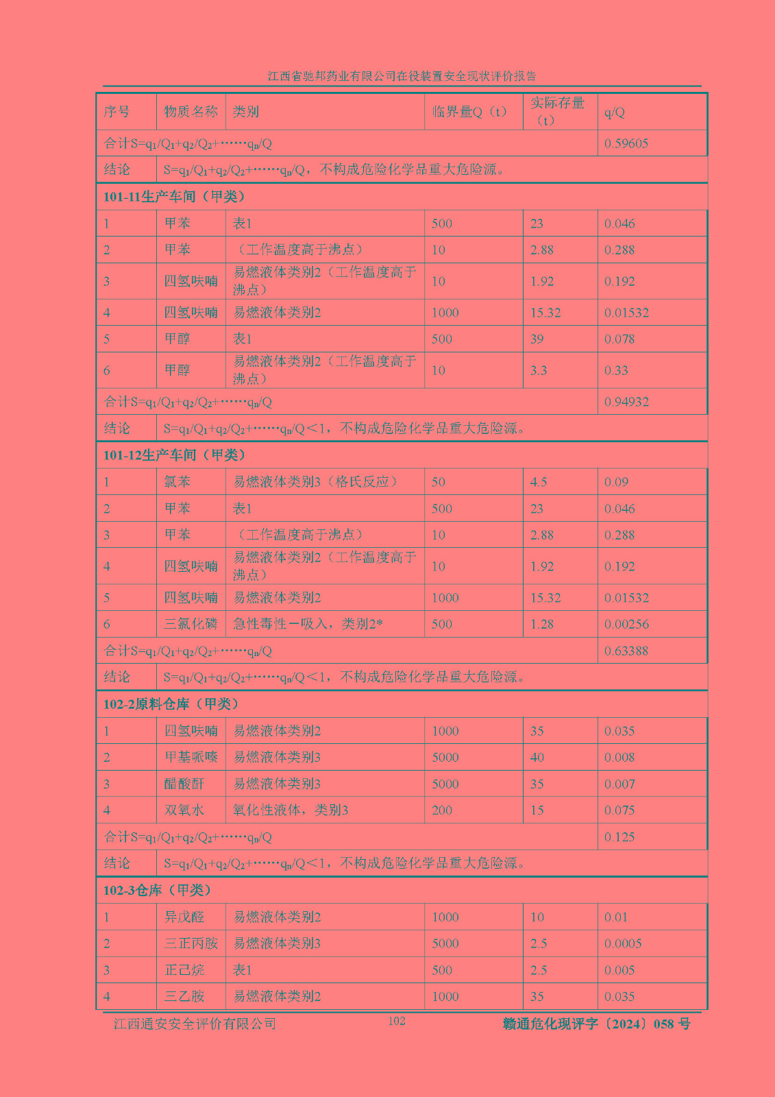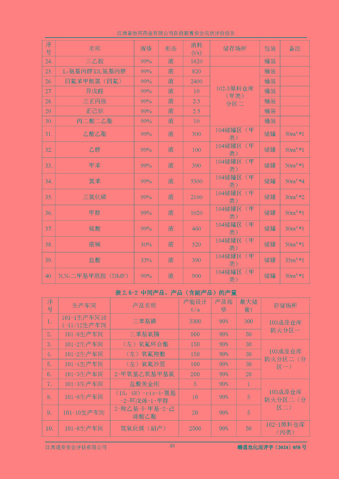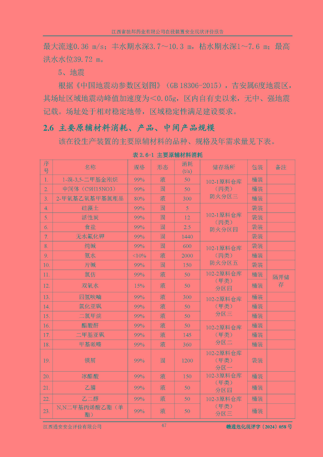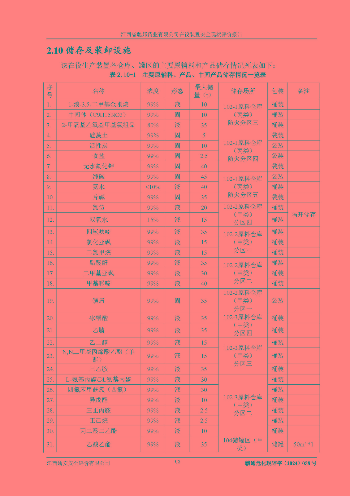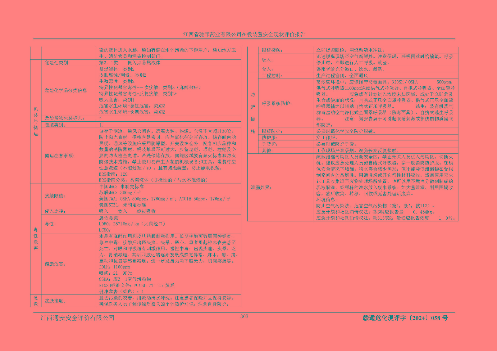 項目簡介 | 江西省馳邦藥業(yè)有限公司(以下簡稱“該公司”)成立于2007年9月21日,位于江西省吉安市峽江縣巴邱鎮(zhèn)何家坪,屬有限責任公司(自然人投資或控股),法定**人:徐小海,注冊資金:貳仟萬元整,經(jīng)營范圍:醫(yī)藥中間體生產(chǎn)銷售及進出口業(yè)務(涉及前置許可的憑許可證經(jīng)營)。占地面積約149322.9㎡,現(xiàn)有人員194人。 2022年3月24日該公司進行了延期換證,取得了新的《安全生產(chǎn)許可證》,許可證編號:(贛)WH安許證字〔2010〕573號,許可范圍:三苯基膦(3.3kt/a)、(左)氧氟環(huán)合酯(150t/a)、(左)氧氟沙星(100t/a)、(左)氧氟羧酸(150t/a)、鹽酸美金剛(5t/a)、(1S,4R)-cis-4-氨基-2-環(huán)戊烯-1-甲醇(10t/a,阿巴卡韋中間體)、2-甲氧基乙氧基甲基氯(200t/a,僅精制提純)、三苯基氧膦(500t/a)、2-羧乙基-5-甲基-2-己烯酸乙酯(20t/a),**期:2022年3月24日至2025年3月23日。 根據(jù)《危險化學品目錄》(2015版)和應急管理部 工業(yè)和信息化部 公安部 生態(tài)環(huán)境部 交通運輸部 農(nóng)業(yè)農(nóng)村部 衛(wèi)生健康委 市場監(jiān)管總局 鐵路局 民航局公告2022年第8號《決定調整《危險化學品目錄(2015版)》,將“1674柴油〔閉杯閃點≤60℃〕”調整為“1674柴油”》等文件規(guī)定,該在役生產(chǎn)裝置生產(chǎn)過程中涉及的四氫呋喃、甲苯、氯苯、三氯化磷、鎂屑、甲醇、硫酸、氫氧化鈉(片堿和液堿)、鹽酸、乙酸乙酯、乙醇、異戊醛、三正丙胺、正己烷、無水氟化鉀、三乙胺、冰醋酸、N,N-二甲基甲酰胺(DMF)、乙腈、氯仿、醋酸酐、雙氧水、二氯甲烷、氯化亞砜、三苯基膦(產(chǎn)品)、氮氣(壓縮)、柴油(發(fā)電機、叉車用)等屬于危險化學品。其中三氯甲烷、醋酸酐為第二類易制毒化學品,甲苯、硫酸、鹽酸為第三類易制毒化學品;甲醇、甲苯、三氯化磷、氯苯、乙酸乙酯、三氯甲烷屬于重點監(jiān)管的危險化學品;甲醇、乙醇屬于特別管控危險化學品;三氯化磷、氯化亞砜為第三類監(jiān)控化學品;1-溴-3,5-二甲基金剛烷、四氫呋喃、甲基哌嗪、氯仿、醋酸酐、異戊醛、丙二酸二乙酯、四氟苯甲酰氯(四氟)、三乙胺、二甲基亞砜、乙二醇、乙酸乙酯、乙醇、甲苯、甲醇為第四類監(jiān)控化學品;鎂屑、雙氧水屬于易制爆化學品;氟化鉀屬于高毒物品。 | |||