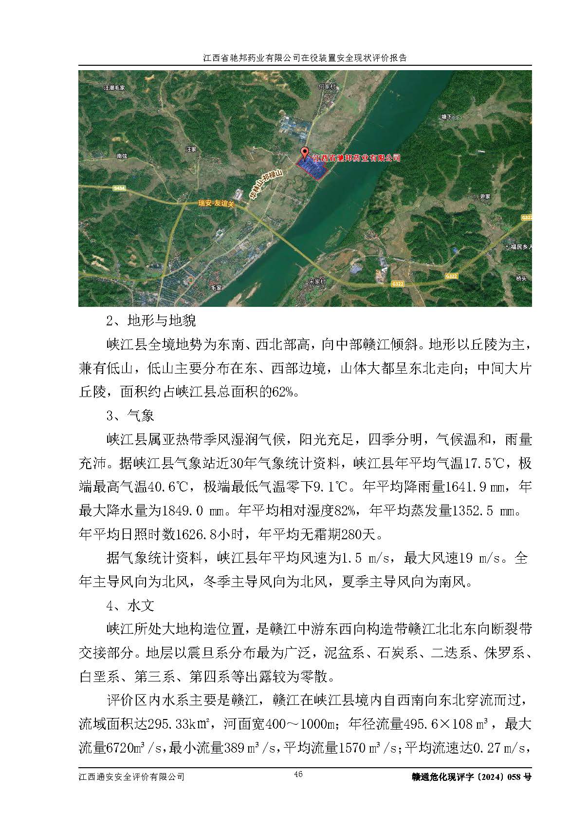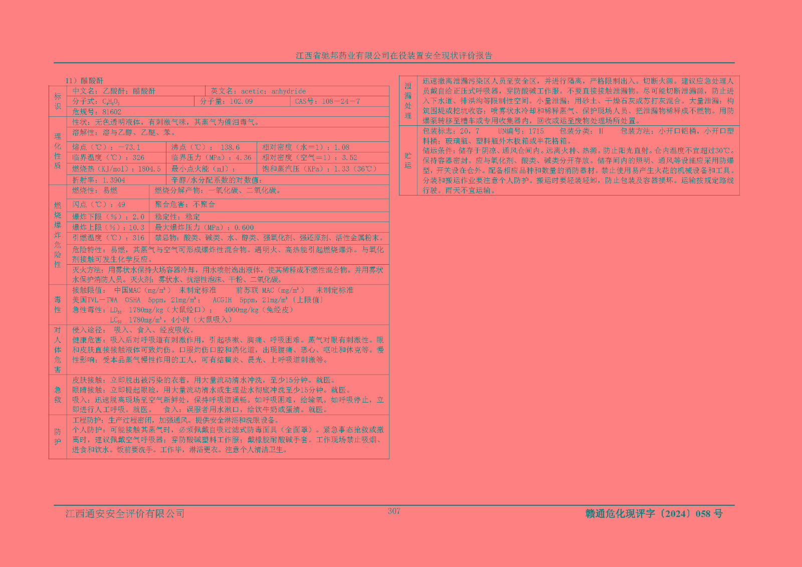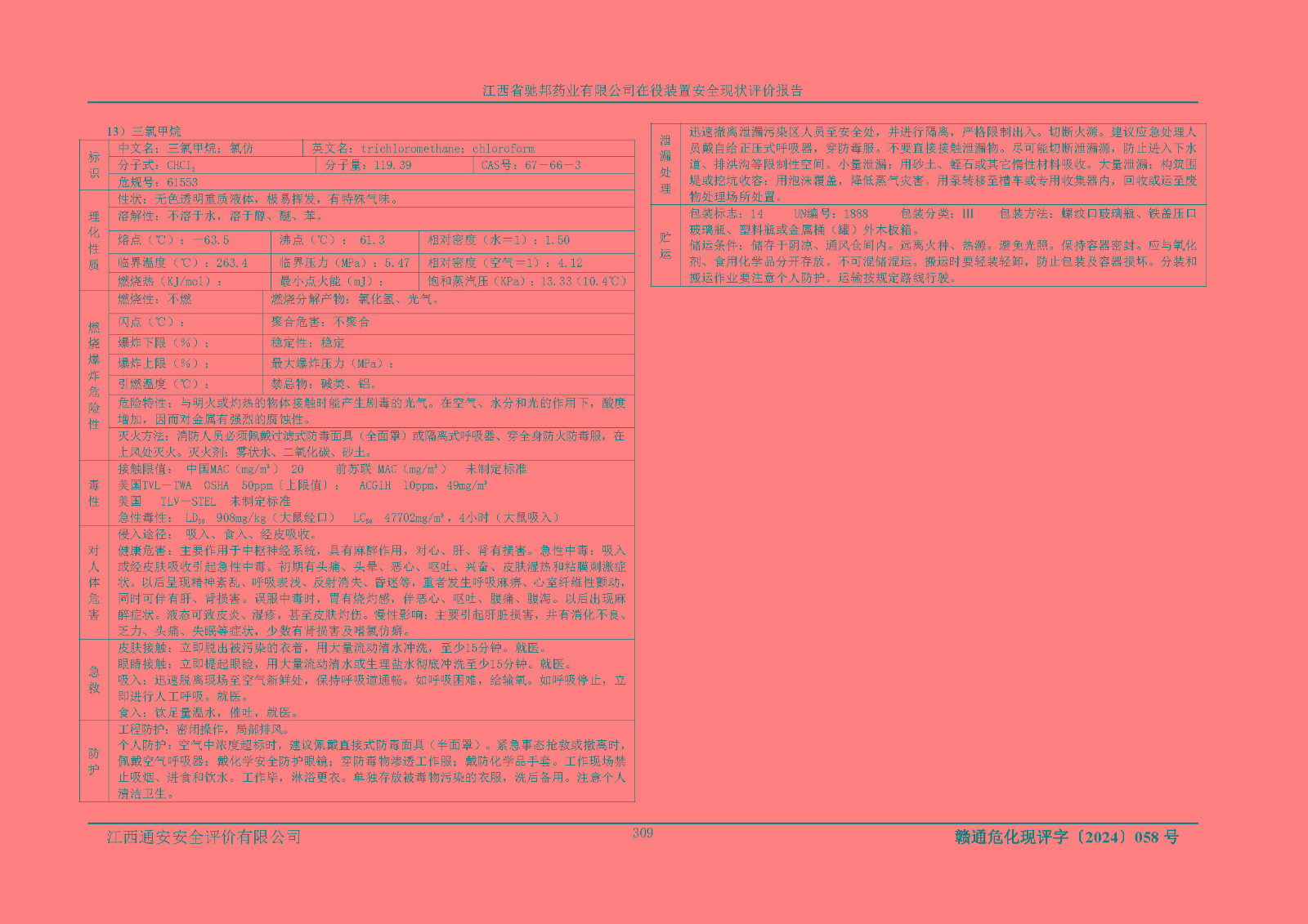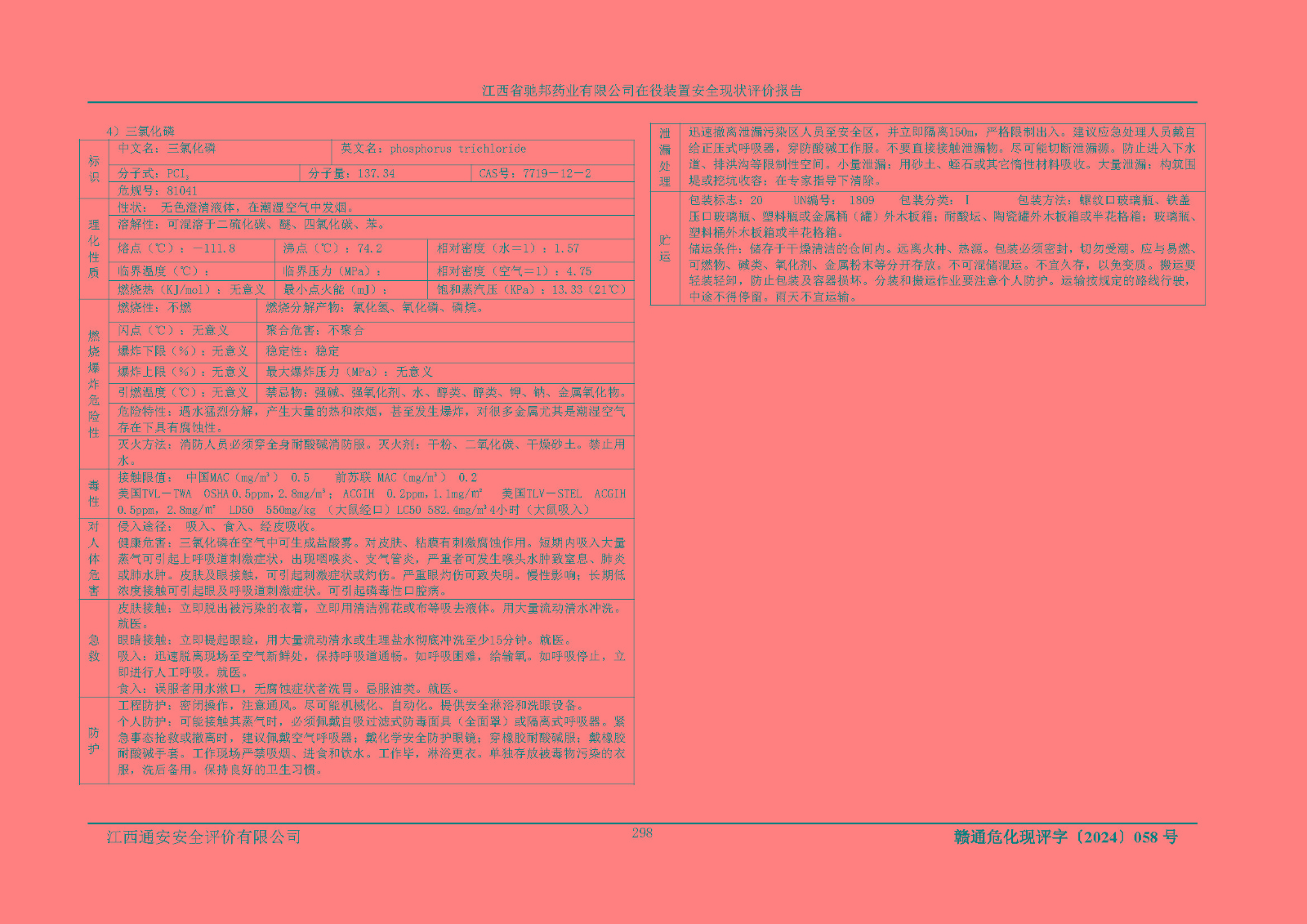 項目簡介 | 江西省馳邦藥業(yè)有限公司(以下簡稱“該公司”)成立于2007年9月21日,位于江西省吉安市峽江縣巴邱鎮(zhèn)何家坪,屬有限責任公司(自然人投資或控股),法定**人:徐小海,注冊資金:貳仟萬元整,經(jīng)營范圍:醫(yī)藥中間體生產(chǎn)銷售及進出口業(yè)務(涉及前置許可的憑許可證經(jīng)營)。占地面積約149322.9㎡,現(xiàn)有人員194人。 2022年3月24日該公司進行了延期換證,取得了新的《安全生產(chǎn)許可證》,許可證編號:(贛)WH安許證字〔2010〕573號,許可范圍:三苯基膦(3.3kt/a)、(左)氧氟環(huán)合酯(150t/a)、(左)氧氟沙星(100t/a)、(左)氧氟羧酸(150t/a)、鹽酸美金剛(5t/a)、(1S,4R)-cis-4-氨基-2-環(huán)戊烯-1-甲醇(10t/a,阿巴卡韋中間體)、2-甲氧基乙氧基甲基氯(200t/a,僅精制提純)、三苯基氧膦(500t/a)、2-羧乙基-5-甲基-2-己烯酸乙酯(20t/a),**期:2022年3月24日至2025年3月23日。 根據(jù)《危險化學品目錄》(2015版)和應急管理部 工業(yè)和信息化部 公安部 生態(tài)環(huán)境部 交通運輸部 農(nóng)業(yè)農(nóng)村部 衛(wèi)生健康委 市場監(jiān)管總局 鐵路局 民航局公告2022年第8號《決定調整《危險化學品目錄(2015版)》,將“1674柴油〔閉杯閃點≤60℃〕”調整為“1674柴油”》等文件規(guī)定,該在役生產(chǎn)裝置生產(chǎn)過程中涉及的四氫呋喃、甲苯、氯苯、三氯化磷、鎂屑、甲醇、硫酸、氫氧化鈉(片堿和液堿)、鹽酸、乙酸乙酯、乙醇、異戊醛、三正丙胺、正己烷、無水氟化鉀、三乙胺、冰醋酸、N,N-二甲基甲酰胺(DMF)、乙腈、氯仿、醋酸酐、雙氧水、二氯甲烷、氯化亞砜、三苯基膦(產(chǎn)品)、氮氣(壓縮)、柴油(發(fā)電機、叉車用)等屬于危險化學品。其中三氯甲烷、醋酸酐為第二類易制毒化學品,甲苯、硫酸、鹽酸為第三類易制毒化學品;甲醇、甲苯、三氯化磷、氯苯、乙酸乙酯、三氯甲烷屬于重點監(jiān)管的危險化學品;甲醇、乙醇屬于特別管控危險化學品;三氯化磷、氯化亞砜為第三類監(jiān)控化學品;1-溴-3,5-二甲基金剛烷、四氫呋喃、甲基哌嗪、氯仿、醋酸酐、異戊醛、丙二酸二乙酯、四氟苯甲酰氯(四氟)、三乙胺、二甲基亞砜、乙二醇、乙酸乙酯、乙醇、甲苯、甲醇為第四類監(jiān)控化學品;鎂屑、雙氧水屬于易制爆化學品;氟化鉀屬于高毒物品。 | |||