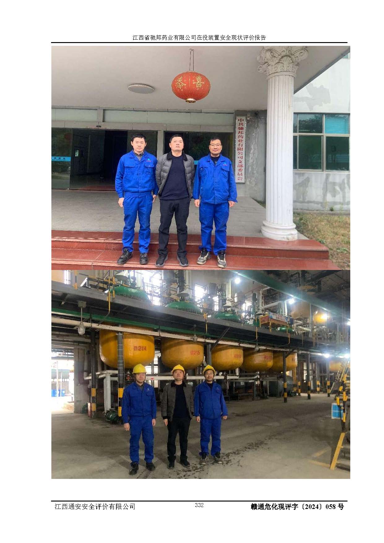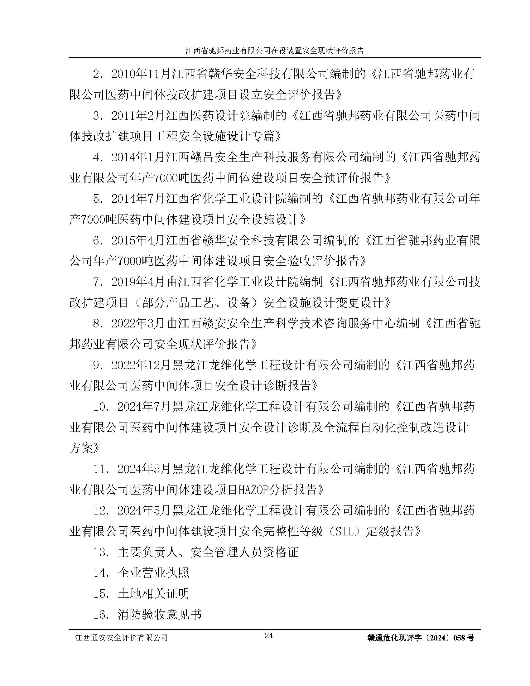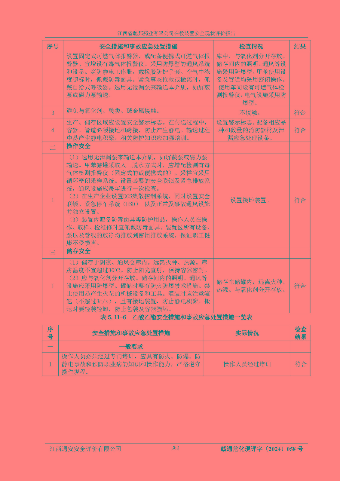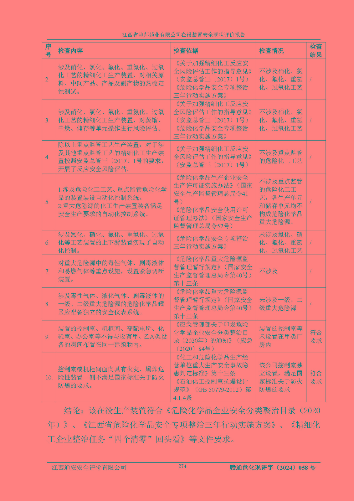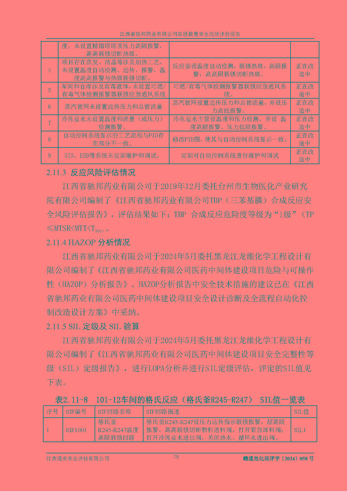 評價結論 | 評價結論:本報告認為,江西省馳邦藥業(yè)有限公司在役裝置現(xiàn)場情況與原有安全設施設計圖紙一致,PLC系統(tǒng)、SIS系統(tǒng)滿足原有安全設施設計要求且運行正常,有關從業(yè)人員資質、安全設施及安全管理符合法律、法規(guī)、標準的要求,安全風險是可以控制的,其風險程度是可以接受的,安全設施符合安全生產(chǎn)條件,能夠滿足安全生產(chǎn)的要求。 | |||