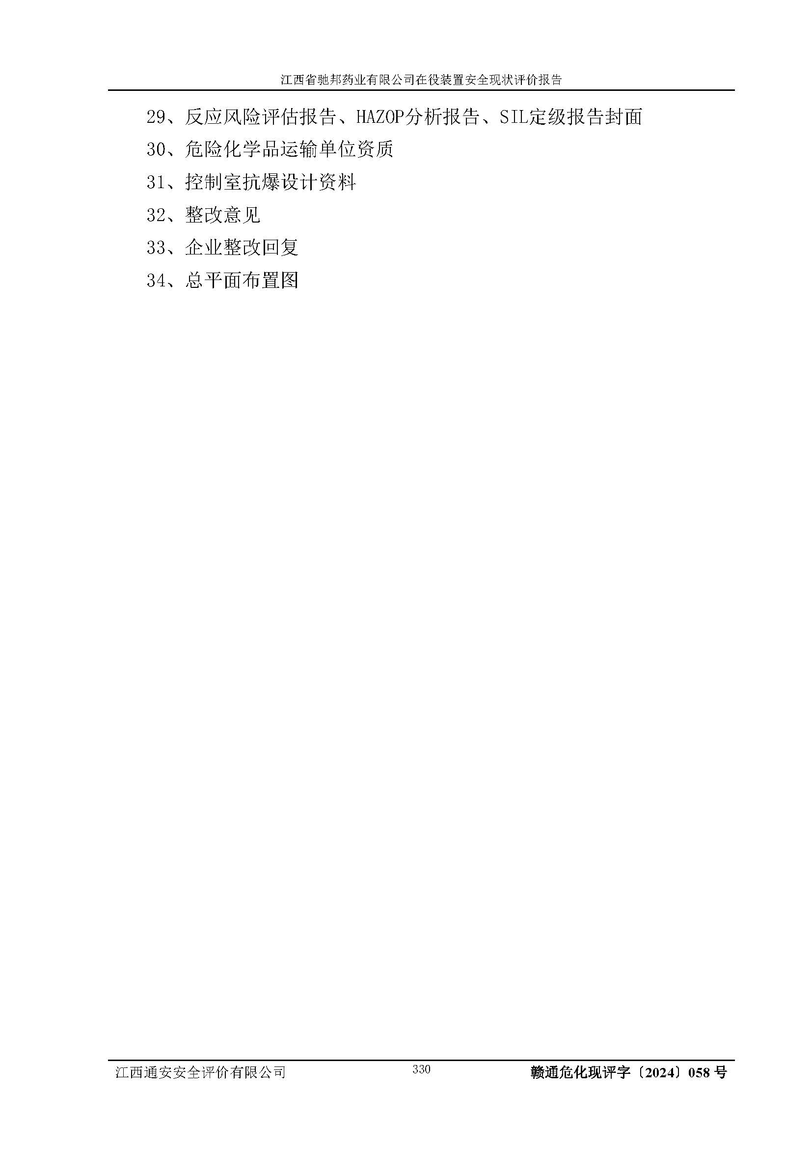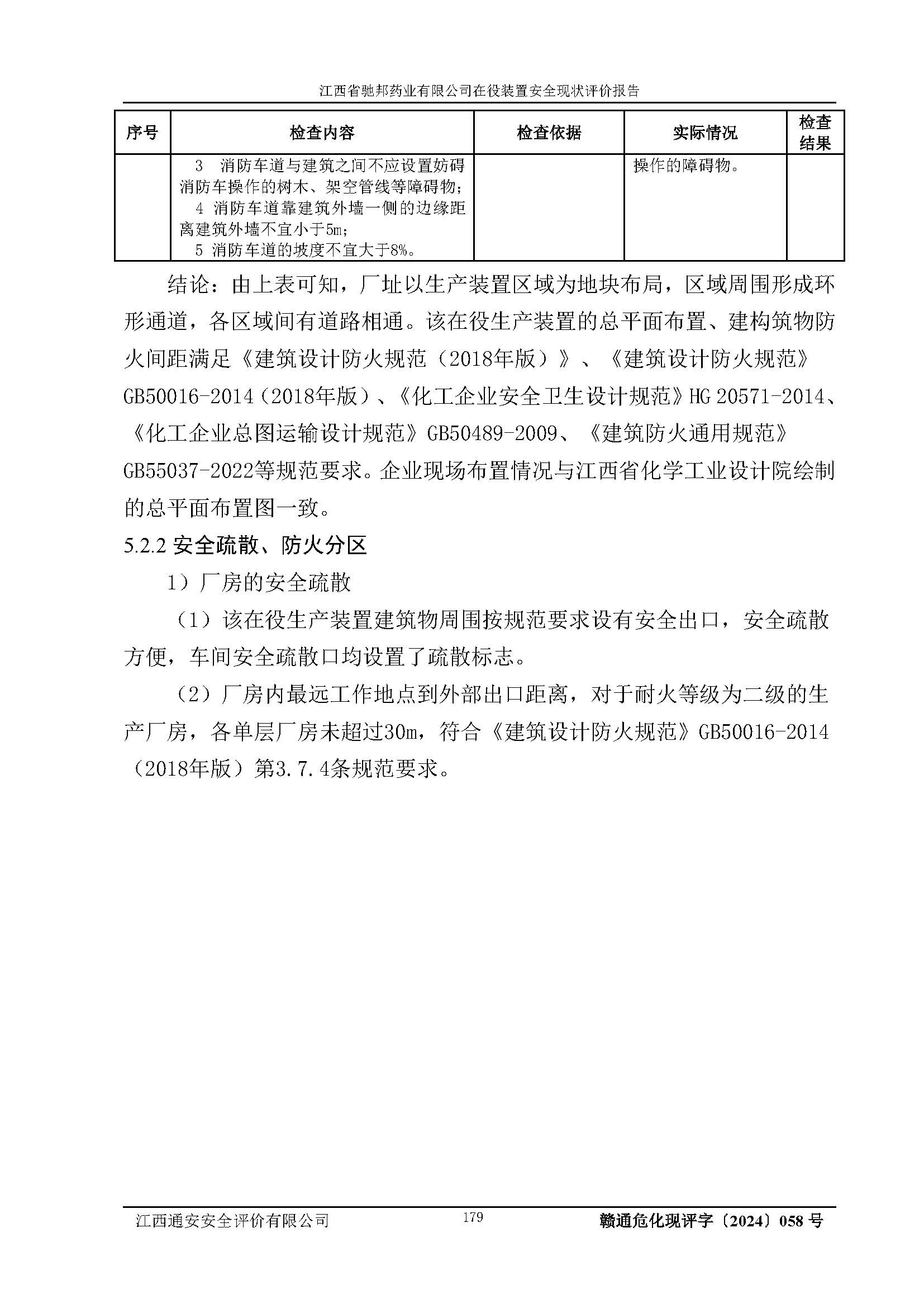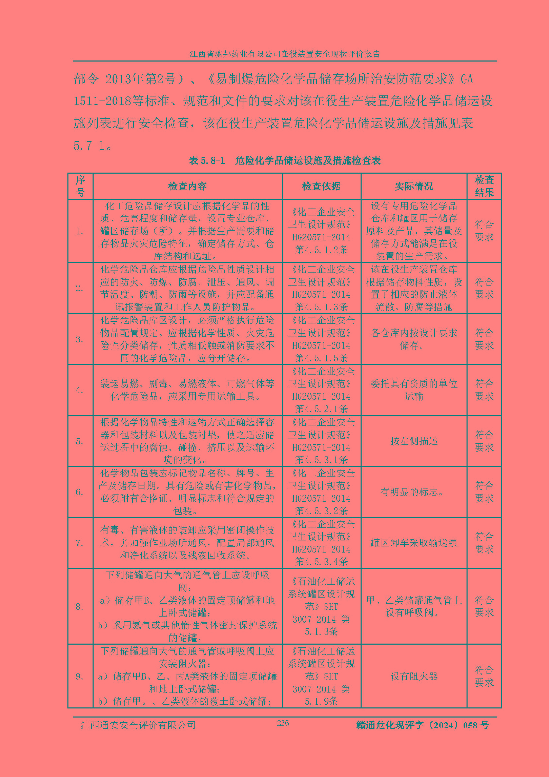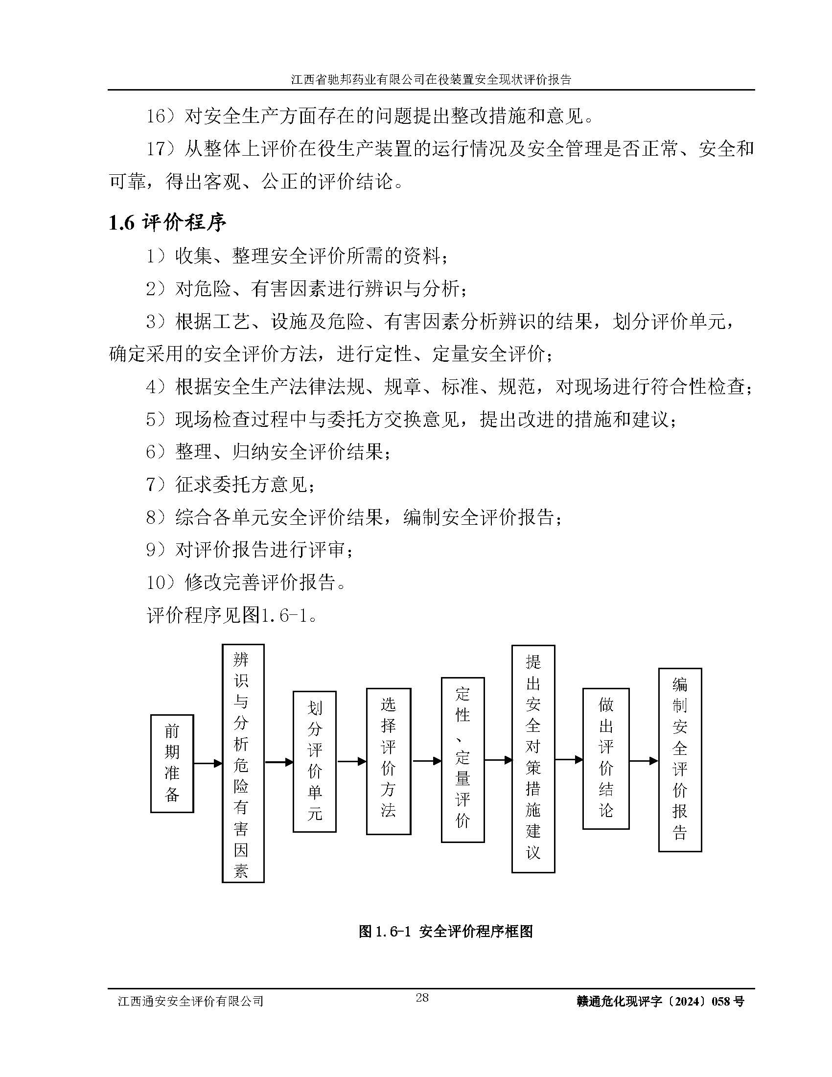 評價結論 | 評價結論:本報告認為,江西省馳邦藥業(yè)有限公司在役裝置現(xiàn)場情況與原有安全設施設計圖紙一致,PLC系統(tǒng)、SIS系統(tǒng)滿足原有安全設施設計要求且運行正常,有關從業(yè)人員資質、安全設施及安全管理符合法律、法規(guī)、標準的要求,安全風險是可以控制的,其風險程度是可以接受的,安全設施符合安全生產(chǎn)條件,能夠滿足安全生產(chǎn)的要求。 | |||