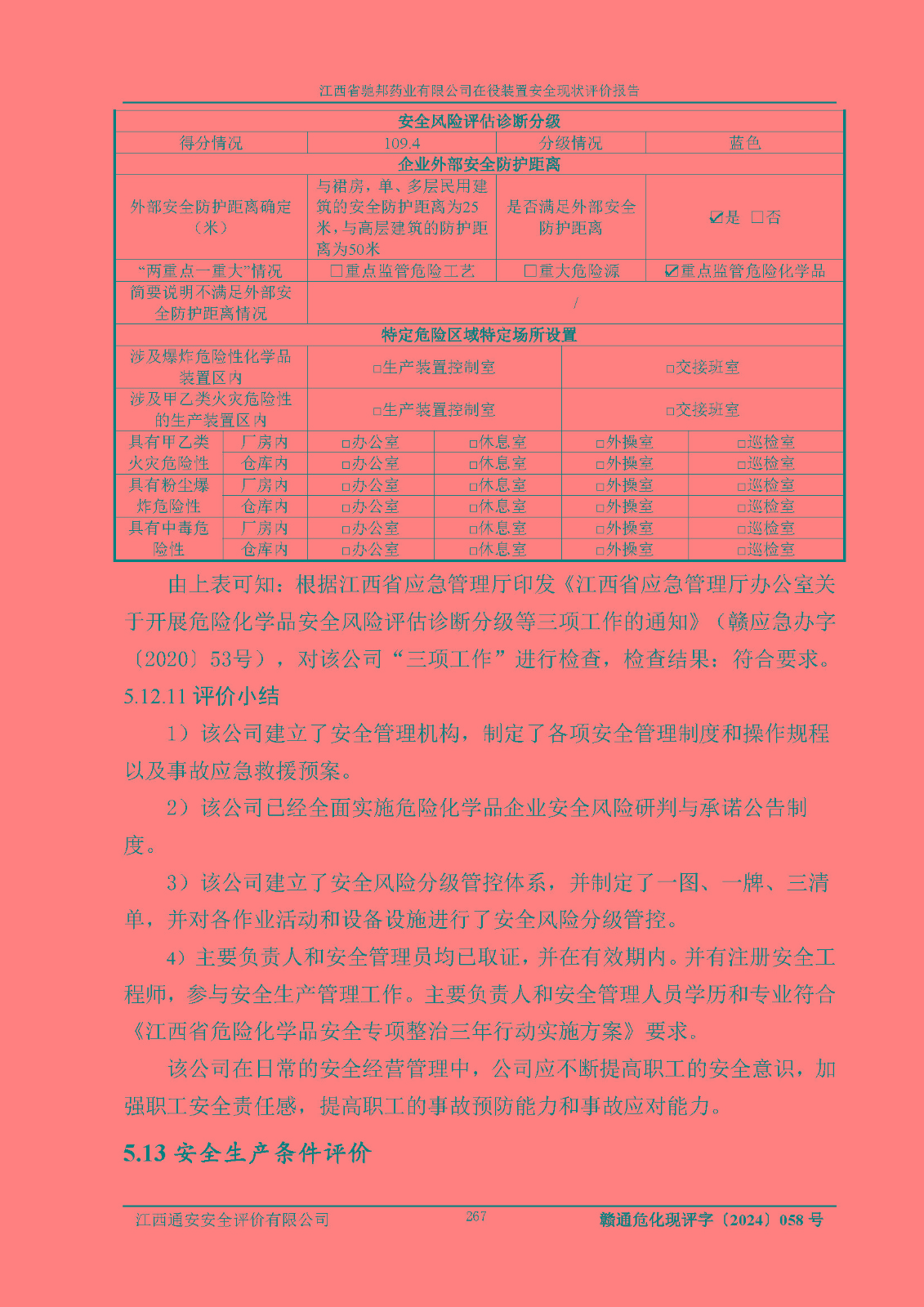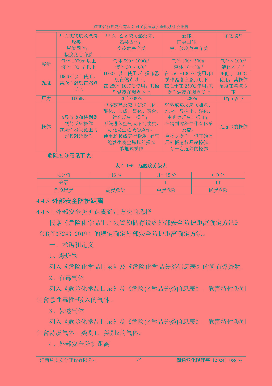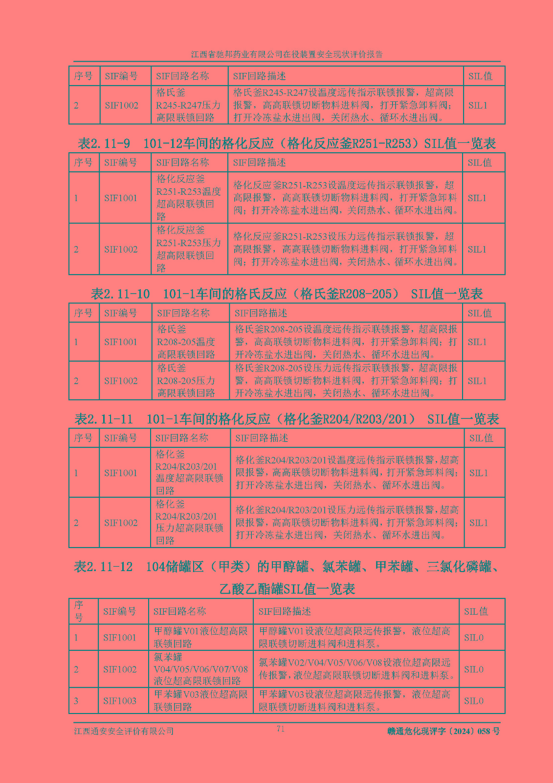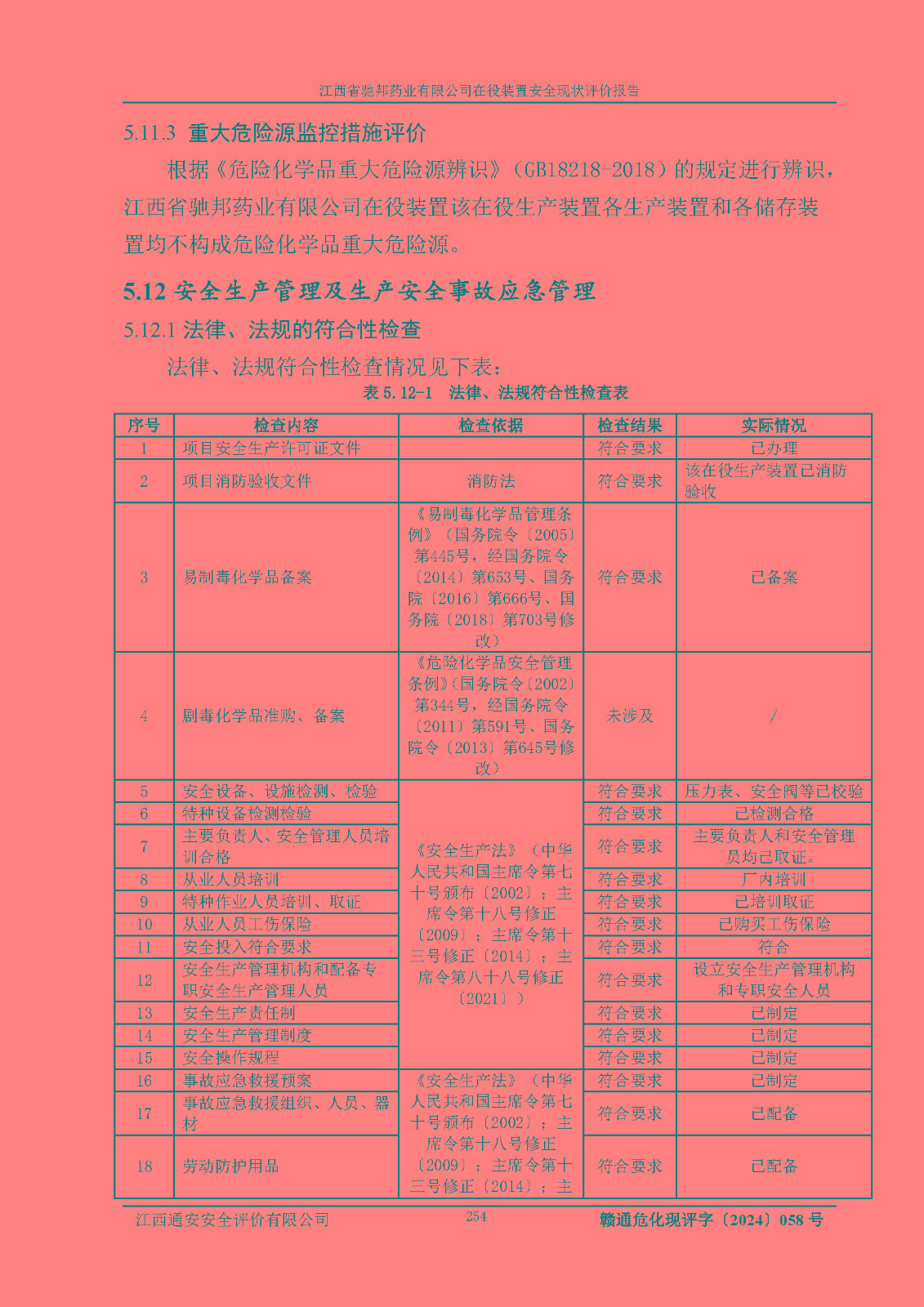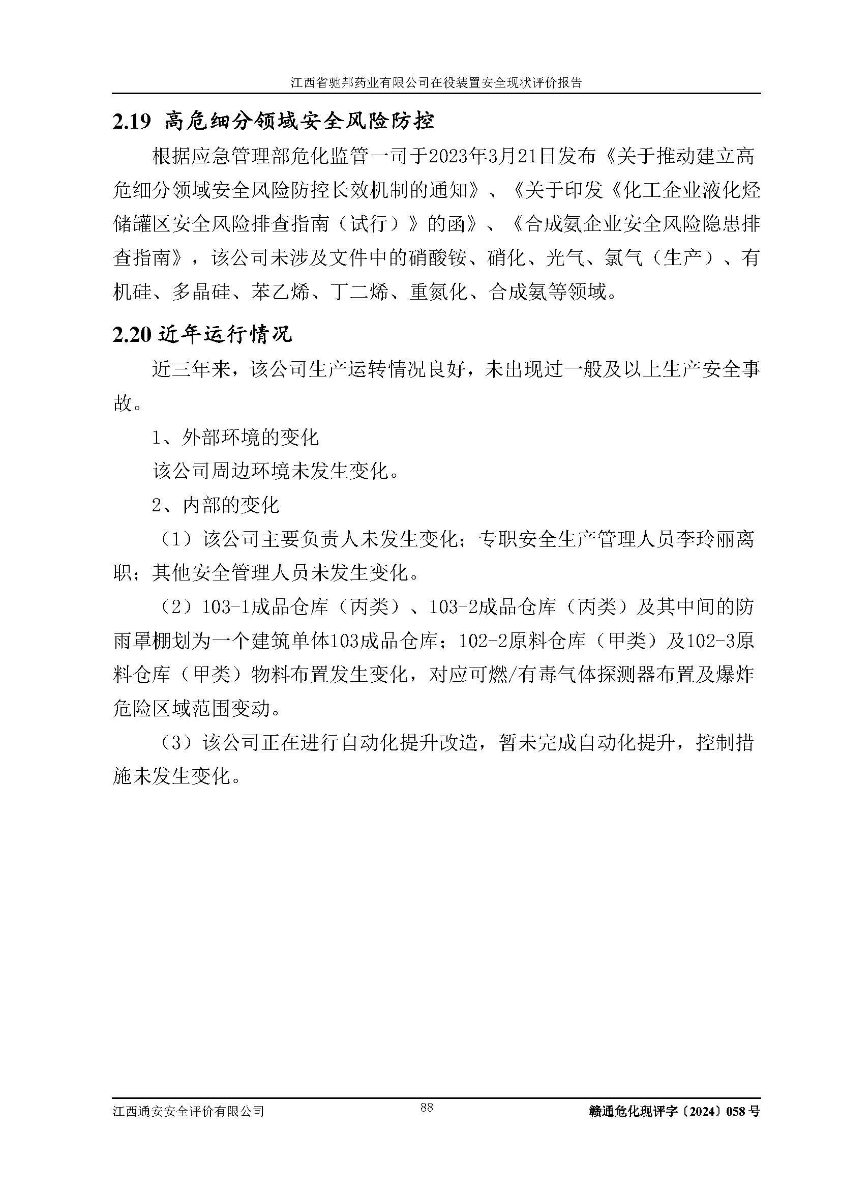 評價結論 | 評價結論:本報告認為,江西省馳邦藥業(yè)有限公司在役裝置現(xiàn)場情況與原有安全設施設計圖紙一致,PLC系統(tǒng)、SIS系統(tǒng)滿足原有安全設施設計要求且運行正常,有關從業(yè)人員資質、安全設施及安全管理符合法律、法規(guī)、標準的要求,安全風險是可以控制的,其風險程度是可以接受的,安全設施符合安全生產(chǎn)條件,能夠滿足安全生產(chǎn)的要求。 | |||