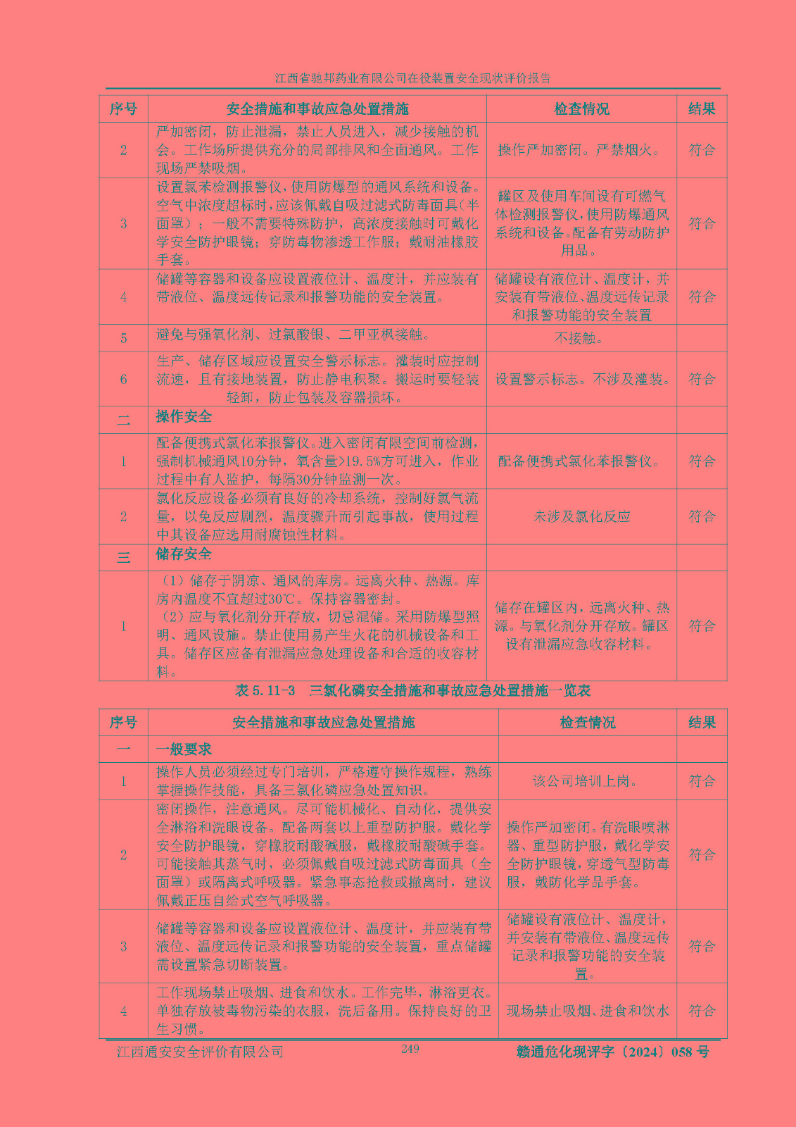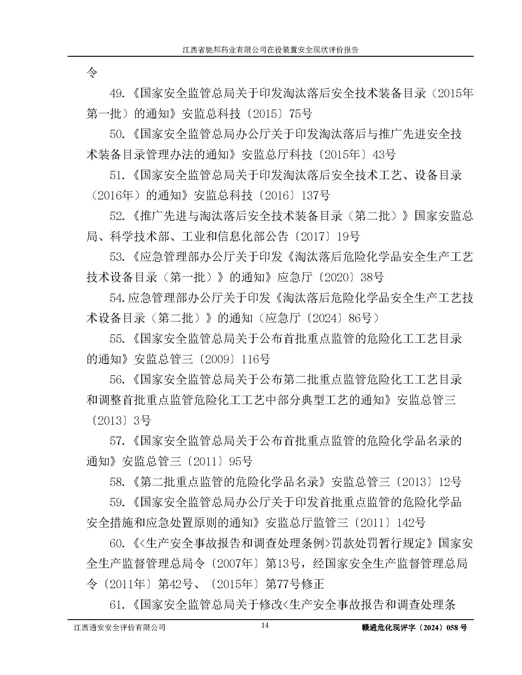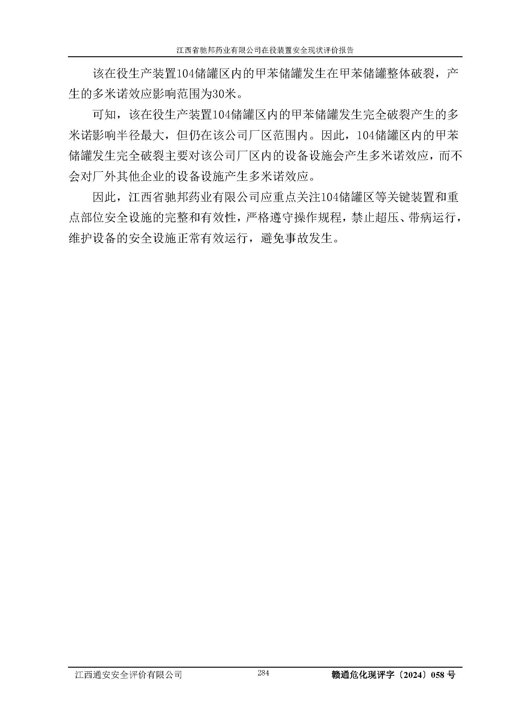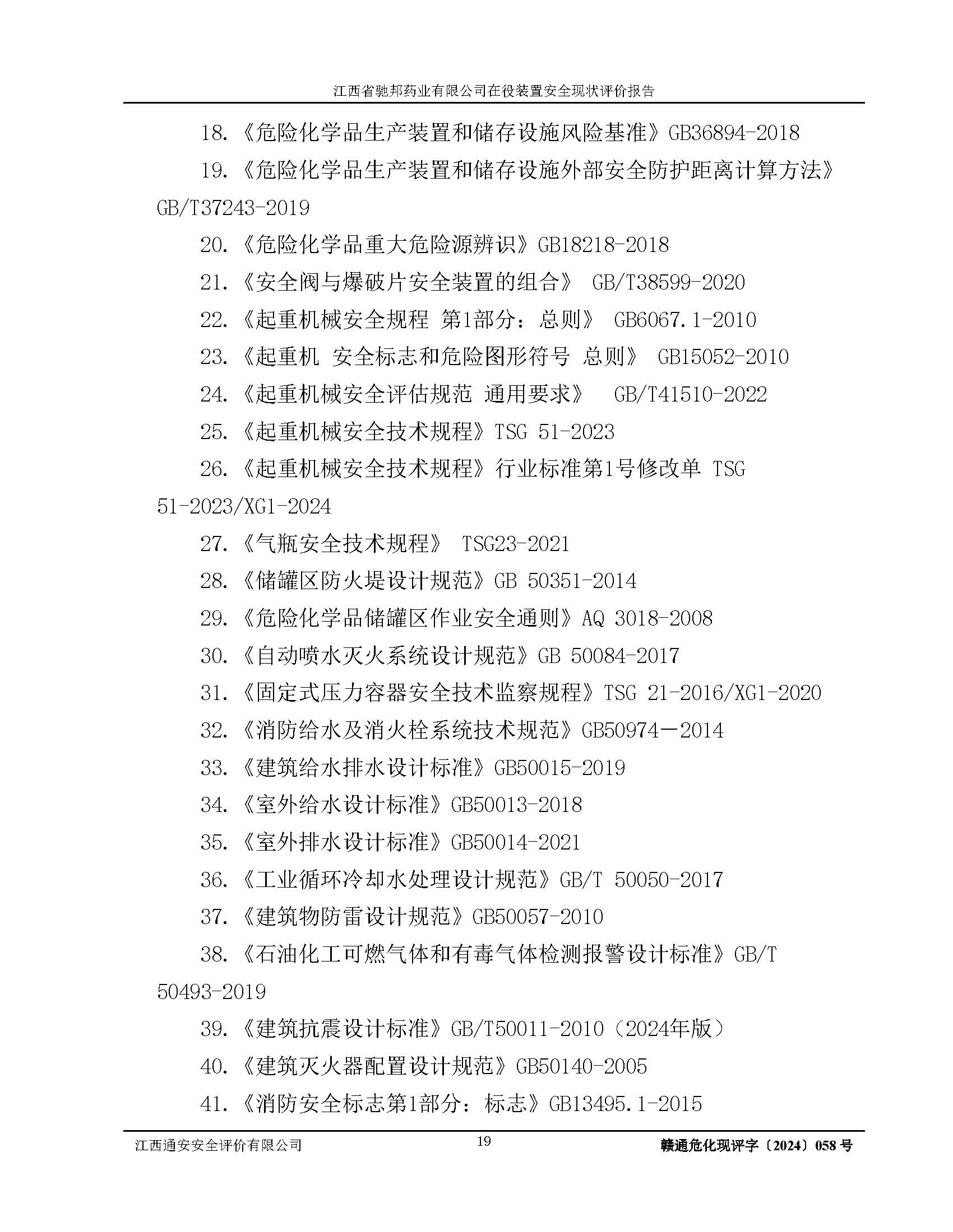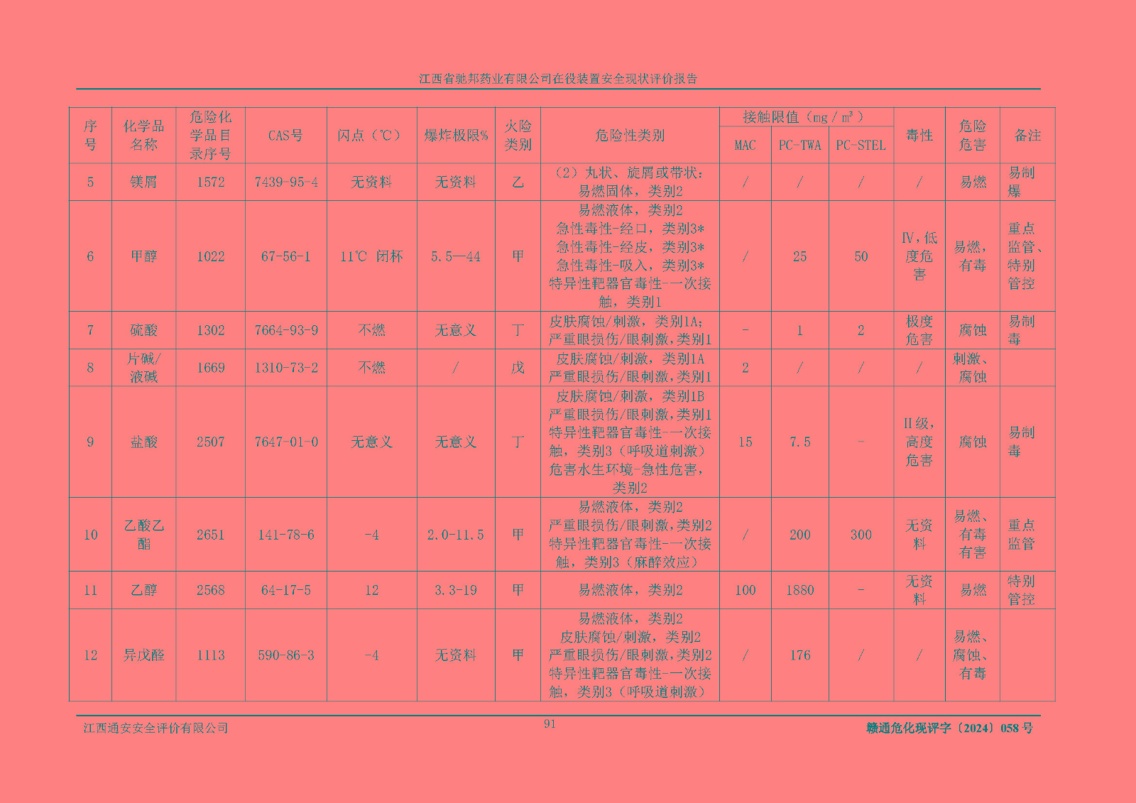 評價結論 | 評價結論:本報告認為,江西省馳邦藥業(yè)有限公司在役裝置現(xiàn)場情況與原有安全設施設計圖紙一致,PLC系統(tǒng)、SIS系統(tǒng)滿足原有安全設施設計要求且運行正常,有關從業(yè)人員資質、安全設施及安全管理符合法律、法規(guī)、標準的要求,安全風險是可以控制的,其風險程度是可以接受的,安全設施符合安全生產(chǎn)條件,能夠滿足安全生產(chǎn)的要求。 | |||