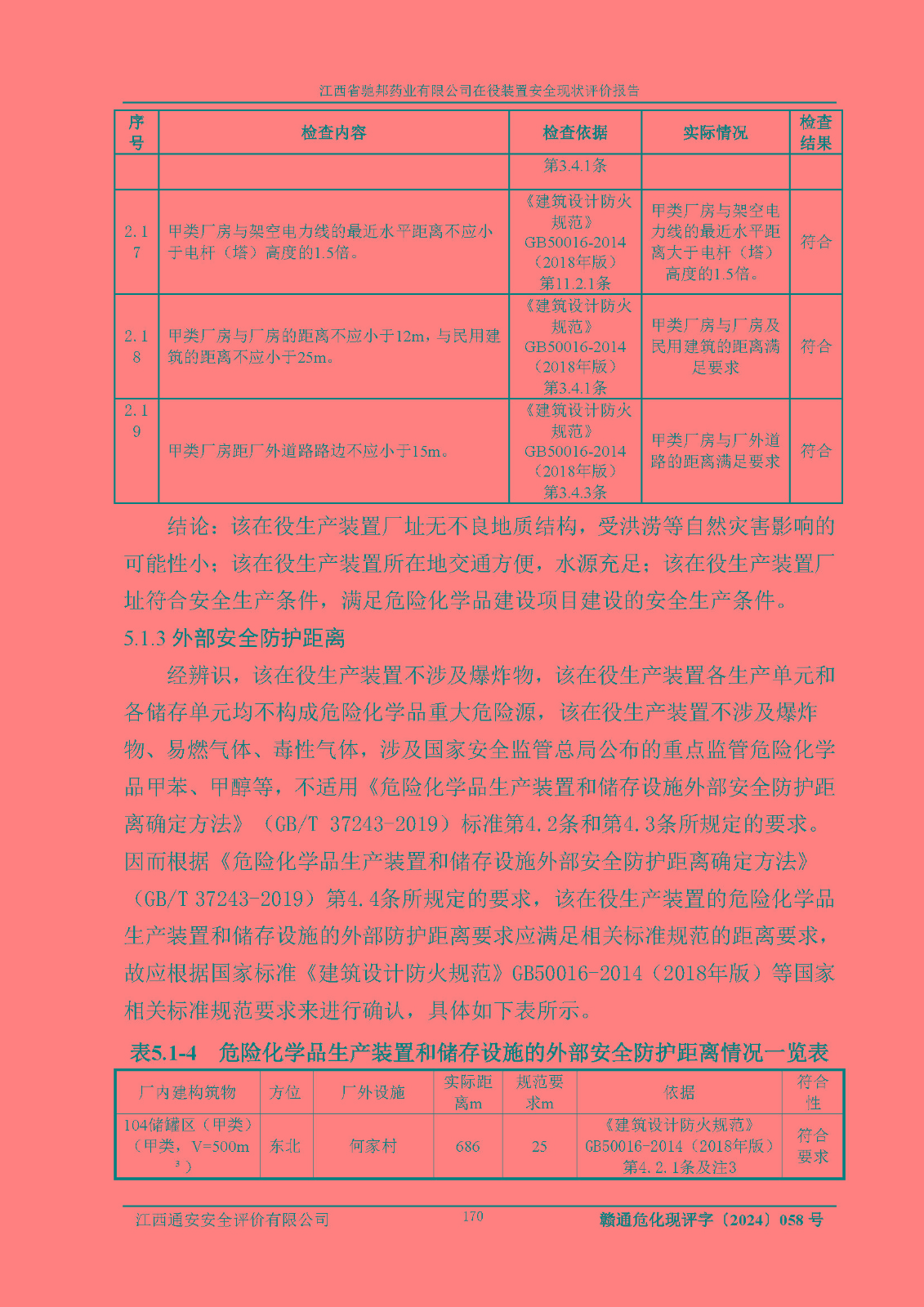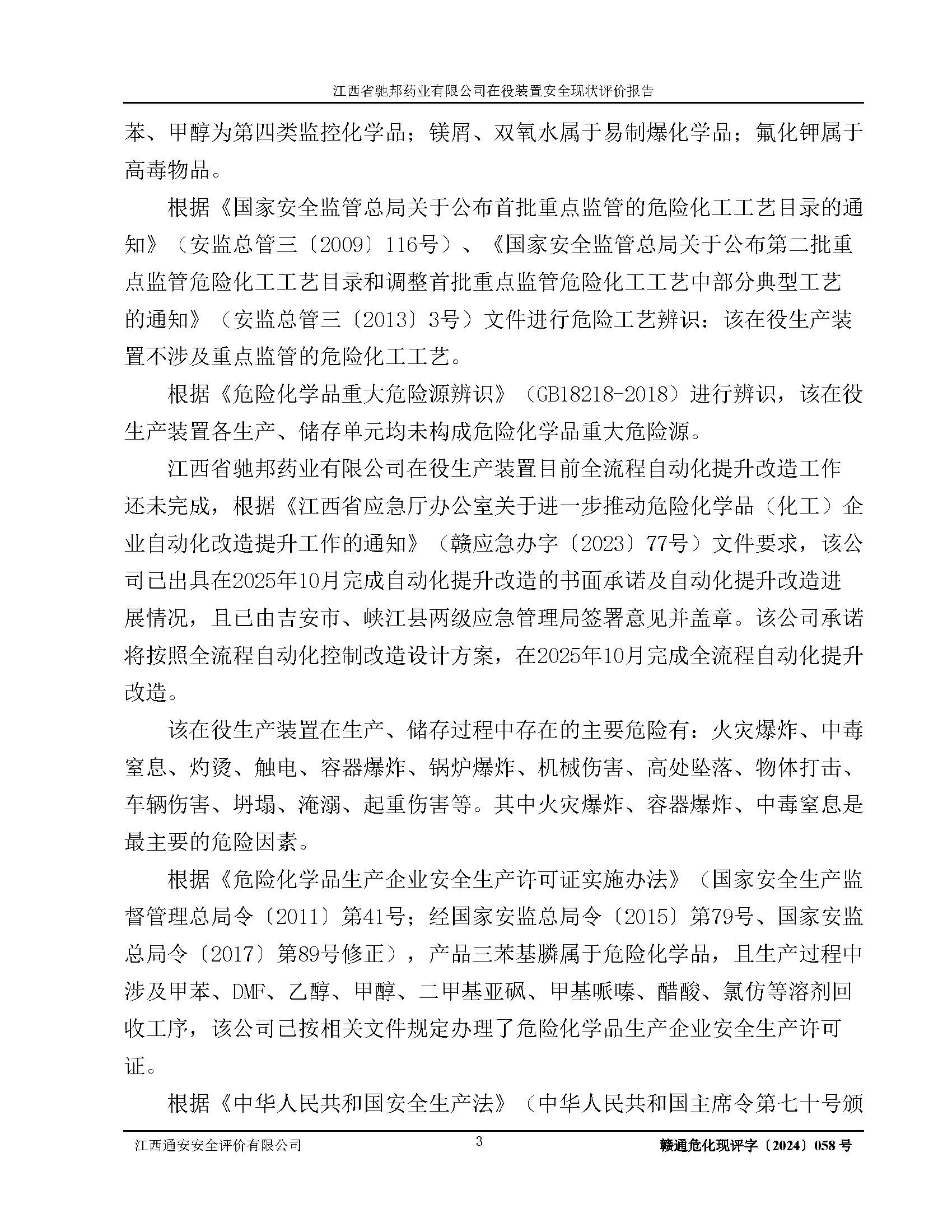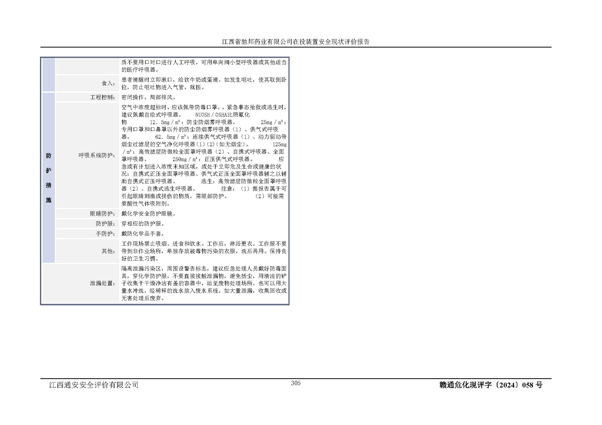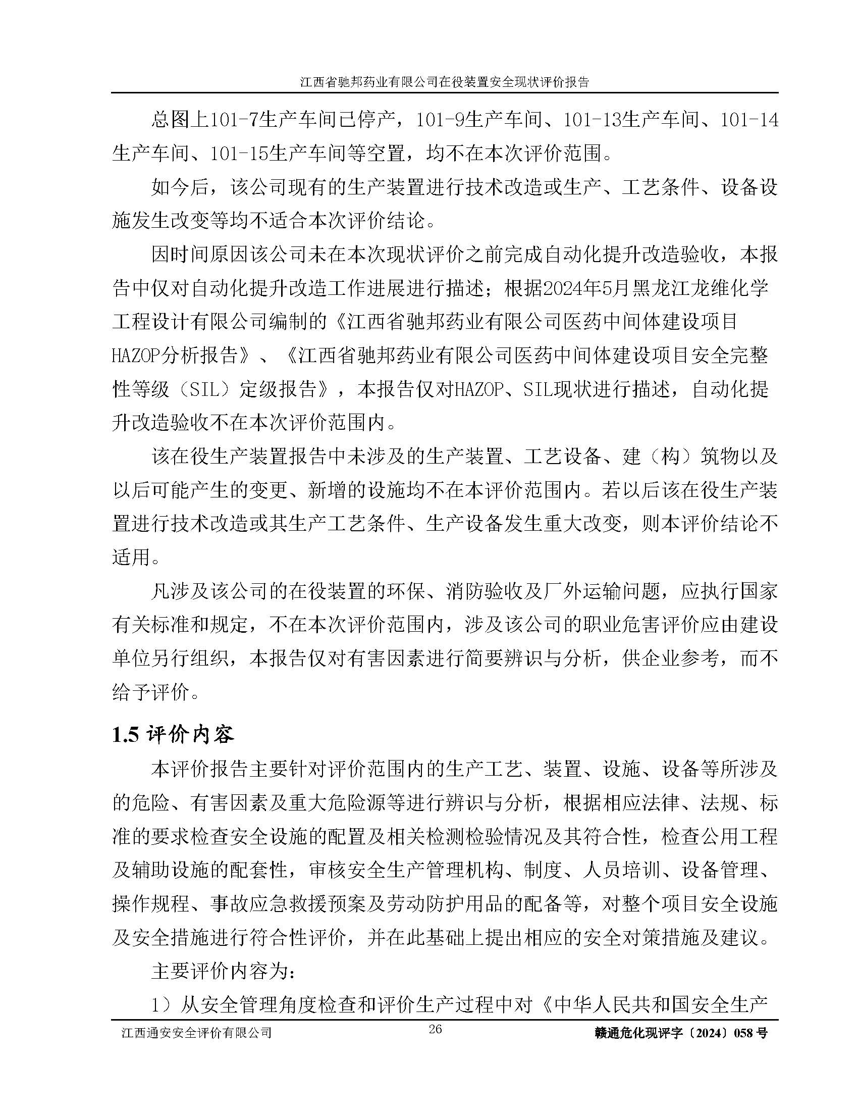 評價結論 | 評價結論:本報告認為,江西省馳邦藥業(yè)有限公司在役裝置現(xiàn)場情況與原有安全設施設計圖紙一致,PLC系統(tǒng)、SIS系統(tǒng)滿足原有安全設施設計要求且運行正常,有關從業(yè)人員資質、安全設施及安全管理符合法律、法規(guī)、標準的要求,安全風險是可以控制的,其風險程度是可以接受的,安全設施符合安全生產(chǎn)條件,能夠滿足安全生產(chǎn)的要求。 | |||