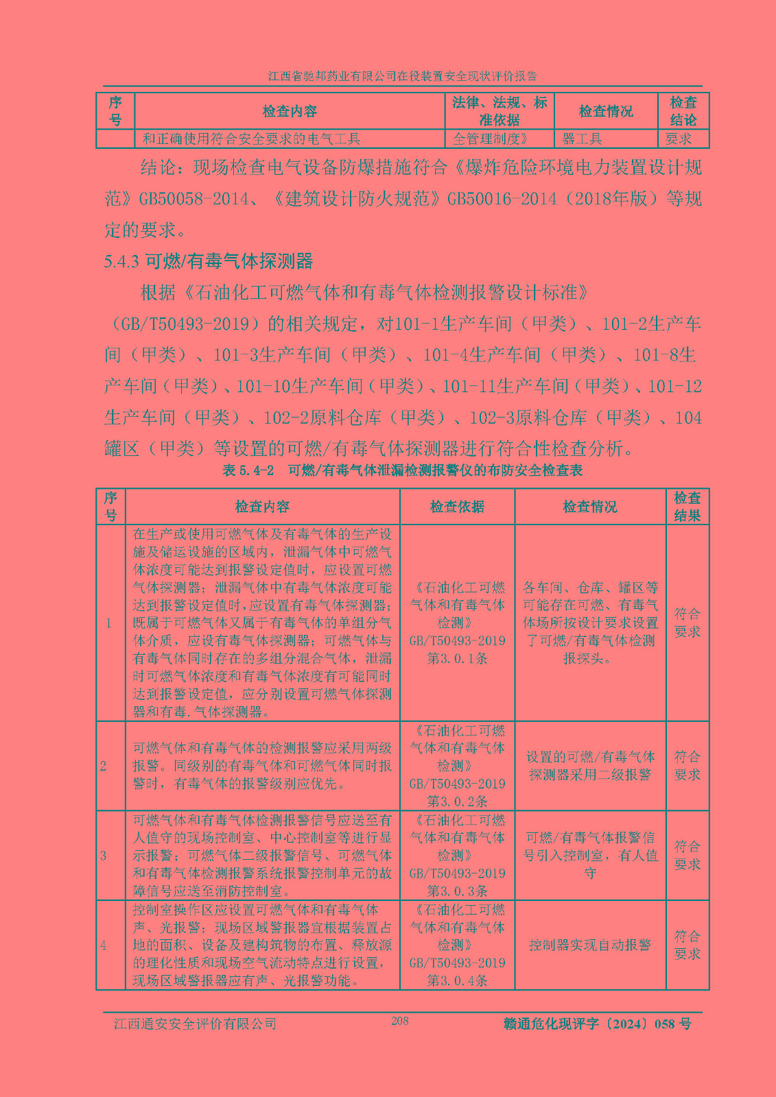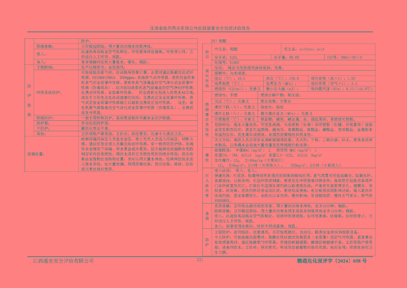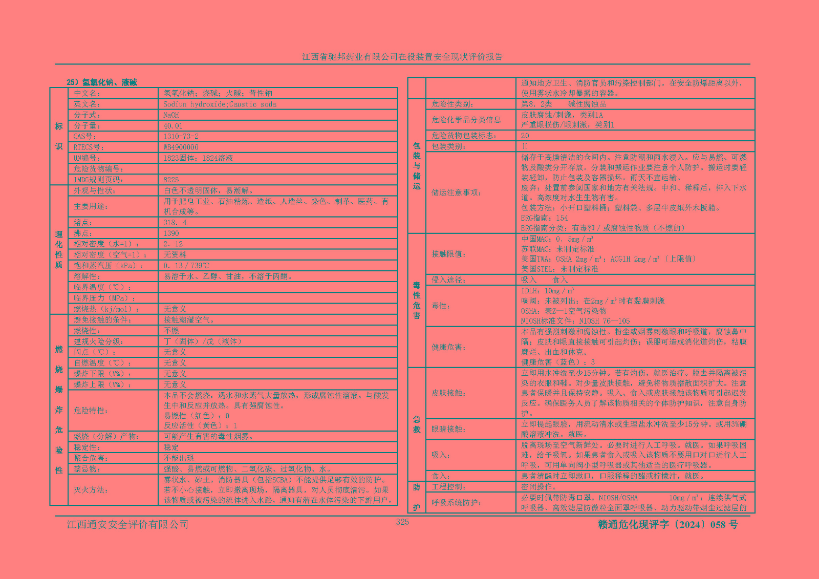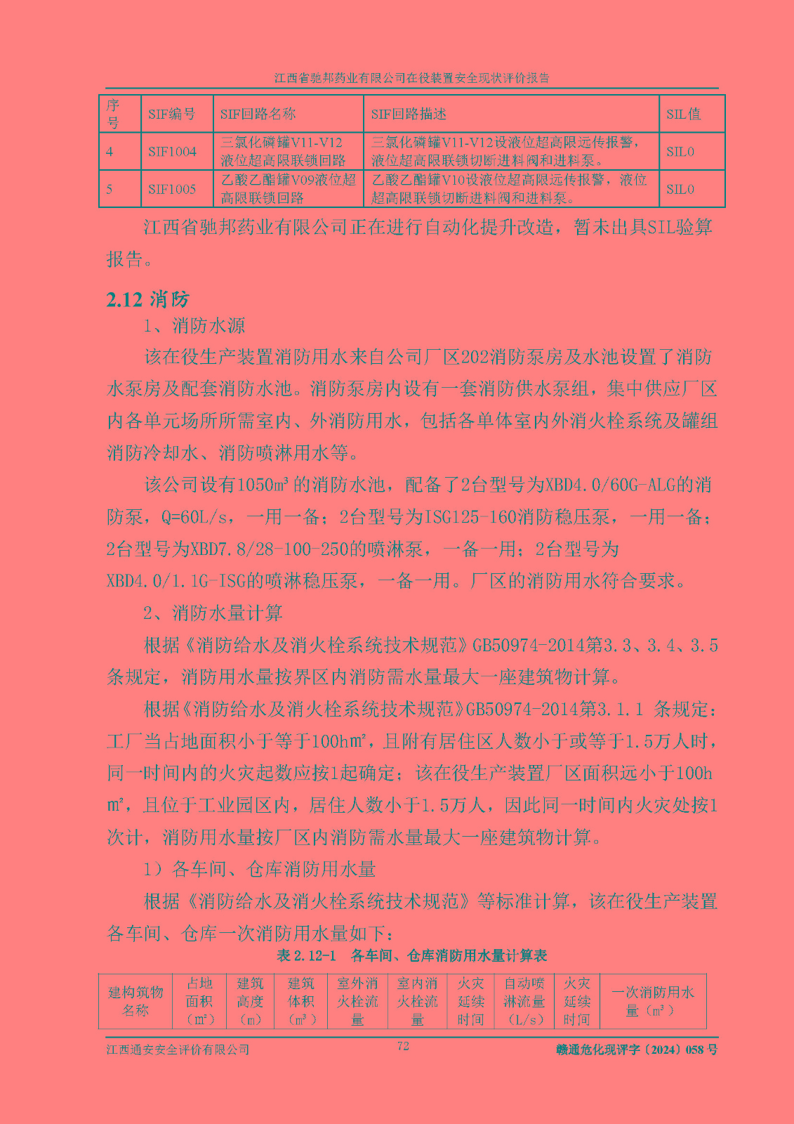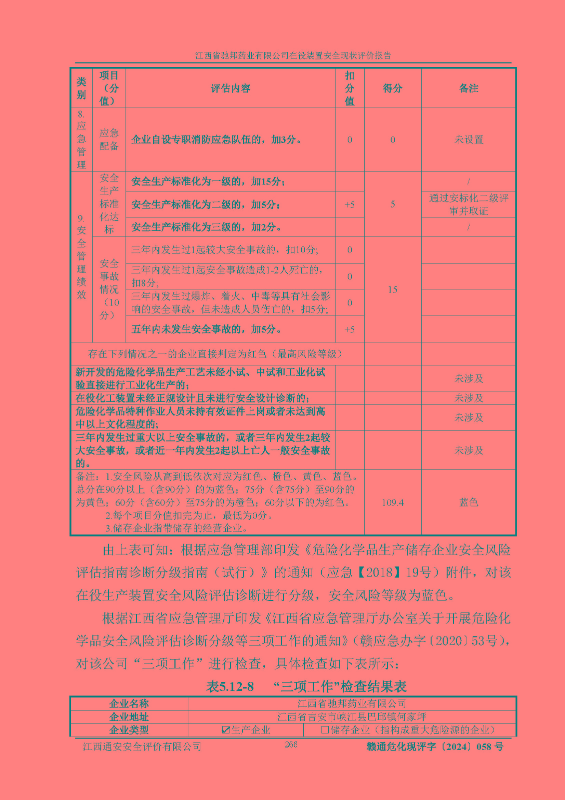 評價結論 | 評價結論:本報告認為,江西省馳邦藥業(yè)有限公司在役裝置現(xiàn)場情況與原有安全設施設計圖紙一致,PLC系統(tǒng)、SIS系統(tǒng)滿足原有安全設施設計要求且運行正常,有關從業(yè)人員資質、安全設施及安全管理符合法律、法規(guī)、標準的要求,安全風險是可以控制的,其風險程度是可以接受的,安全設施符合安全生產(chǎn)條件,能夠滿足安全生產(chǎn)的要求。 | |||