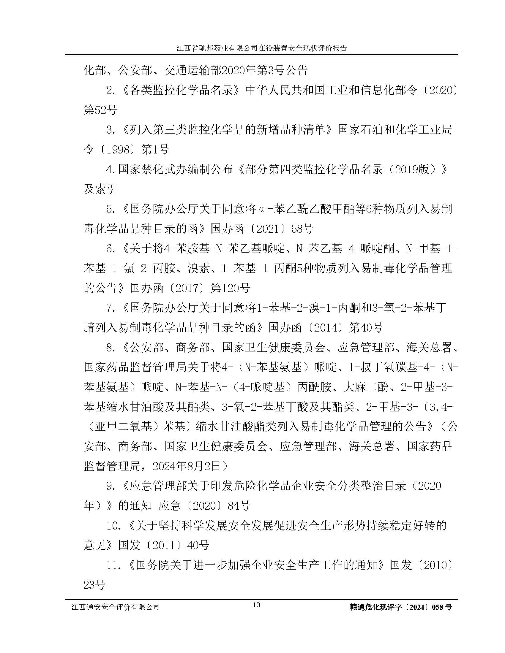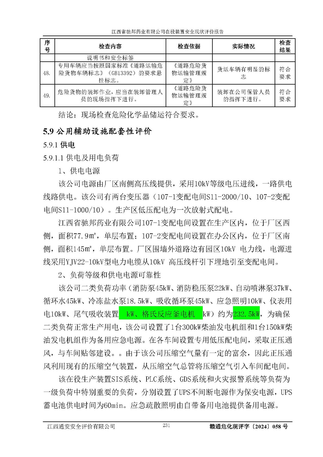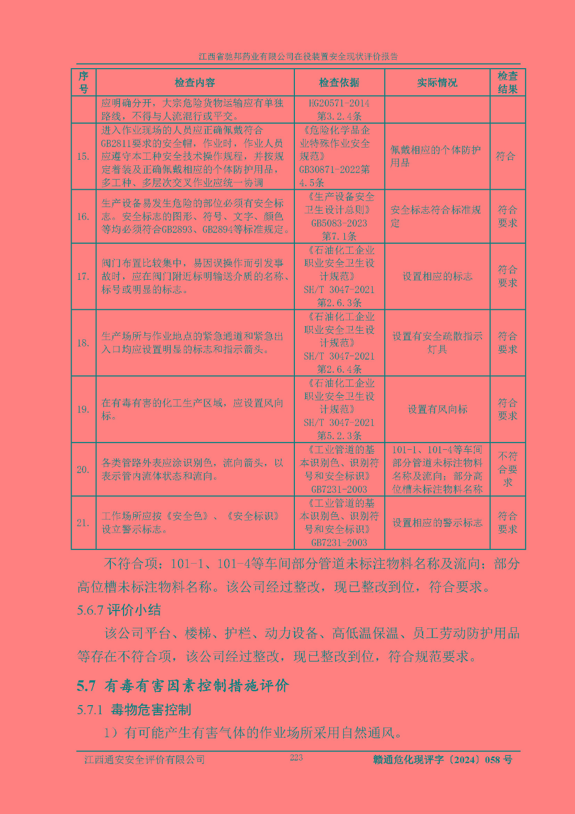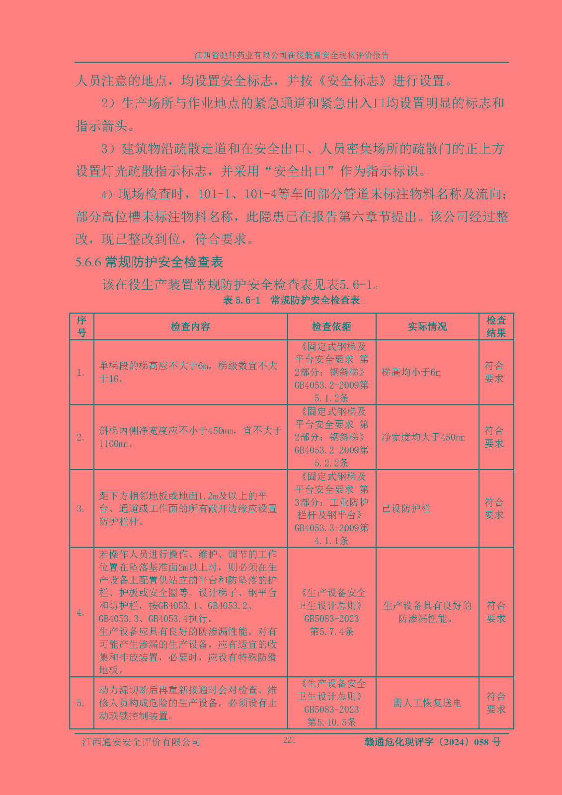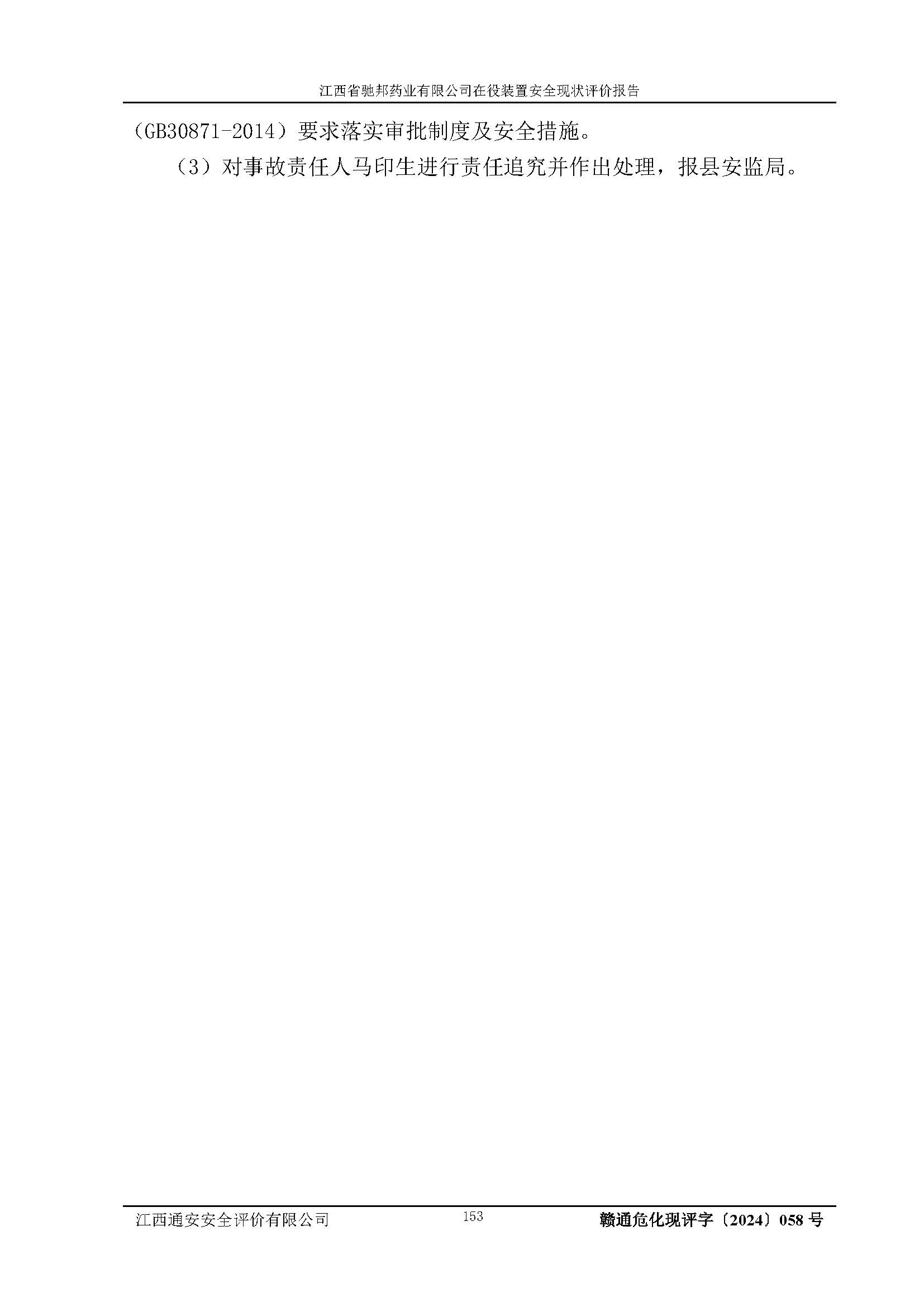 評價結論 | 評價結論:本報告認為,江西省馳邦藥業(yè)有限公司在役裝置現(xiàn)場情況與原有安全設施設計圖紙一致,PLC系統(tǒng)、SIS系統(tǒng)滿足原有安全設施設計要求且運行正常,有關從業(yè)人員資質、安全設施及安全管理符合法律、法規(guī)、標準的要求,安全風險是可以控制的,其風險程度是可以接受的,安全設施符合安全生產(chǎn)條件,能夠滿足安全生產(chǎn)的要求。 | |||