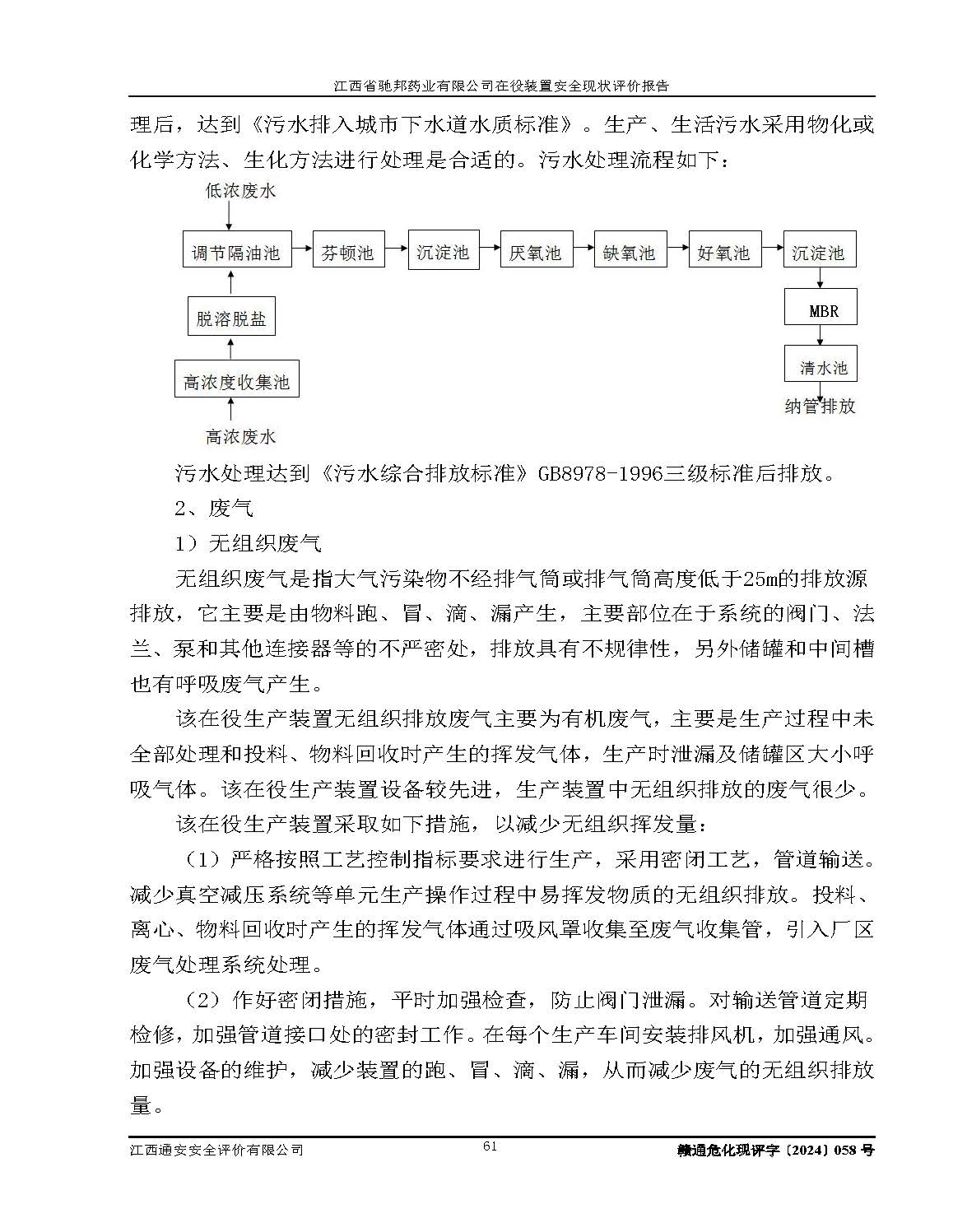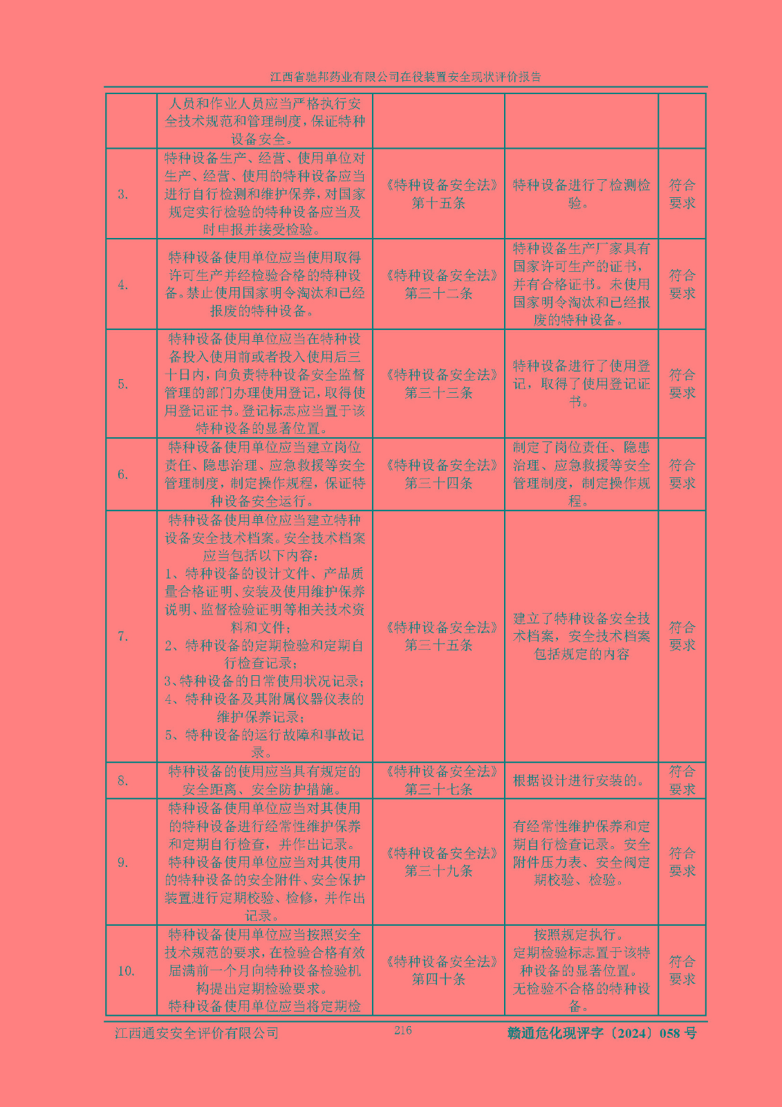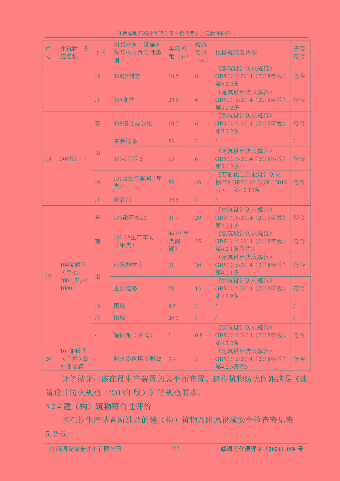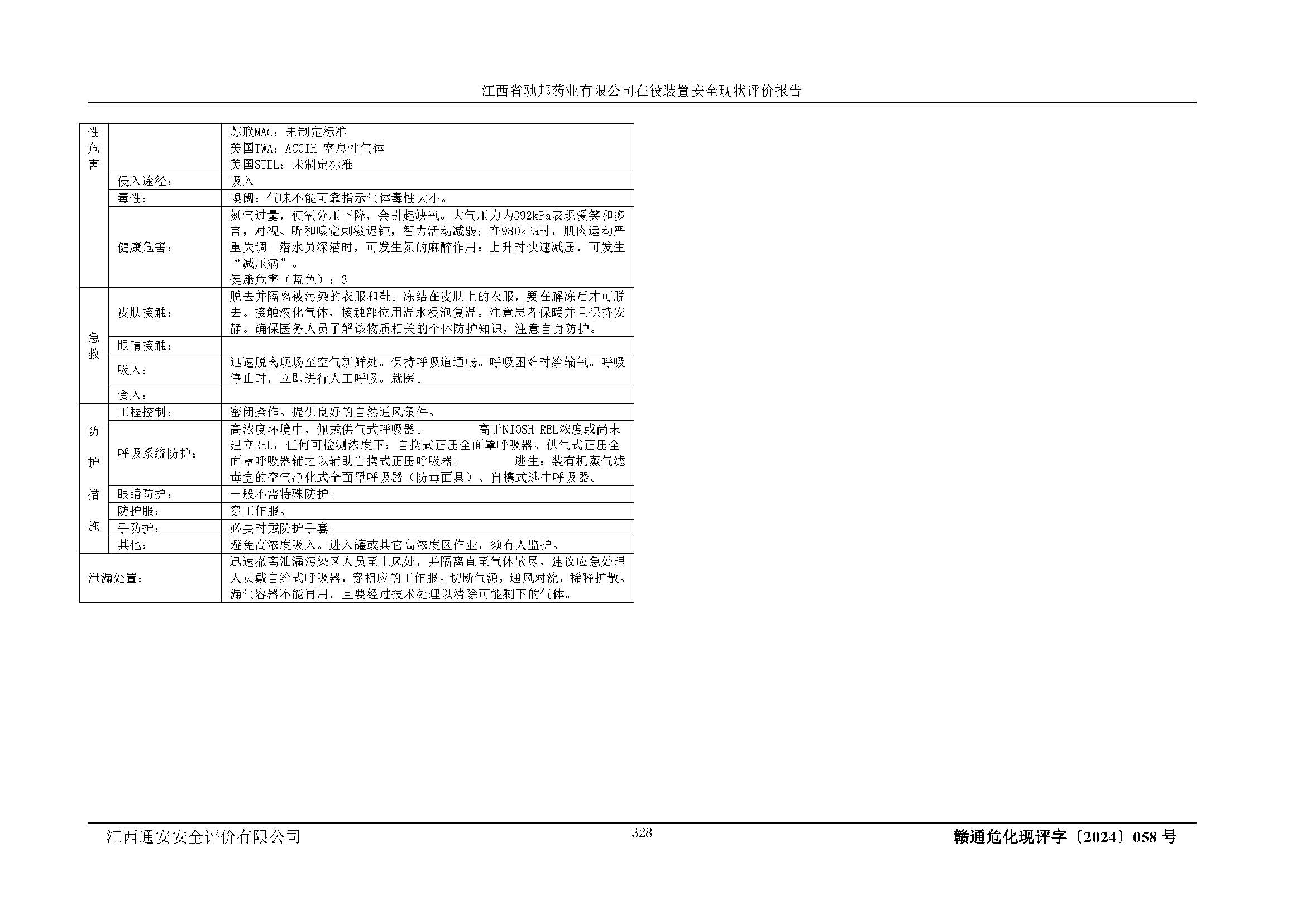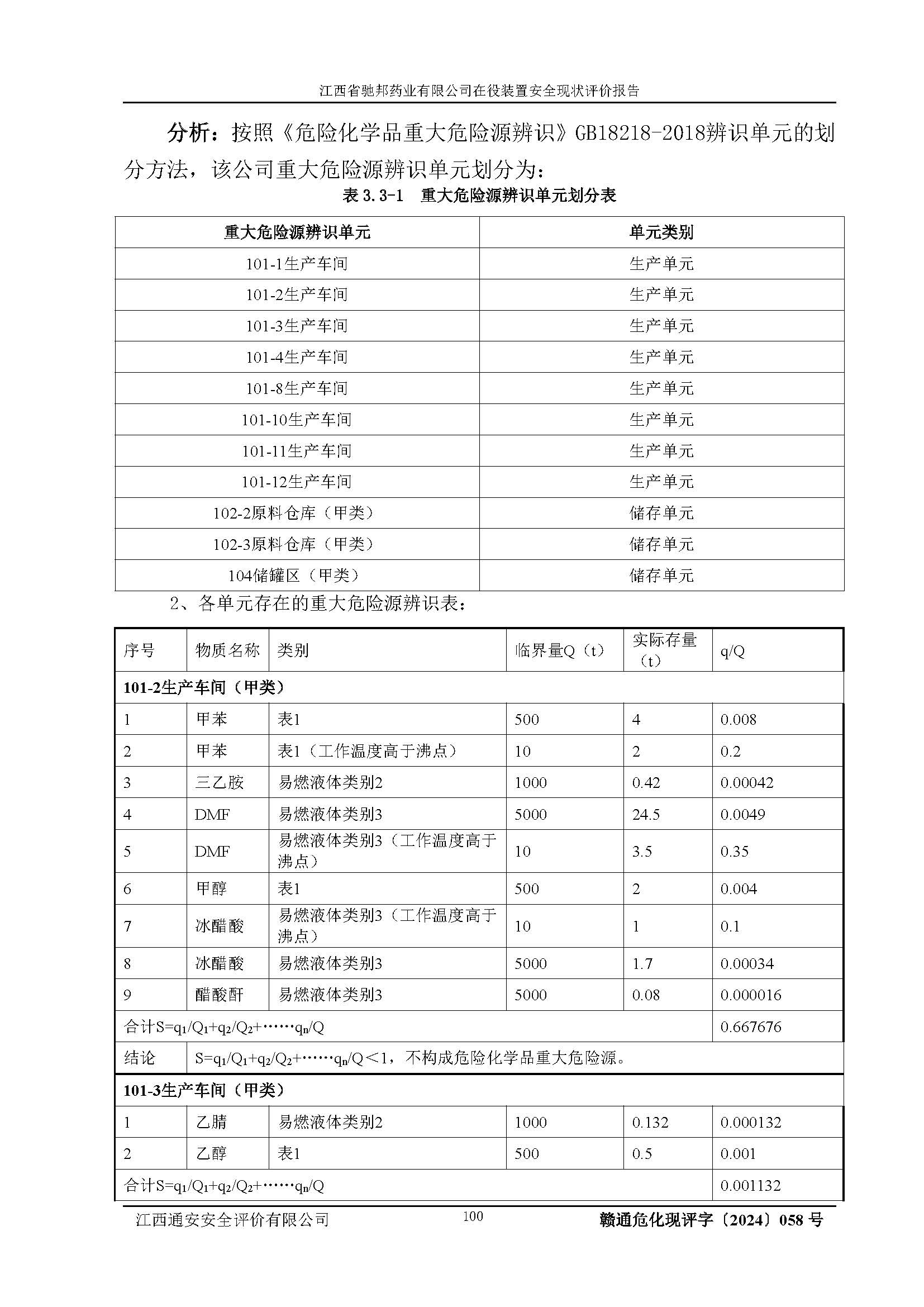 評價結論 | 評價結論:本報告認為,江西省馳邦藥業(yè)有限公司在役裝置現(xiàn)場情況與原有安全設施設計圖紙一致,PLC系統(tǒng)、SIS系統(tǒng)滿足原有安全設施設計要求且運行正常,有關從業(yè)人員資質、安全設施及安全管理符合法律、法規(guī)、標準的要求,安全風險是可以控制的,其風險程度是可以接受的,安全設施符合安全生產(chǎn)條件,能夠滿足安全生產(chǎn)的要求。 | |||