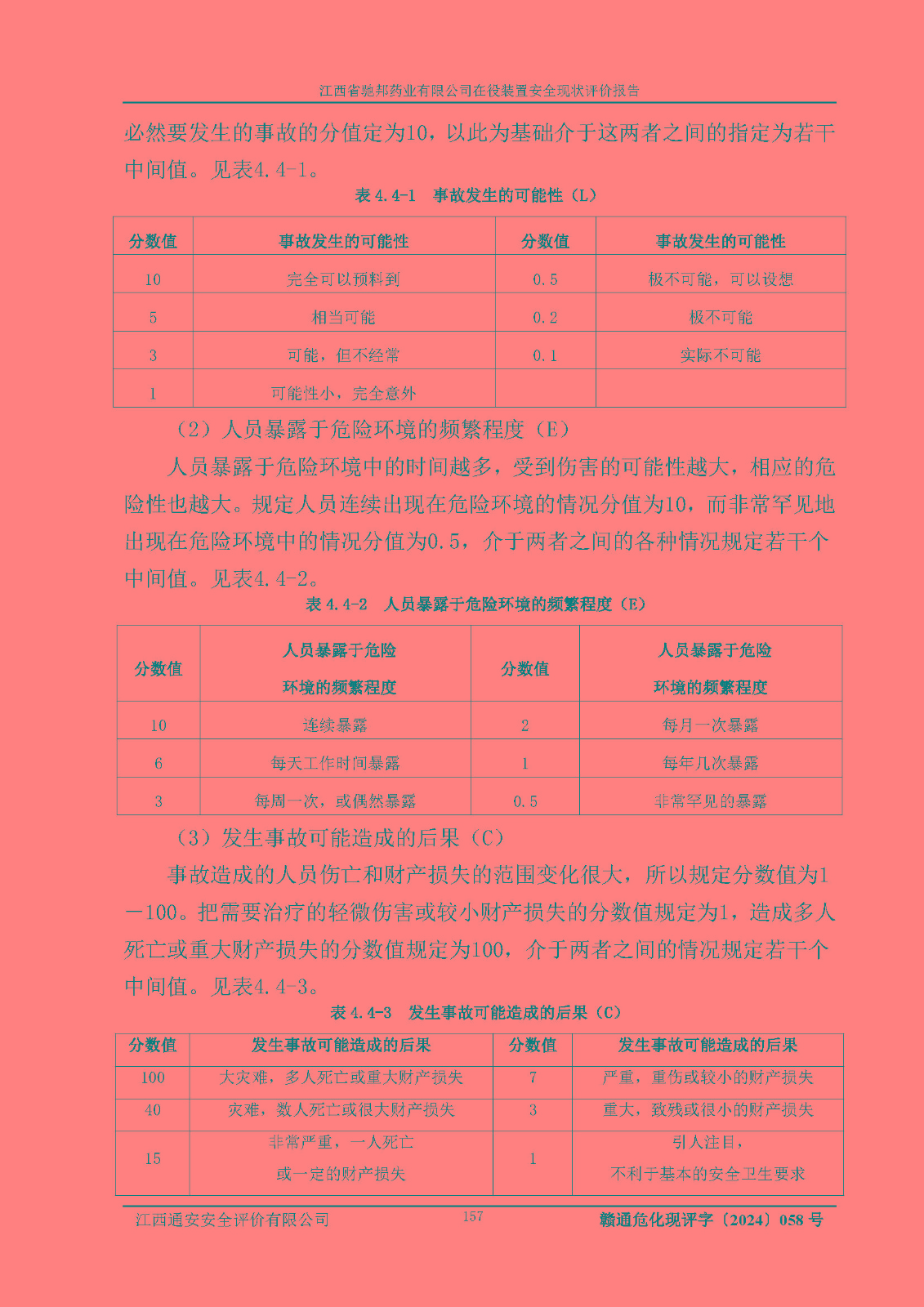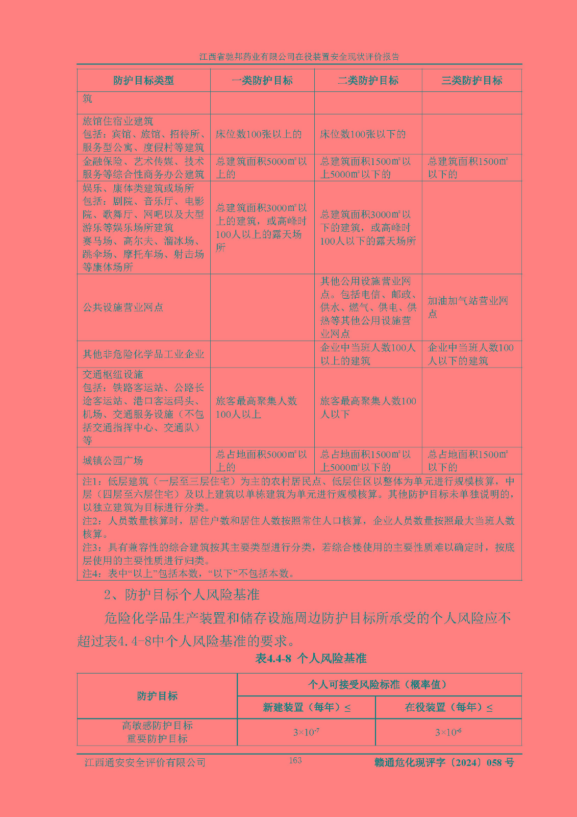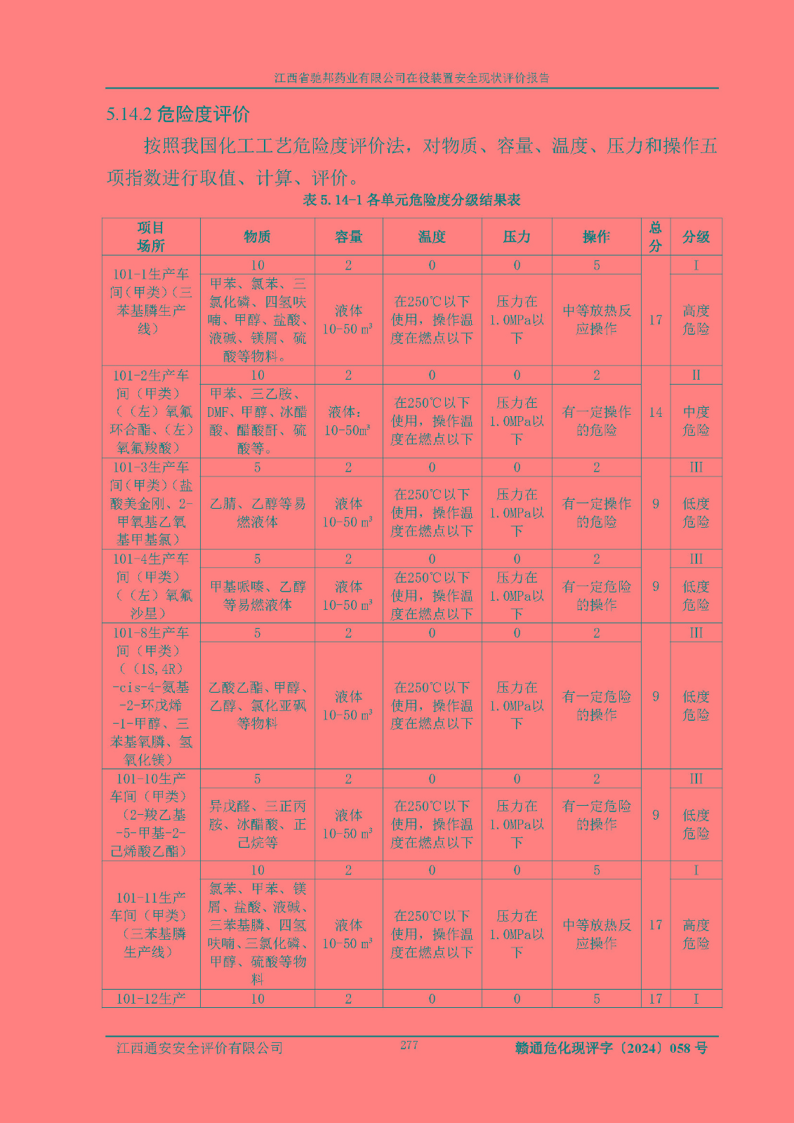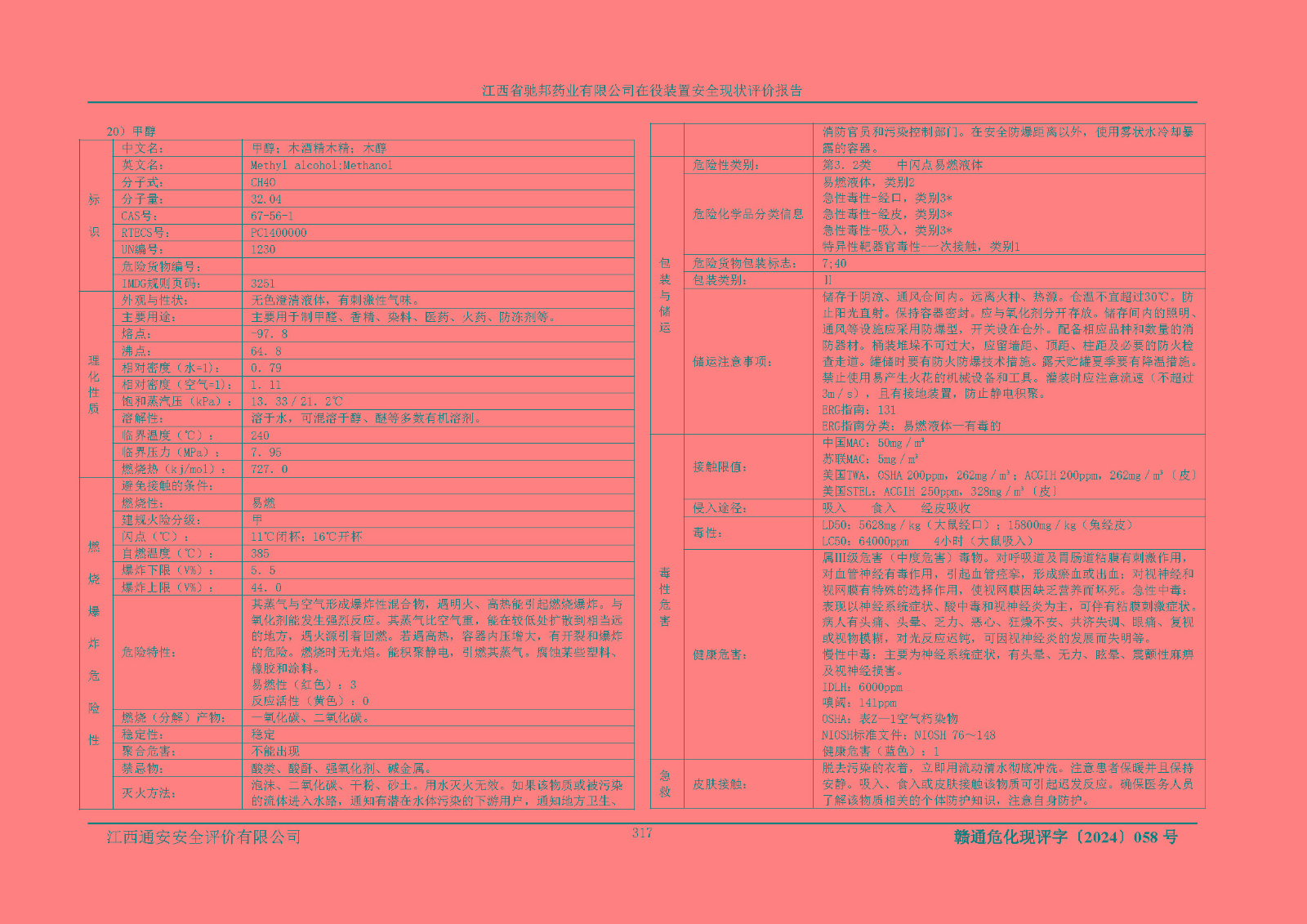 評價結論 | 評價結論:本報告認為,江西省馳邦藥業(yè)有限公司在役裝置現(xiàn)場情況與原有安全設施設計圖紙一致,PLC系統(tǒng)、SIS系統(tǒng)滿足原有安全設施設計要求且運行正常,有關從業(yè)人員資質、安全設施及安全管理符合法律、法規(guī)、標準的要求,安全風險是可以控制的,其風險程度是可以接受的,安全設施符合安全生產(chǎn)條件,能夠滿足安全生產(chǎn)的要求。 | |||