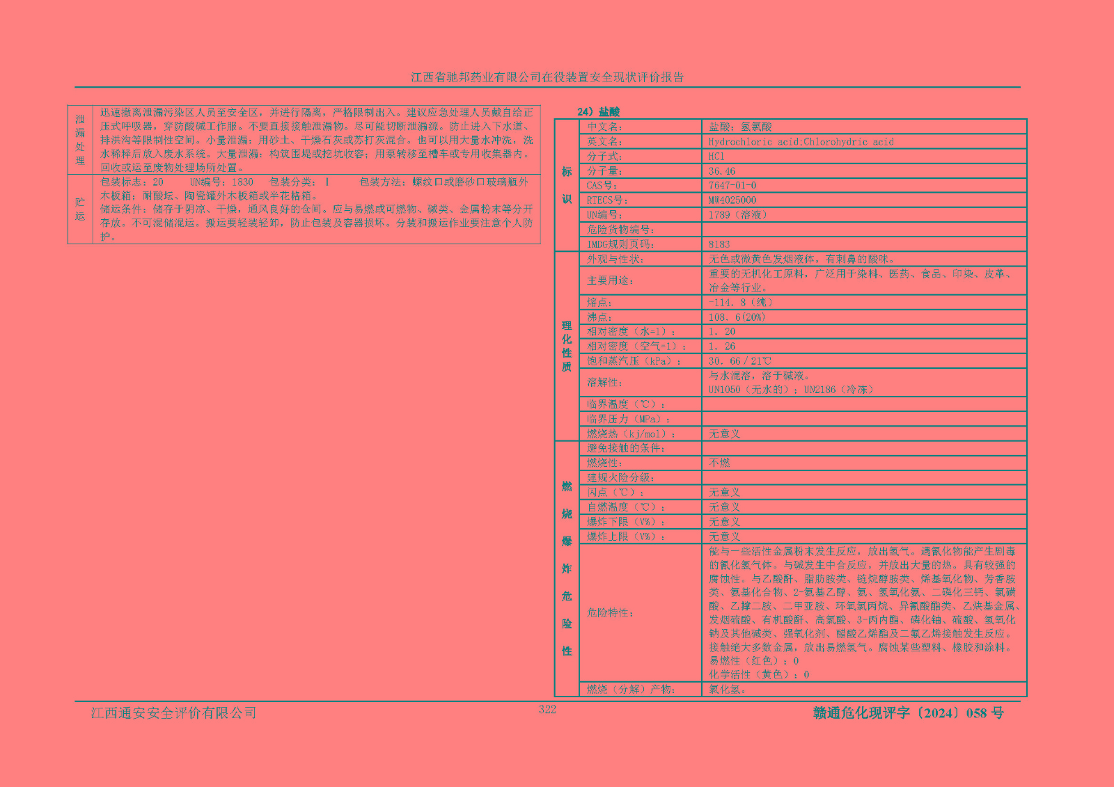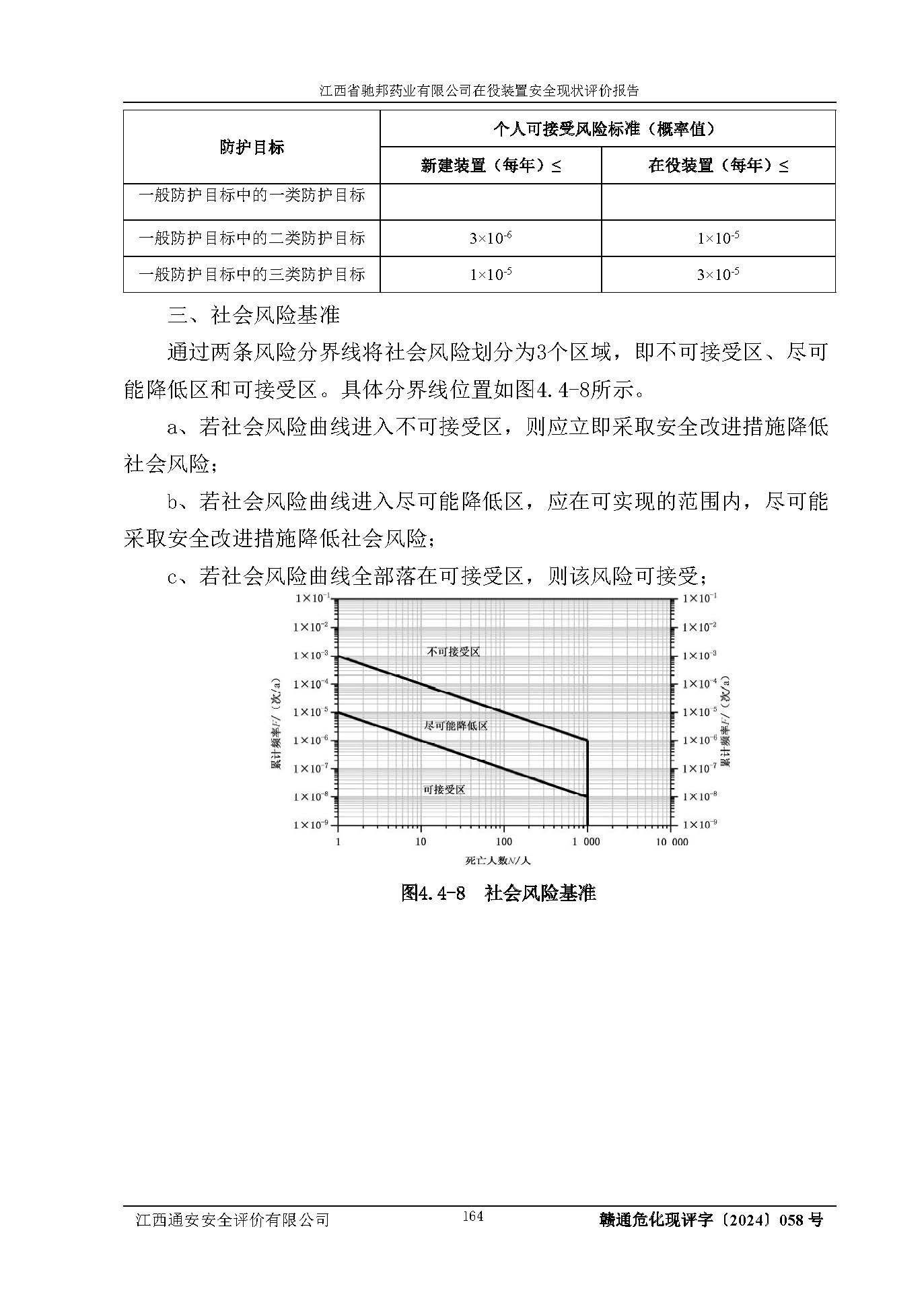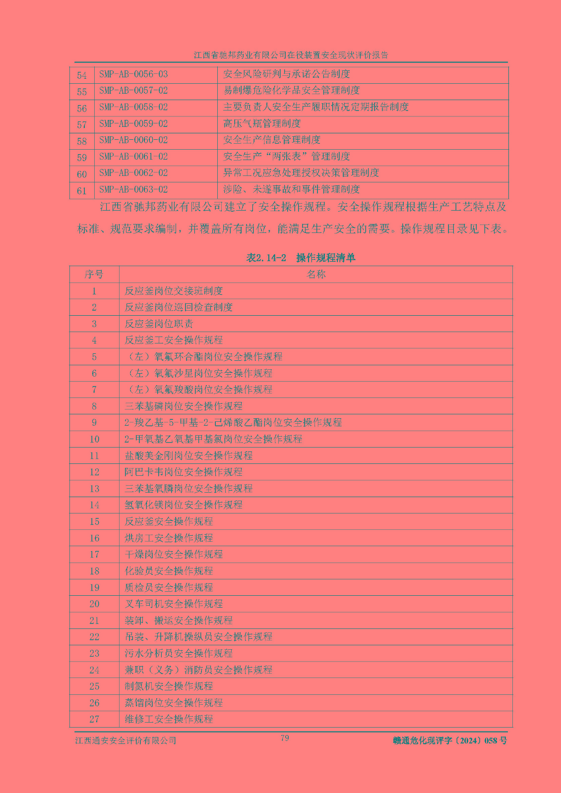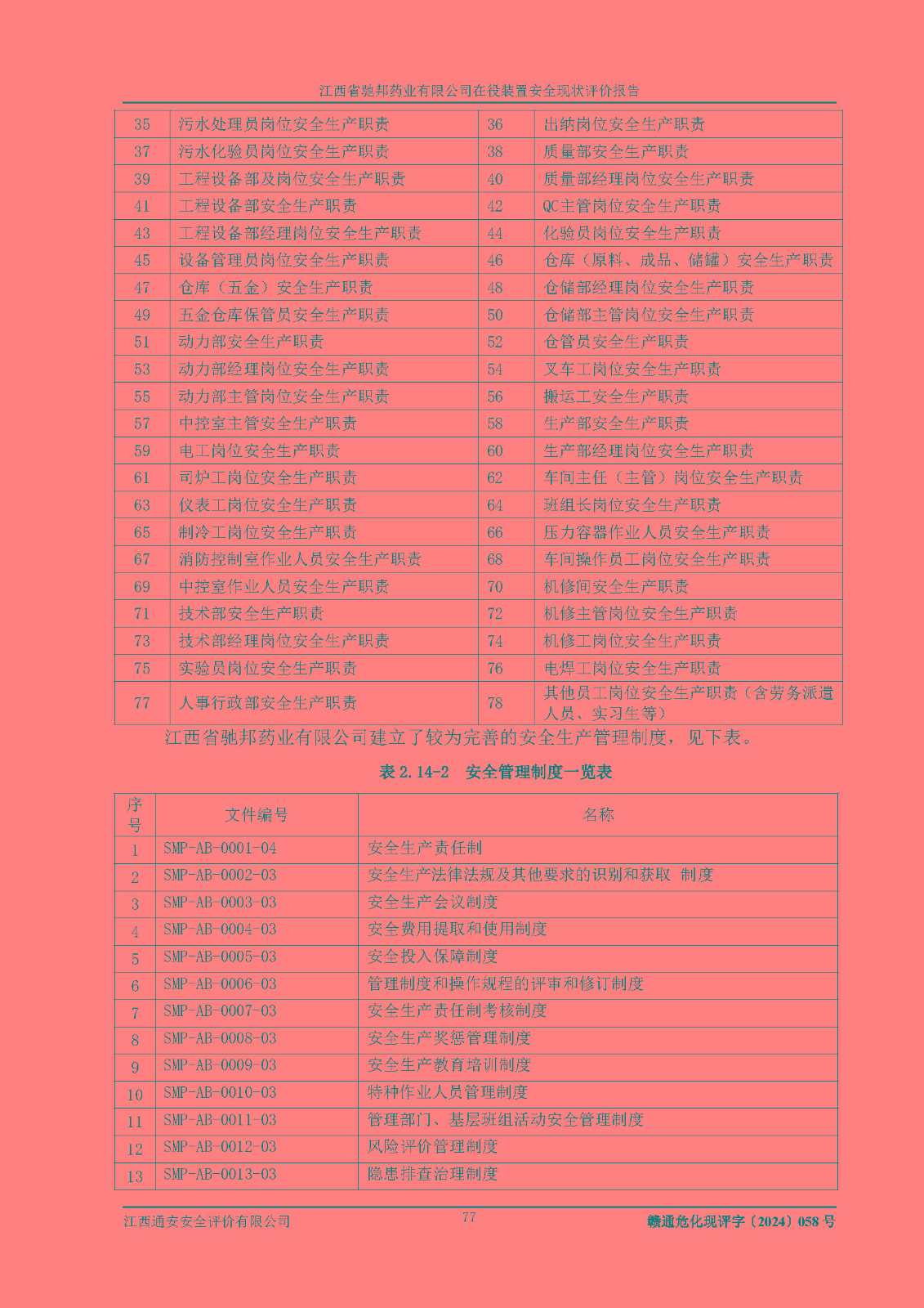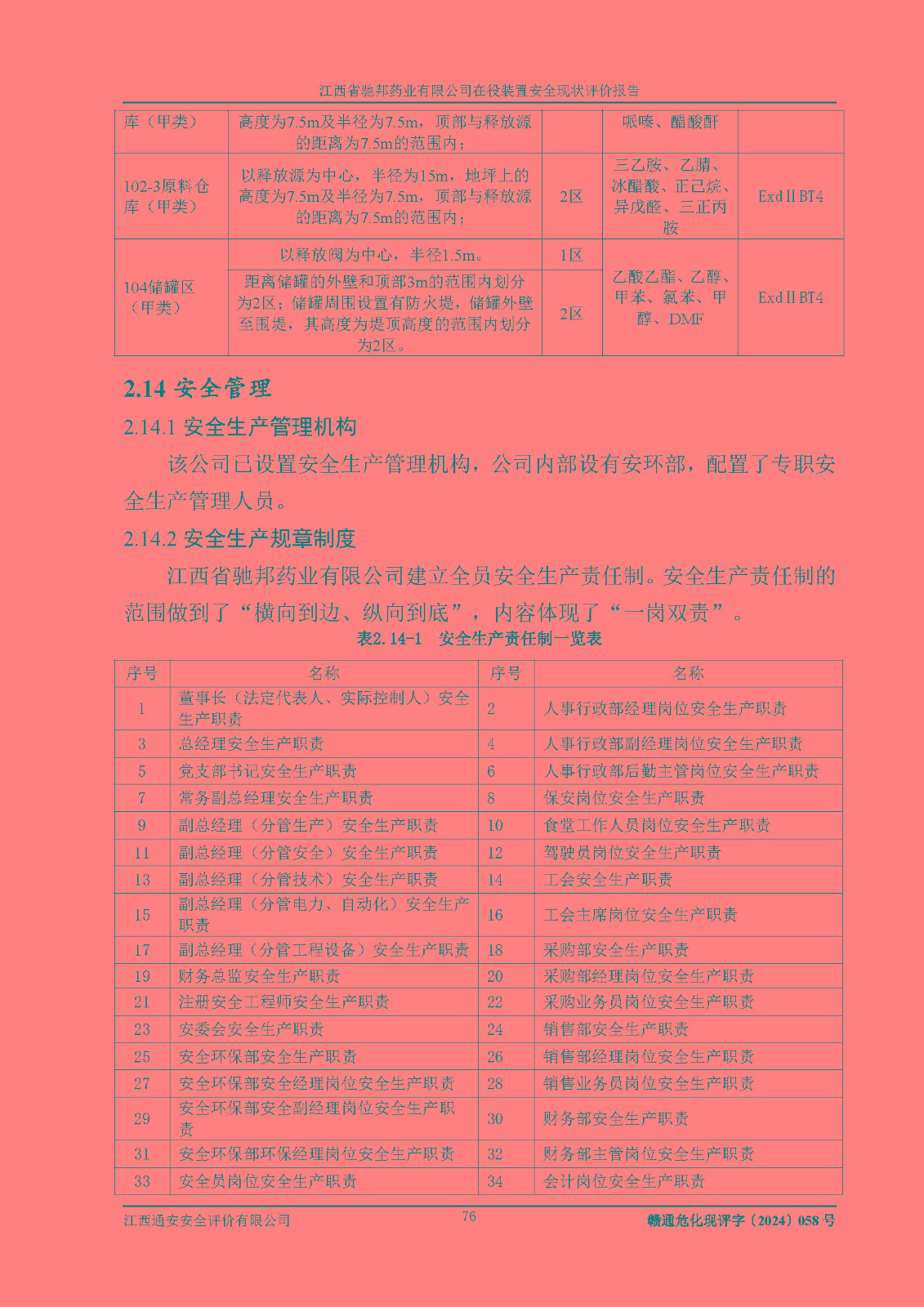 評價結論 | 評價結論:本報告認為,江西省馳邦藥業(yè)有限公司在役裝置現(xiàn)場情況與原有安全設施設計圖紙一致,PLC系統(tǒng)、SIS系統(tǒng)滿足原有安全設施設計要求且運行正常,有關從業(yè)人員資質、安全設施及安全管理符合法律、法規(guī)、標準的要求,安全風險是可以控制的,其風險程度是可以接受的,安全設施符合安全生產(chǎn)條件,能夠滿足安全生產(chǎn)的要求。 | |||