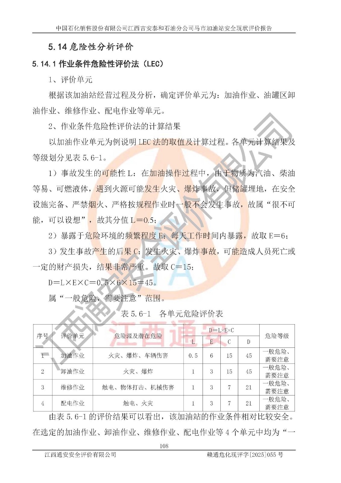 其它 | 在對(duì)該項(xiàng)目危險(xiǎn)、有害因素辨識(shí)分析的基礎(chǔ)上,運(yùn)用安全檢查表、預(yù)作業(yè)條件危險(xiǎn)性分析法、危險(xiǎn)度評(píng)價(jià)、重大事故后果分析結(jié)果等評(píng)價(jià)方法對(duì)該項(xiàng)目進(jìn)行了分析評(píng)價(jià),評(píng)價(jià)結(jié)果如下: 1、該項(xiàng)目位于江西省吉安市泰和縣馬市圩鎮(zhèn),符合當(dāng)?shù)匾?guī)劃,與周邊環(huán)境的距離符合有關(guān)標(biāo)準(zhǔn)、規(guī)范的要求。 2、總圖布置分區(qū)明確,布局合理,各建構(gòu)筑物的防火間距滿(mǎn)足規(guī)范要求。 3、該項(xiàng)目無(wú)**明令淘汰的工藝,設(shè)備、設(shè)施與工藝條件、內(nèi)部介質(zhì)相適應(yīng),特種設(shè)備及設(shè)施較齊全,按規(guī)定設(shè)置防雷、防靜電接地,爆炸危險(xiǎn)環(huán)境加油機(jī)按要求采用防爆型,符合相關(guān)標(biāo)準(zhǔn)規(guī)范要求。 5、企業(yè)設(shè)置了安全生產(chǎn)管理機(jī)構(gòu),配備了專(zhuān)職安全生產(chǎn)管理人員,建立了安全生產(chǎn)責(zé)任制和安全生產(chǎn)管理制度,編制了崗位操作規(guī)程,編制了生產(chǎn)安全事故應(yīng)急預(yù)案,人員經(jīng)過(guò)相應(yīng)的培訓(xùn),企業(yè)的安全生產(chǎn)管理正常。 6、作業(yè)條件危險(xiǎn)性評(píng)價(jià)結(jié)果:在選定的評(píng)價(jià)單元中,作業(yè)危險(xiǎn)程度均為“一般危險(xiǎn),需要注意”,作業(yè)條件相對(duì)安全。 7、危險(xiǎn)度評(píng)價(jià)結(jié)果:汽油儲(chǔ)罐的危險(xiǎn)程度為中度危險(xiǎn)。油罐采用雙層罐埋地設(shè)置,按要求設(shè)置了通氣管,并裝設(shè)了阻火器;設(shè)置了液位監(jiān)測(cè)報(bào)警系統(tǒng)和緊急切斷系統(tǒng),設(shè)置加油雙層管道及雙層管道滲漏檢測(cè)系統(tǒng),其安全風(fēng)險(xiǎn)可控。 評(píng)價(jià)結(jié)論: 中國(guó)石化銷(xiāo)售股份有限公司江西吉安泰和石油分公司馬市加油站工藝設(shè)備和安全設(shè)施運(yùn)行正常,安全管理機(jī)制運(yùn)行正常,安全設(shè)施、措施達(dá)到設(shè)計(jì)要求和預(yù)期結(jié)果,可以滿(mǎn)足建設(shè)項(xiàng)目安全生產(chǎn)的要求,安全生產(chǎn)管理**,項(xiàng)目具備危險(xiǎn)化學(xué)品經(jīng)營(yíng)單位安全經(jīng)營(yíng)條件的要求。 | ||||
