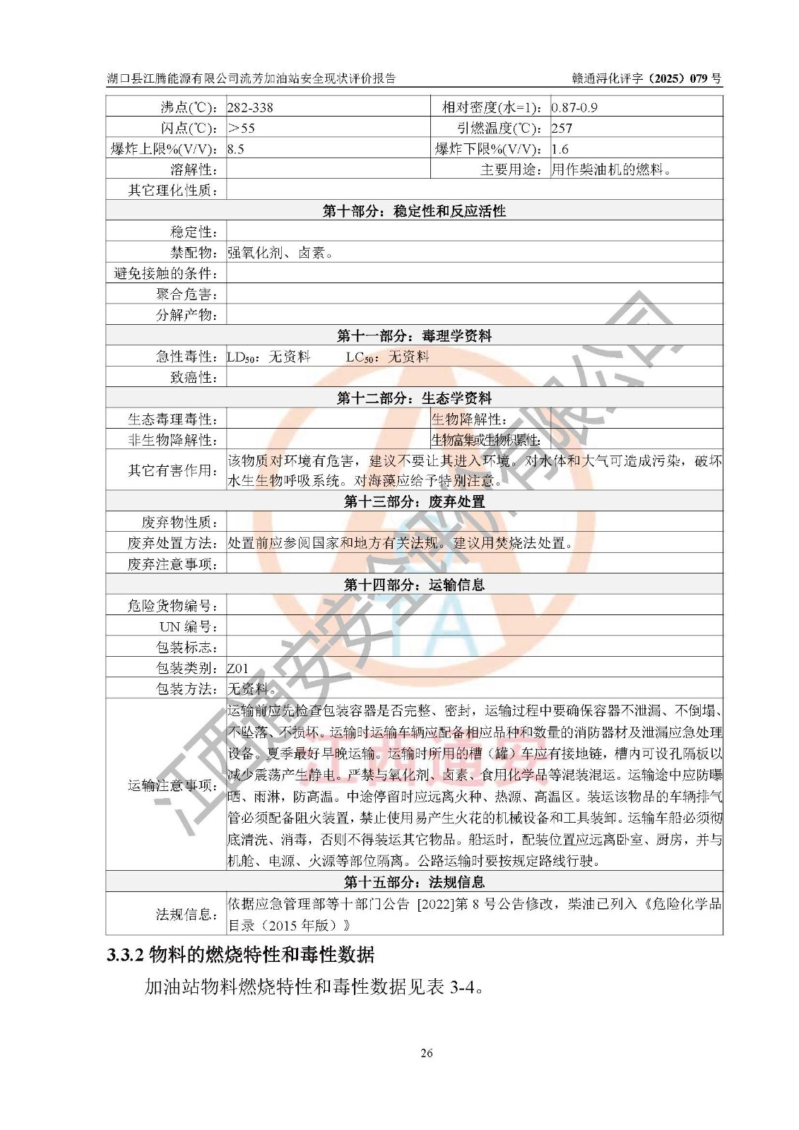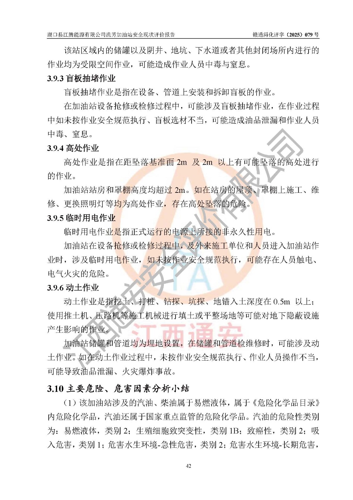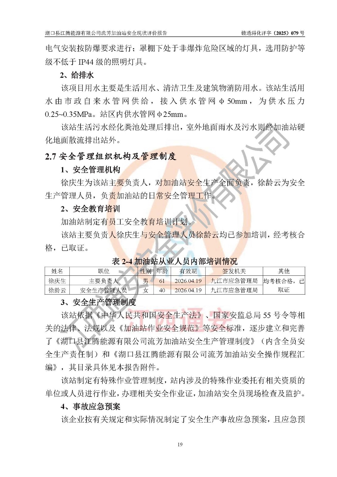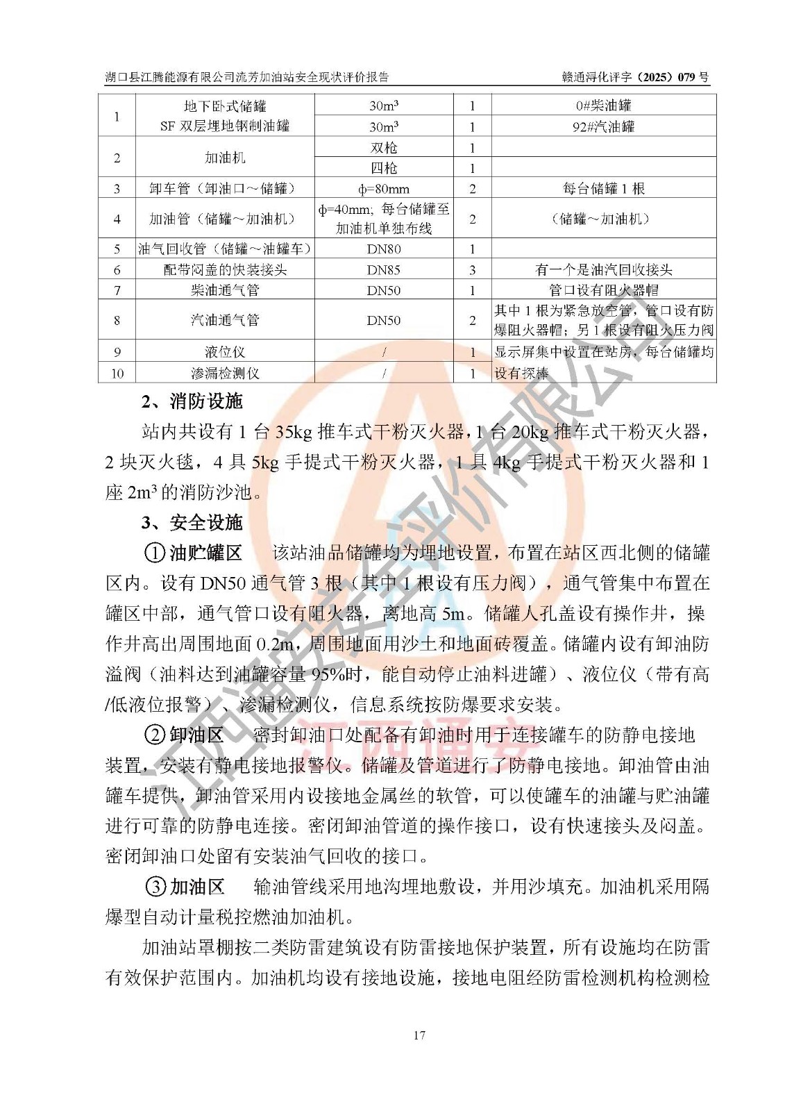 項(xiàng)目簡(jiǎn)介 | 湖口縣江騰能源有限公司流芳加油站是一家專(zhuān)門(mén)從事成品油零售經(jīng)營(yíng)的有限責(zé)任公司分公司(自然人投資或控股),經(jīng)營(yíng)場(chǎng)所位于江西省九江市湖口縣流芳鄉(xiāng)流芳村少家灣上嶺東北側(cè)。現(xiàn)有從業(yè)人員3名,其中安全管理人員1人,加油站負(fù)責(zé)人徐慶生。 該加油站占地面積約618.47m2,站區(qū)內(nèi)設(shè)置有1臺(tái)雙槍和1臺(tái)四槍程控燃油加油機(jī)及配套的工藝管線、設(shè)有SF雙層儲(chǔ)罐2臺(tái),其中30m3的0#柴油儲(chǔ)罐1臺(tái)、30m3的92#汽油儲(chǔ)罐1臺(tái),油品儲(chǔ)罐總?cè)莘e為60m3(折算成汽油為45m3),按現(xiàn)行《汽車(chē)加油加氣加氫站技術(shù)標(biāo)準(zhǔn)》對(duì)加油站的等級(jí)劃分原則,屬三級(jí)加油站。 該站由九江市行政審批局換發(fā)《危險(xiǎn)化學(xué)品經(jīng)營(yíng)許可證》(證號(hào):36040013202500148),**期限2022年12月24日至2025年12月23日。 | |||